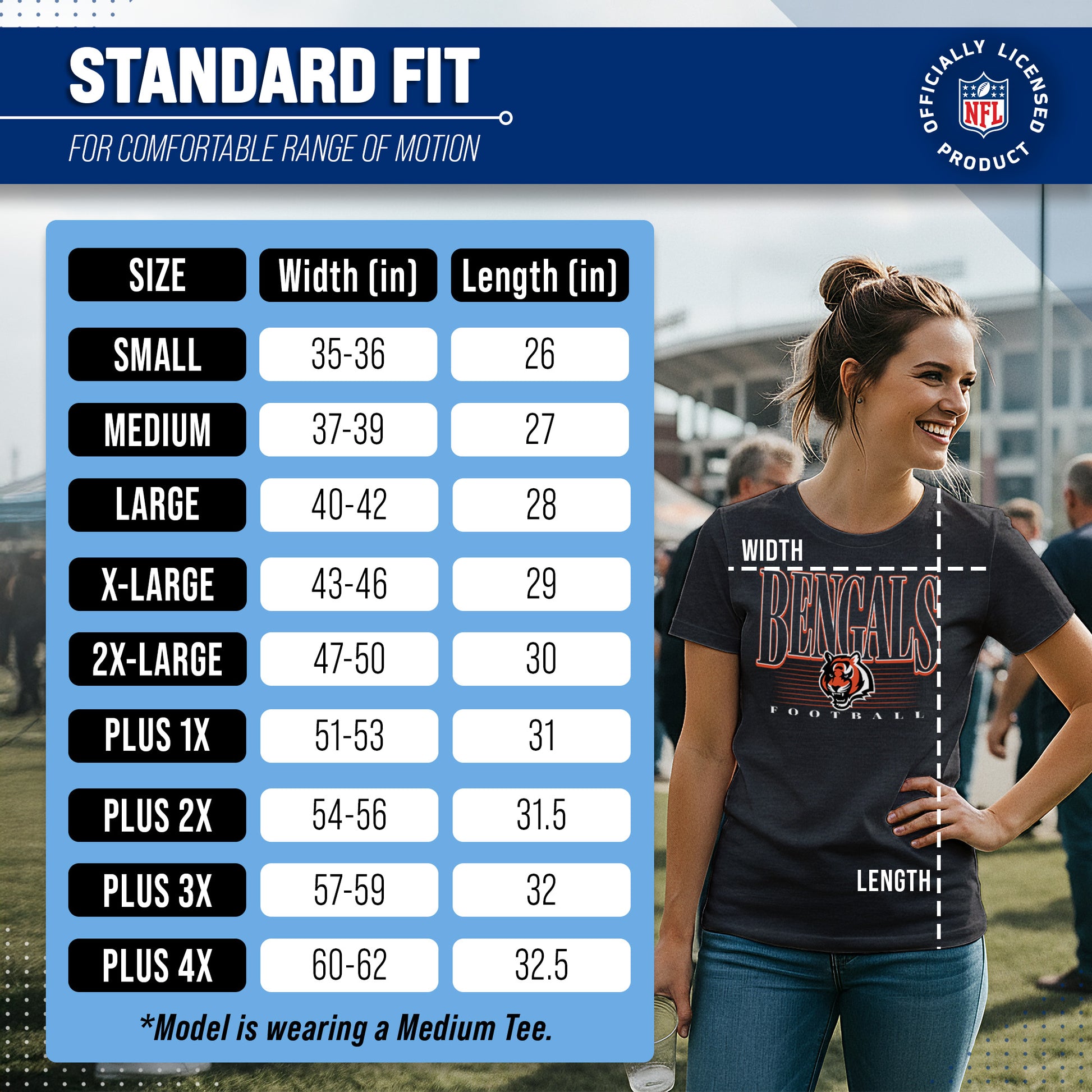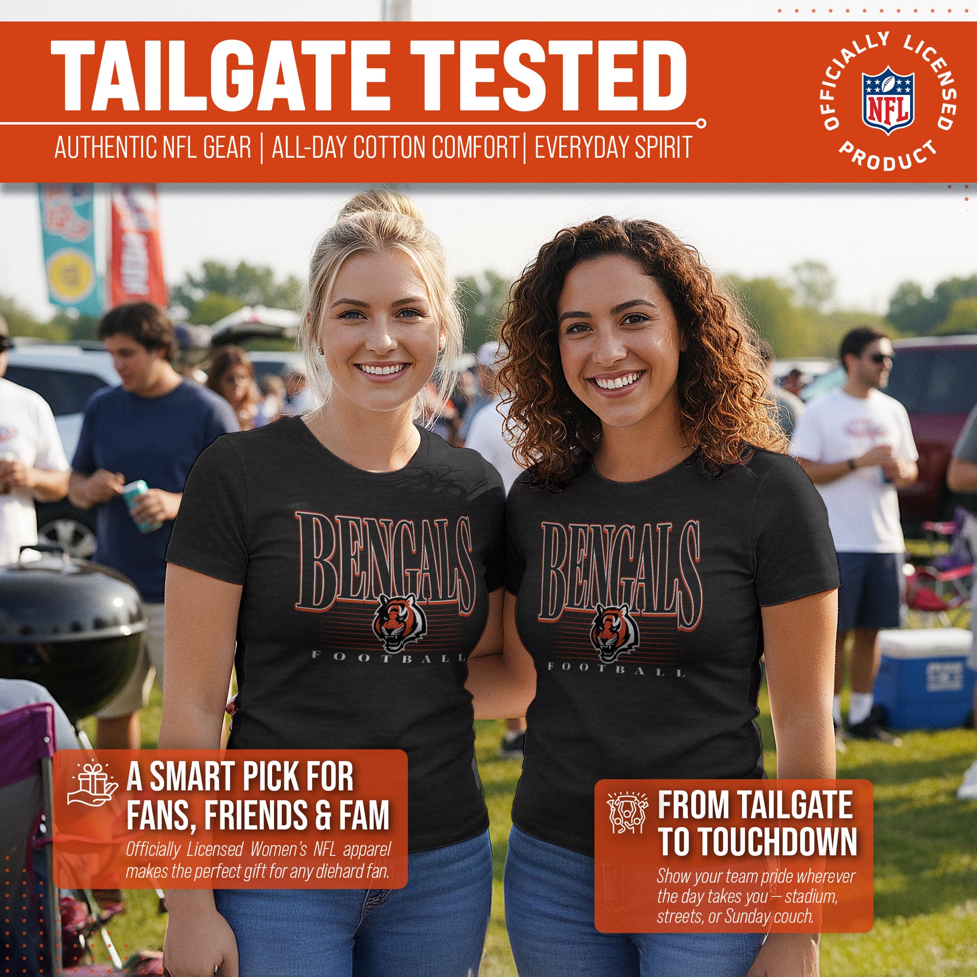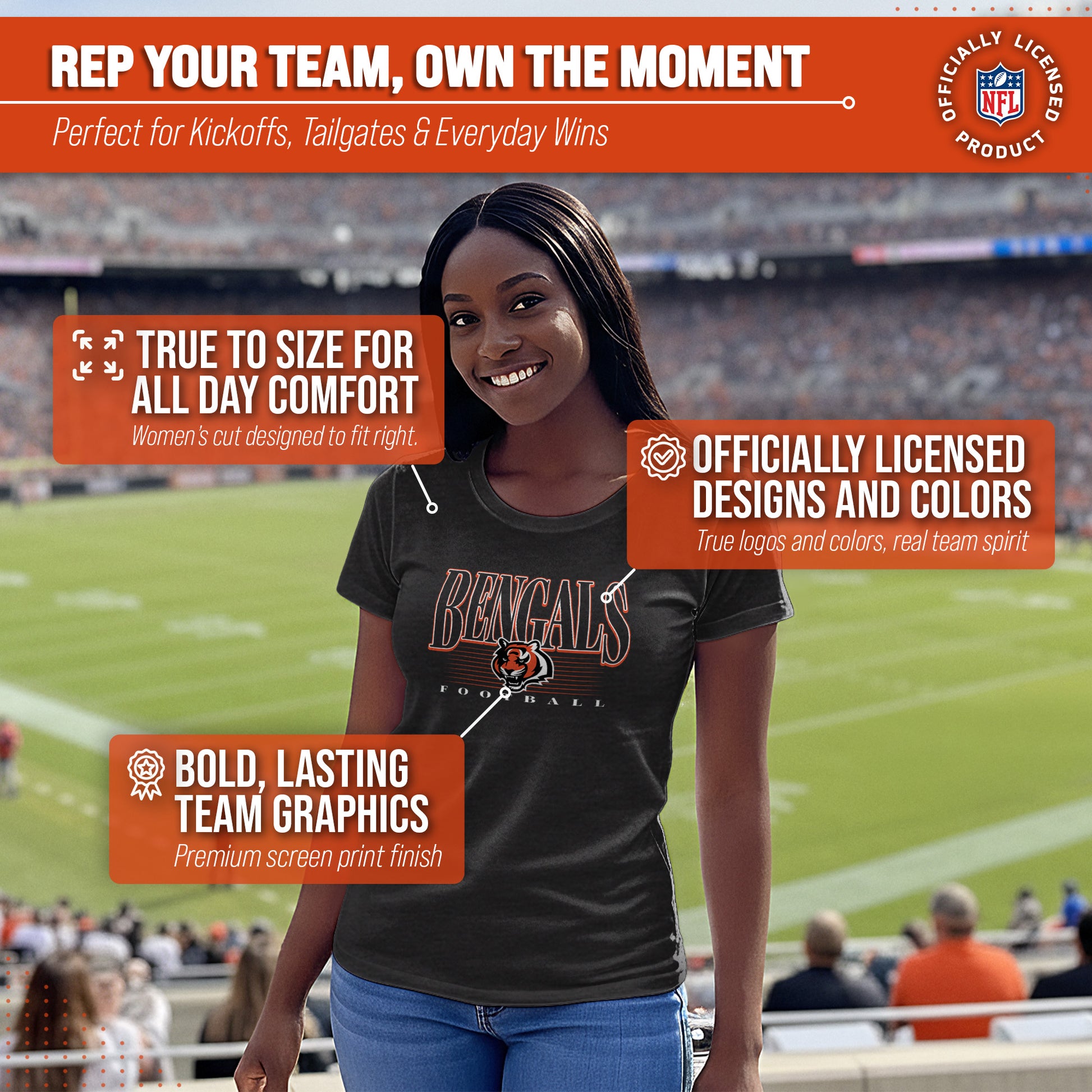 Calling all ladies! Get ready to rock game day with the Women's Team Fan Apparel Overtime Blueprint T-Shirt! This comfortable and stylish Cincinnati Bengals womens tee is perfect for any female football fan, whether you're cheering on your favorite team at the stadium or watching from home. Made from a super soft cotton fabric , this shirt will keep you cool and comfortable all game long.  The text, logo and official team color adds a touch of retro flair, while the tag-less design ensures itch-free wear. Whether you're a die-hard fan or just love a good classic look, this shirt is perfect for showing off your team spirit. Available in a wide range of women's sizes, it's suitable for all shapes and sizes!  So grab your girlfriends and get ready to cheer on your team in style with the Women's Team Fan Apparel Overtime Blueprint T-Shirt!
