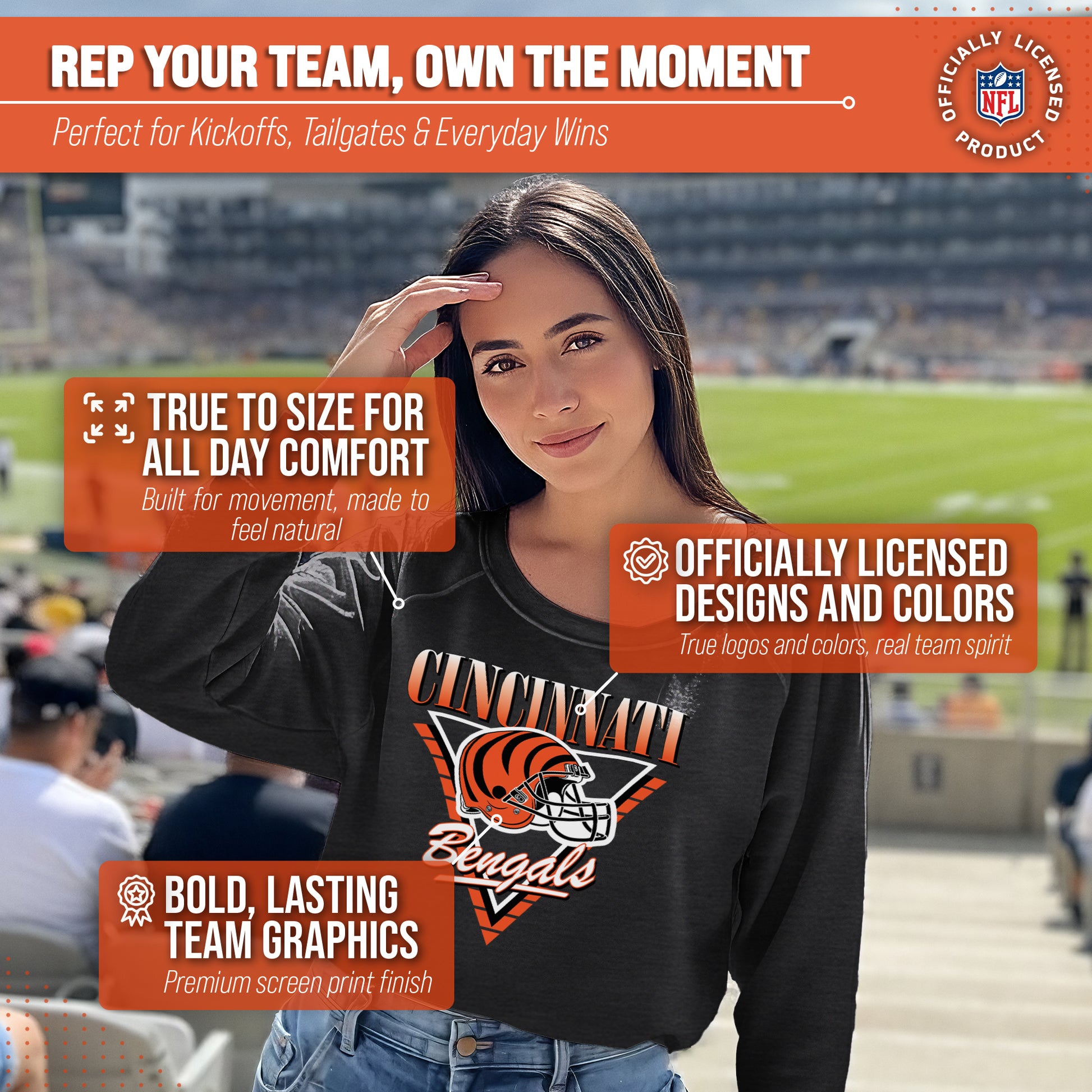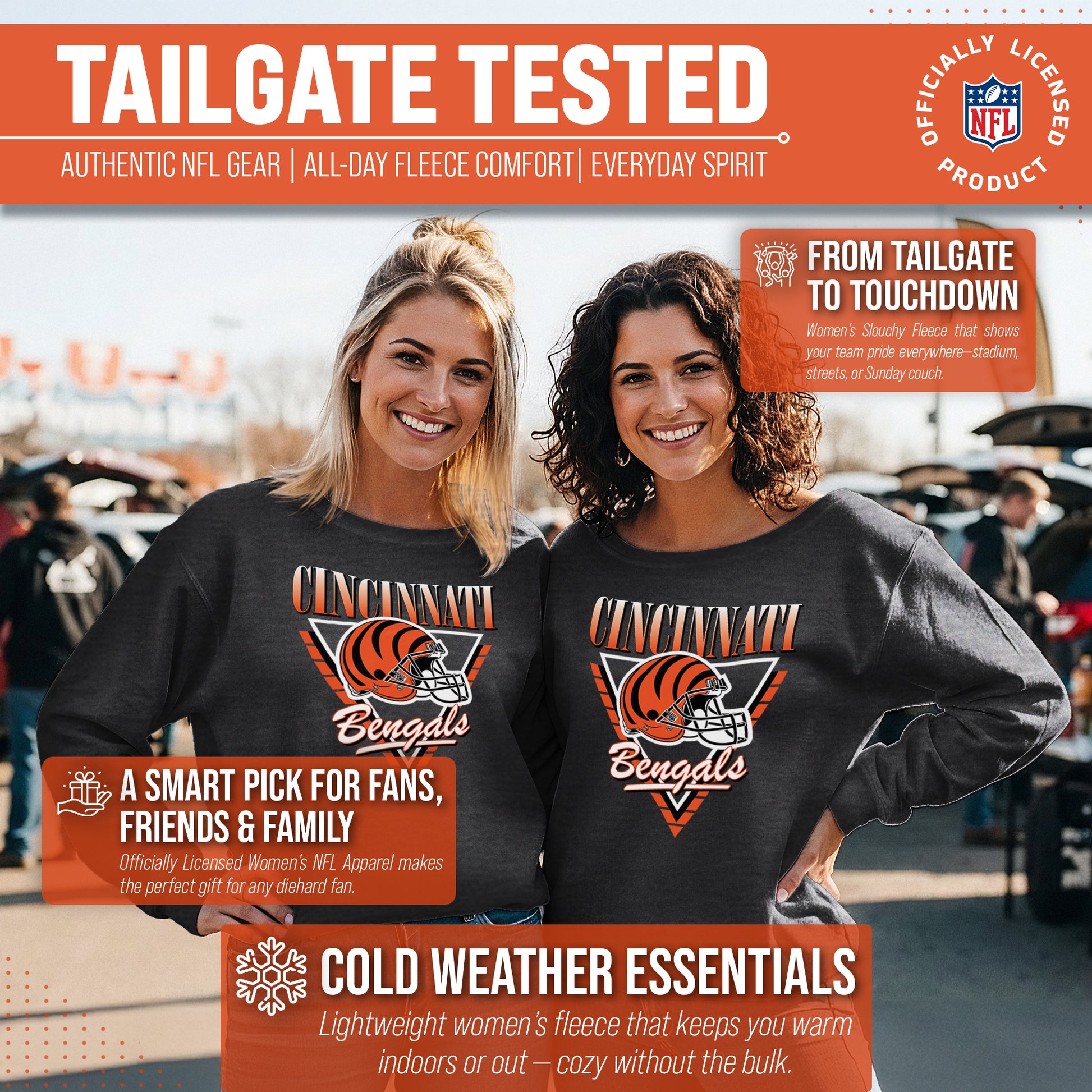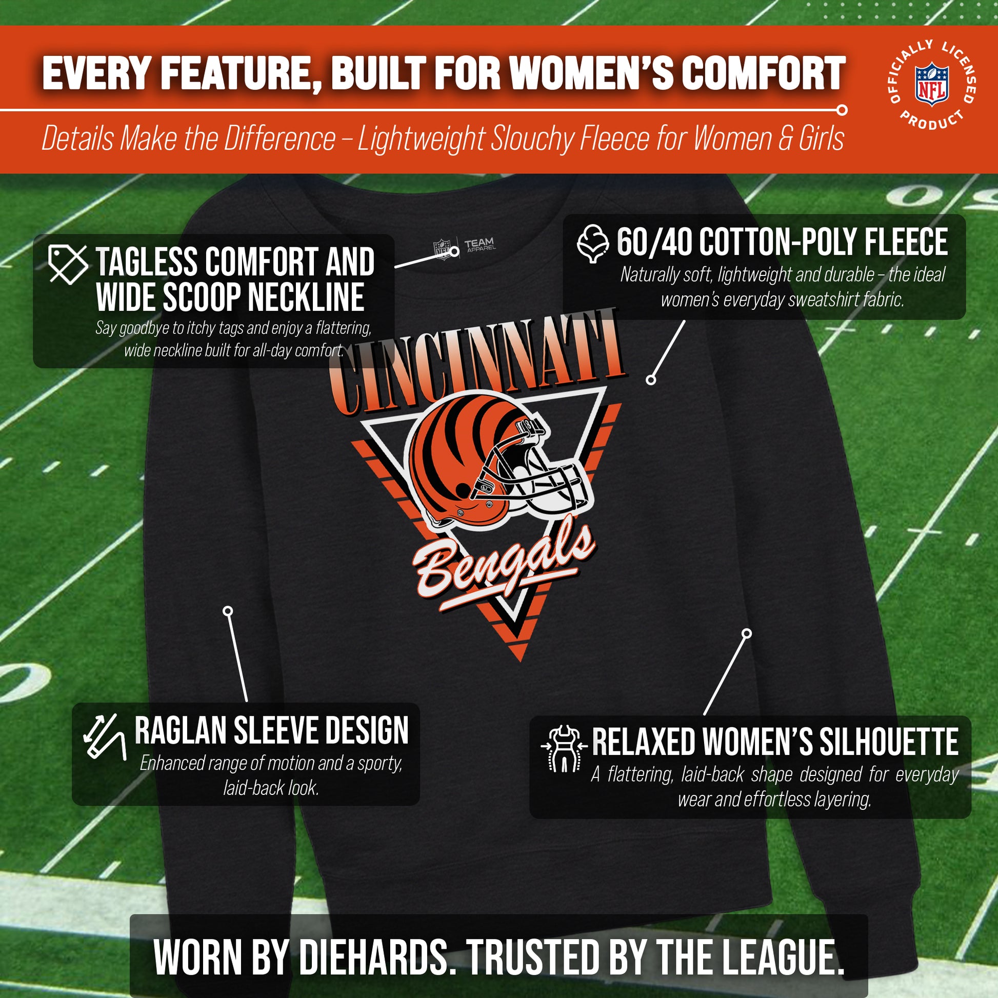 Hey there, fellow lady football fans! Show off your team pride in style with our Team Fan Apparel Cincinnati Bengals NFL Women's Retro Triangle Slouchy Crewneck Fleece Pullover. Made with extra soft cotton polyester fleece material, this long sleeve pullover sweatshirt will keep you warm and cozy on game day or any chilly day. With a tagless design, you won't have to worry about any annoying tags distracting you from cheering on your team.  Featuring a retro triangle design and relaxed fit, this pullover adds a touch of fashion to your game day wardrobe. Available in a range of women's sizes, it's the perfect addition to any fan's closet. Whether you're headed to the stadium or watching from home, stay cool and stylish with this must-have piece of Bengals apparel. Don't let snow or cold weather dampen your team spirit - grab one for yourself or as a gift for the ultimate football-loving lady in your life! Go Bengals!