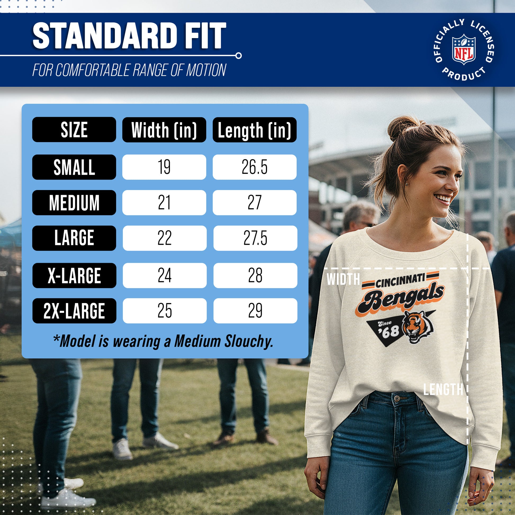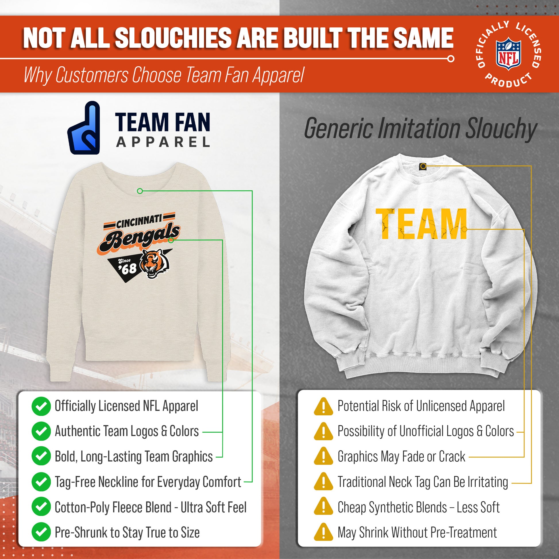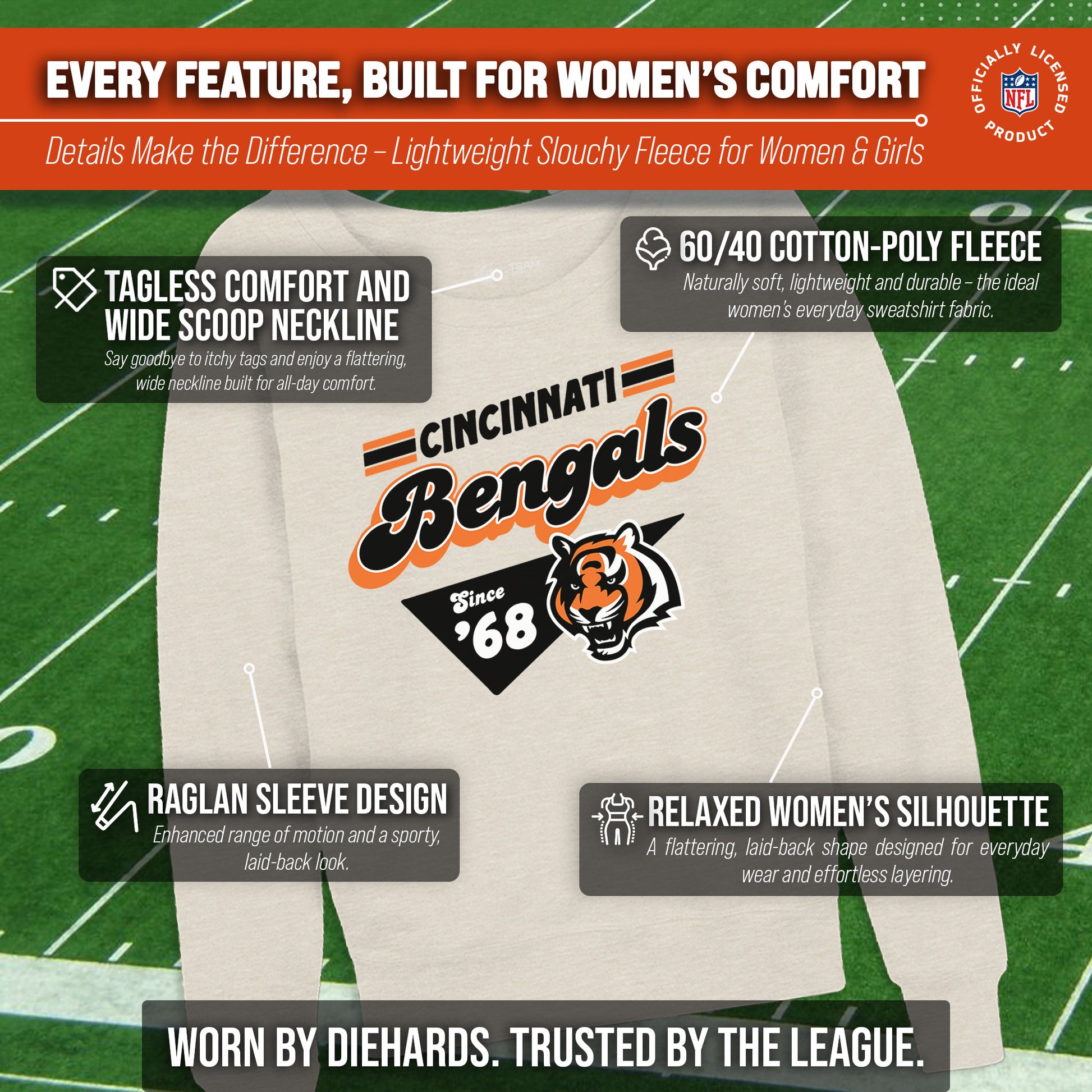 Hey there, fellow lady football fans! Show off your team pride in style with our Team Fan Apparel Cincinnati Bengals NFL Women's Vinntage Charm Slouchy Crewneck Fleece Pullover. Made with extra soft cotton polyester fleece material, this long sleeve pullover sweatshirt will keep you warm and cozy on game day or any chilly day. With a tagless design, you won't have to worry about any annoying tags distracting you from cheering on your team.  Featuring a 90's design and relaxed fit, this pullover adds a touch of fashion to your game day wardrobe. Available in a range of women's sizes, it's the perfect addition to any fan's closet. Whether you're headed to the stadium or watching from home, stay cool and stylish with this must-have piece of Bengals apparel. Don't let snow or cold weather dampen your team spirit - grab one for yourself or as a gift for the ultimate football-loving lady in your life! Go Bengals!