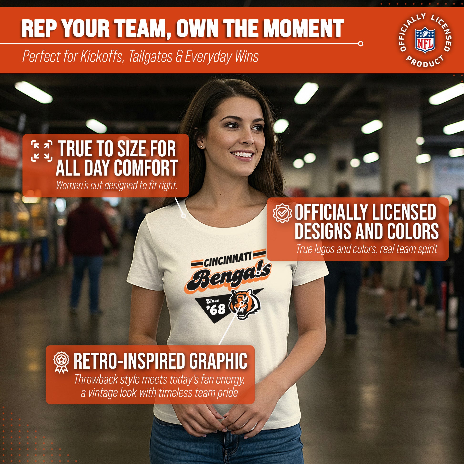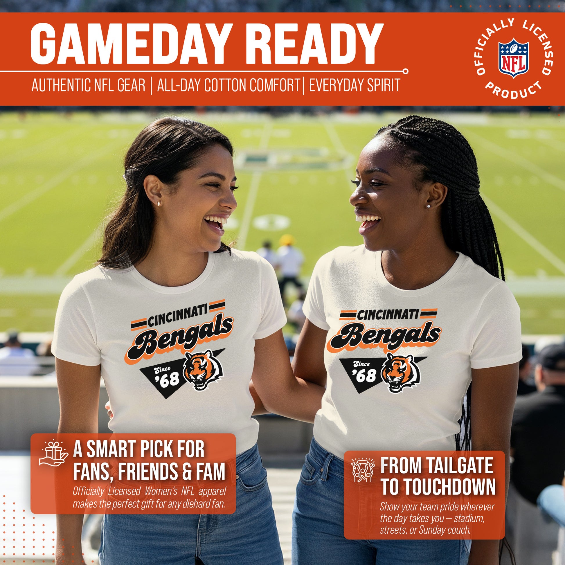 Cincinnati Bengals NFL Womens Vintage Charm Tag-Less Soft T-Shirt - Birch