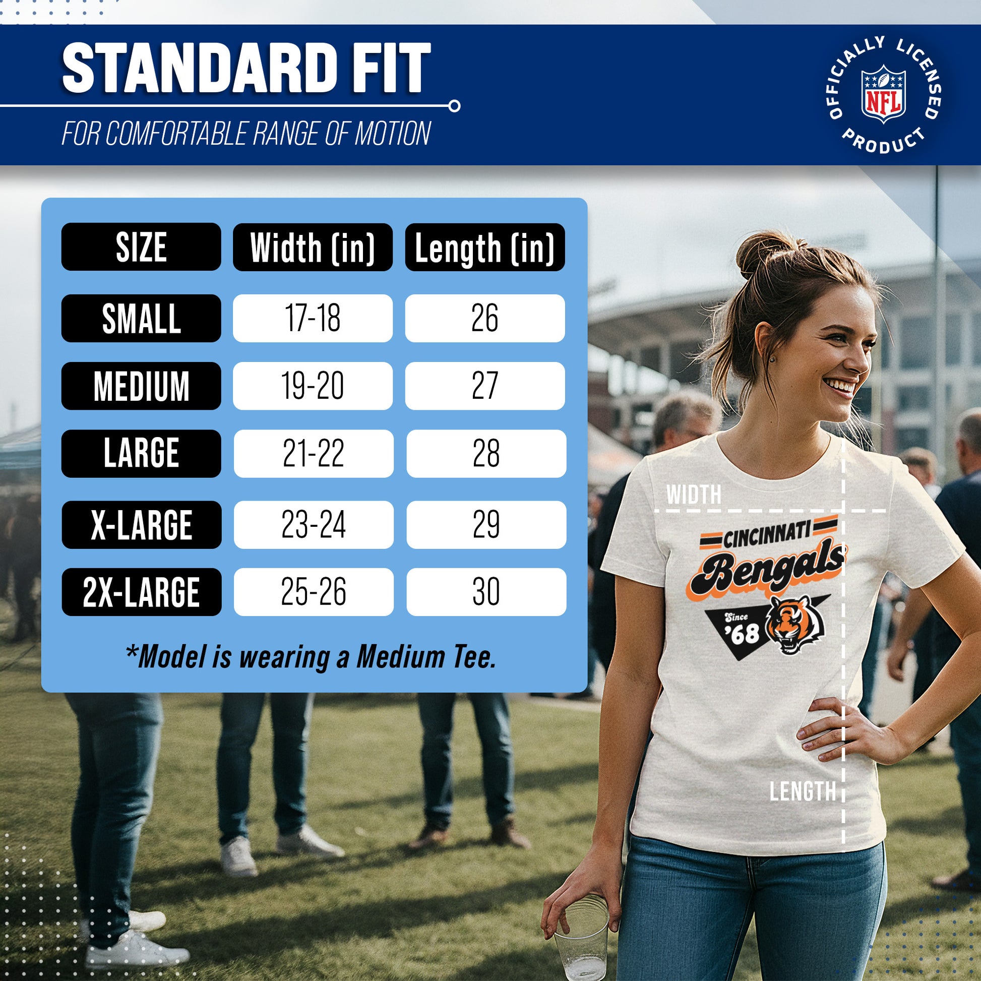 Calling all ladies! Get ready to rock game day with the Women's Team Fan Apparel Vintage Charm T-Shirt! This comfortable and stylish Cincinnati Bengals womens tee is perfect for any female football fan, whether you're cheering on your favorite team at the stadium or watching from home. Made from a super soft cotton fabric , this shirt will keep you cool and comfortable all game long.  The pennant design, team name, and team logo adds a touch of retro flair, while the tag-less design ensures itch-free wear. Whether you're a die-hard fan or just love a good simple look, this shirt is perfect for showing off your team spirit. Available in a wide range of women's sizes, it's suitable for all shapes and sizes! The birch-colored garment will match well with everything in your closet!   So grab your girlfriends and get ready to cheer on your team in style with the Women's Team Fan Apparel Vintage Charm T-Shirt!