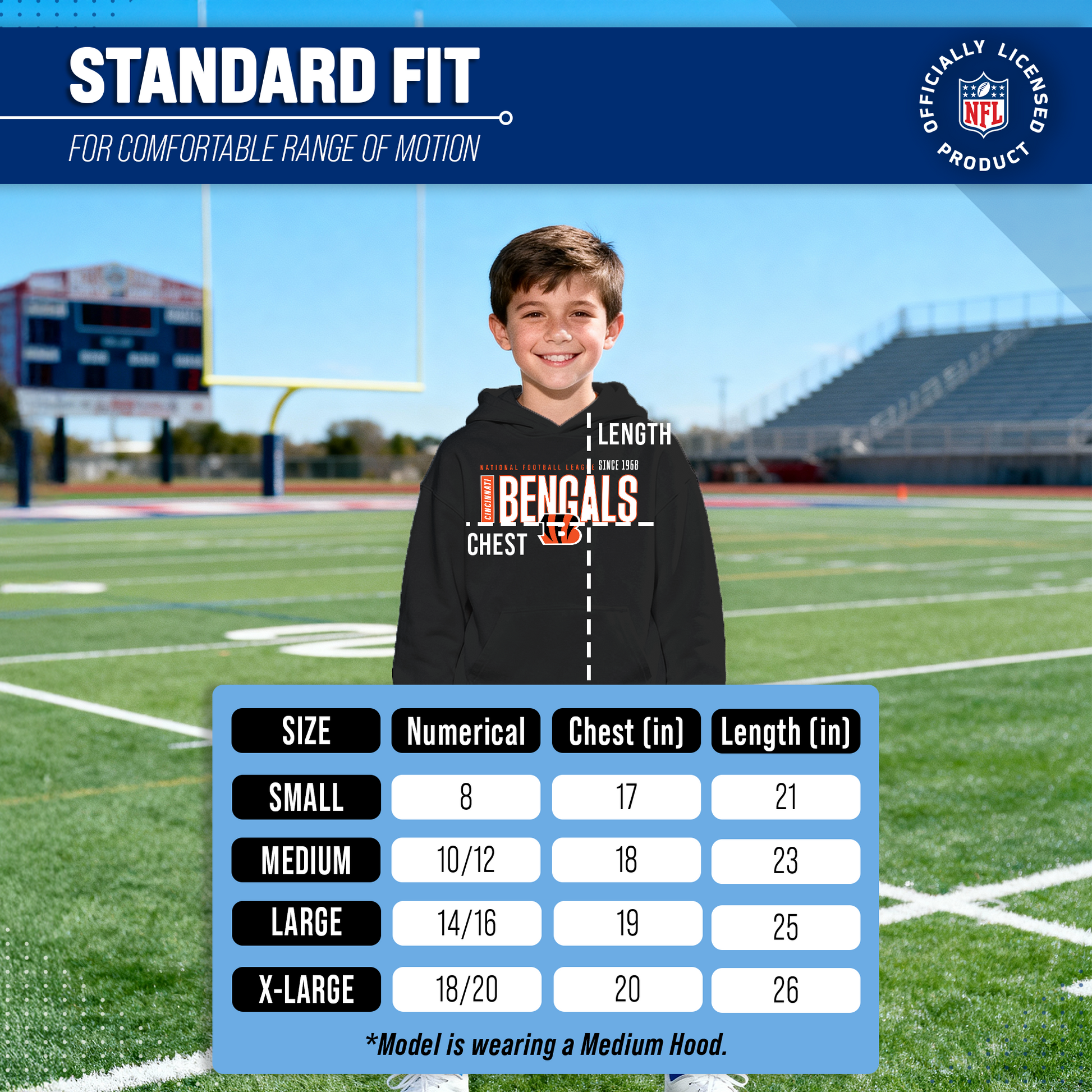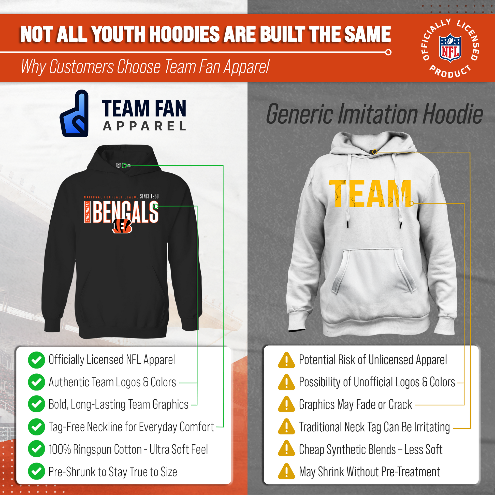 Hey there, young sports fans! Get ready to show off your team spirit with the Team Fan Apparel Cincinnati Bengals Youth Modern Endzone Football Fleece Hooded Sweatshirt! Made from a soft and cozy cotton polyester fleece, this sweatshirt is perfect for staying warm on game day or any day. The unisex design makes it suitable for both boys and girls, and its tag-less feature ensures ultimate comfort all day long. Featuring an original modern endzone design that proudly displays your team's colors and logos, this youth hoodie will be turning heads everywhere it's worn. The front pouch pocket and fleece hood will keep you warm on those cold game days as you cheer on your Bengals! Just pull it on and go! So whether you're at the stadium or hanging out with friends, make sure you're representing your team in style with our NFL youth apparel. Printed and designed in the USA, have confidence your sweatshirt will last! Order now and get your future pro geared up to be the next super fan!