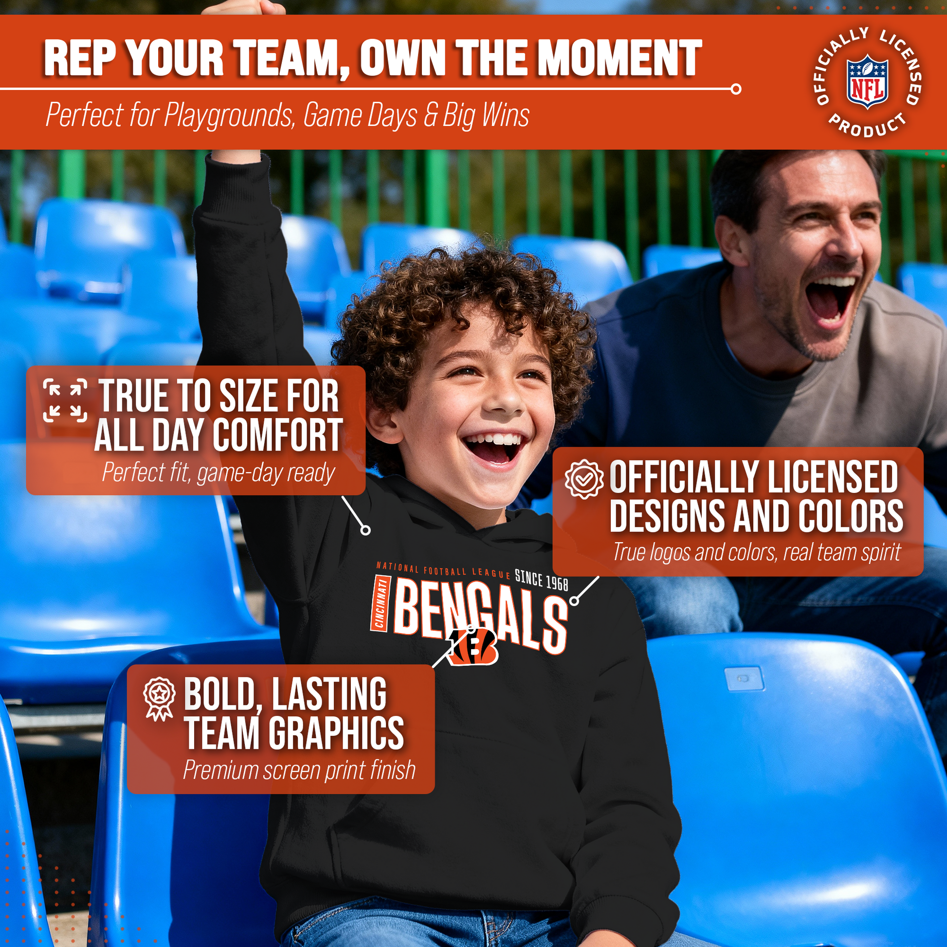 Hey there, young sports fans! Get ready to show off your team spirit with the Team Fan Apparel Cincinnati Bengals Youth Modern Endzone Football Fleece Hooded Sweatshirt! Made from a soft and cozy cotton polyester fleece, this sweatshirt is perfect for staying warm on game day or any day. The unisex design makes it suitable for both boys and girls, and its tag-less feature ensures ultimate comfort all day long. Featuring an original modern endzone design that proudly displays your team's colors and logos, this youth hoodie will be turning heads everywhere it's worn. The front pouch pocket and fleece hood will keep you warm on those cold game days as you cheer on your Bengals! Just pull it on and go! So whether you're at the stadium or hanging out with friends, make sure you're representing your team in style with our NFL youth apparel. Printed and designed in the USA, have confidence your sweatshirt will last! Order now and get your future pro geared up to be the next super fan!
