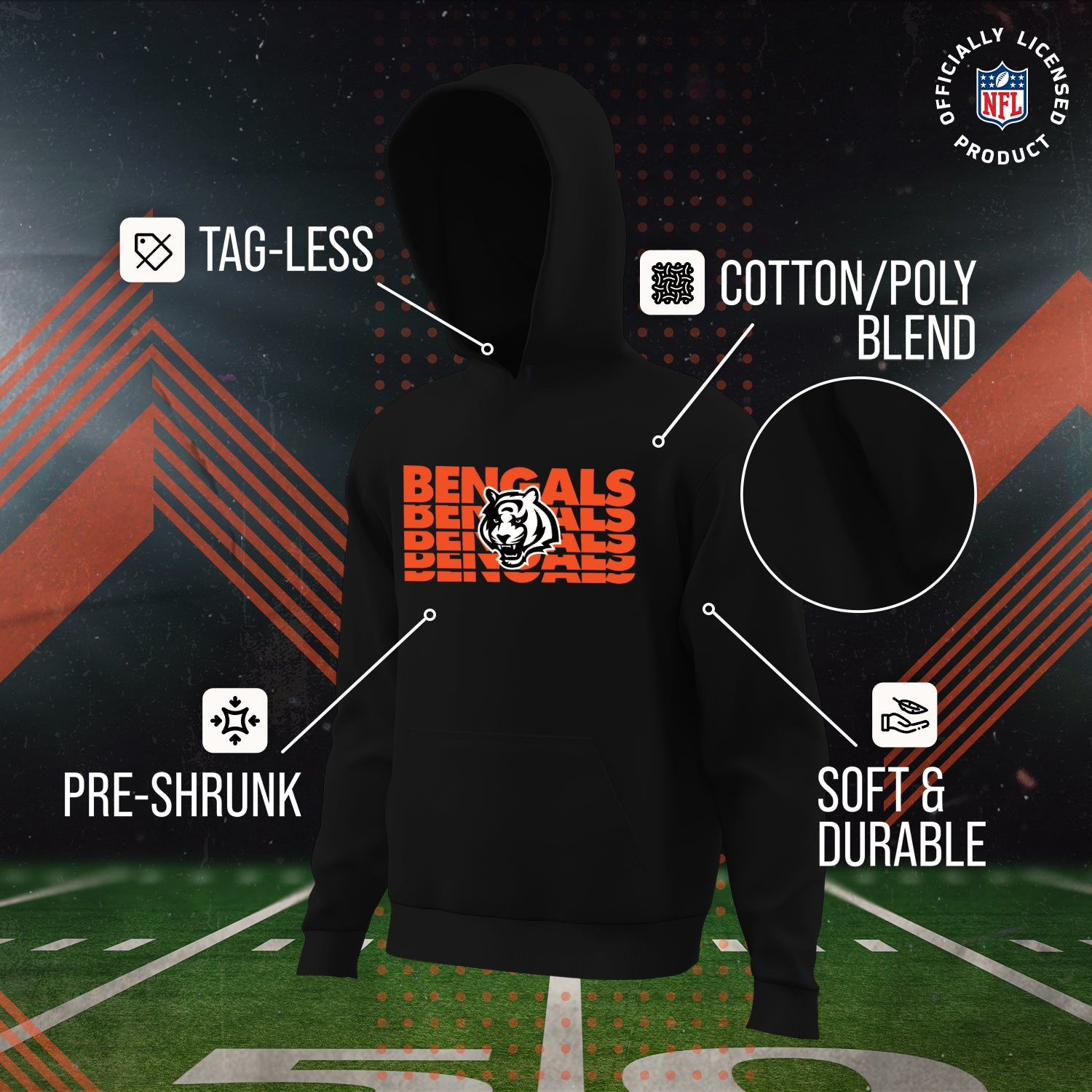 Hey there, young sports fans! Get ready to show off your team spirit with the Team Fan Apparel Cincinnati Bengals Youth Repeating Logo Football Fleece Hooded Sweatshirt! Made from a soft and cozy cotton polyester fleece, this sweatshirt is perfect for staying warm on game day or any day. The unisex design makes it suitable for both boys and girls, and its tag-less feature ensures ultimate comfort all day long.   Featuring an original repeating logo design that proudly displays your team's colors and logos, this youth hoodie will be turning heads everywhere it's worn. The front pouch pocket will keep you warm on those cold game days as you cheer on your Bengals! Just pull it on and go!  So whether you're at the stadium or hanging out with friends, make sure you're representing your team in style with our NFL youth apparel. Printed and designed in the USA, have confidence your sweatshirt will last! Order now and get your future pro geared up to be the next super fan!