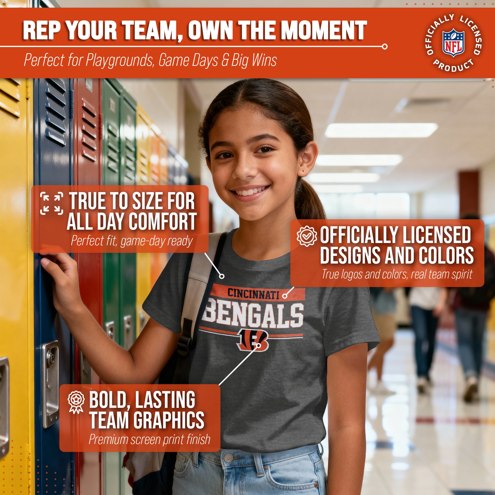 Heather/charcoal wordmark girls and boys Cincinnati Bengals t shirts are the ultimate light, soft, and comfortable tee. These Bengals tshirts for kids are the most versatile football apparel. Let us help you celebrate and showcase team pride with our durable and lightweight t shirts for boys and girls. This tee features a quality, thermal printed wordmark that will last wear after wear. The official wordmark design gives you the look of a loyal and seasoned sports fan and the unique heather, dual-blended material gives a trendy, distressed look without that heavy printed feel. Made of 50% cotton and 50% polyester, the dual blend material is extremely soft, smooth and comfortable. These Cincinnati Bengals youth shirts for boys and girls comes without a tag, so you'll never feel annoyed or irritated by those pesky neck tags again! This tee is essential apparel for any football fan. This classic Cincinnati youth t shirt will stand out and is perfect for gameday, hanging out with friends, or wearing to school. The unisex fit and design makes it ideal for both boys and girls! Quality Bengals t shirt makes the best birthday, or Christmas gifts for young fans; Our Cincinnati Bengals shirts for kids run true to size. All quality logos and colors are officially licensed and are of the highest quality. Show off your team pride with this official short sleeve shirt!