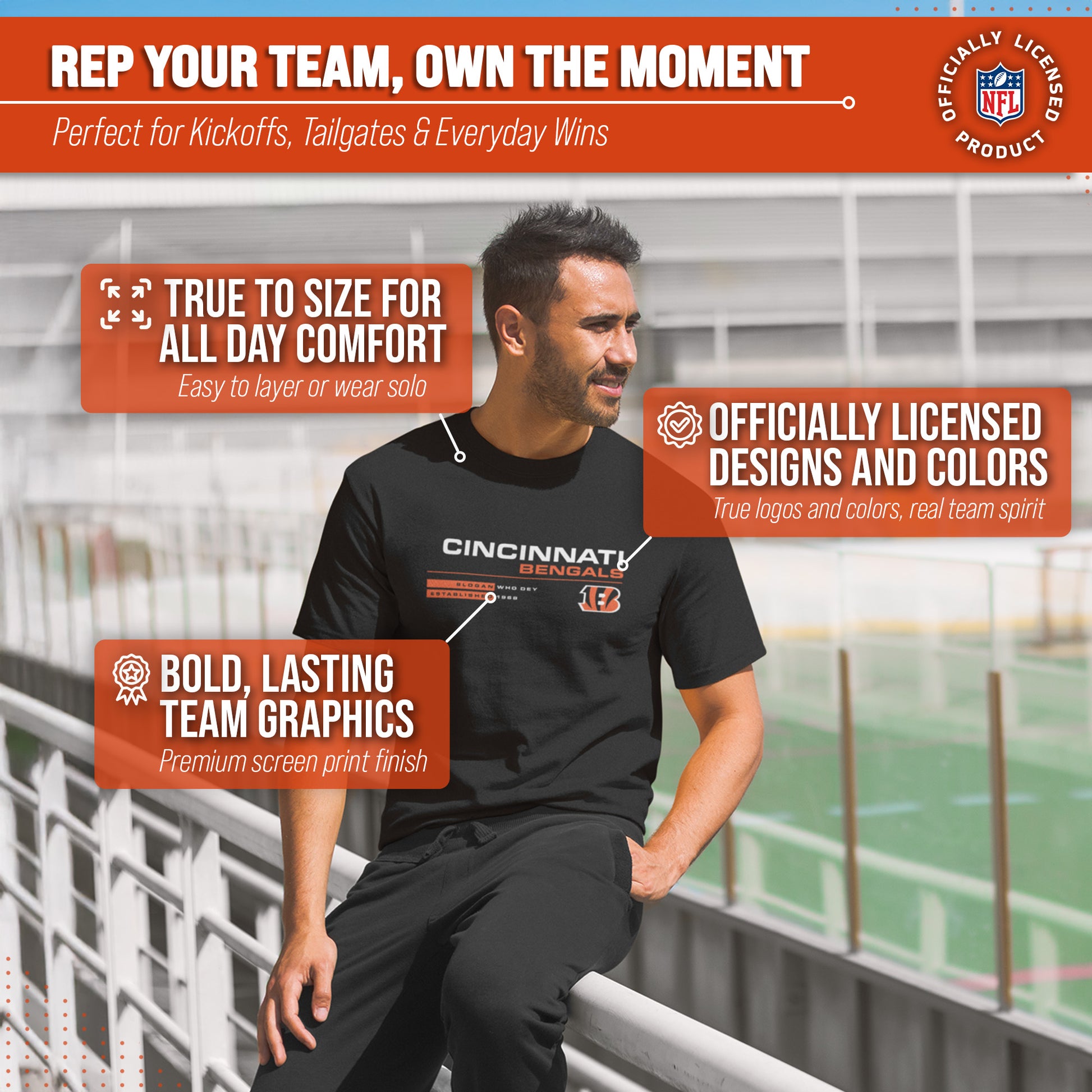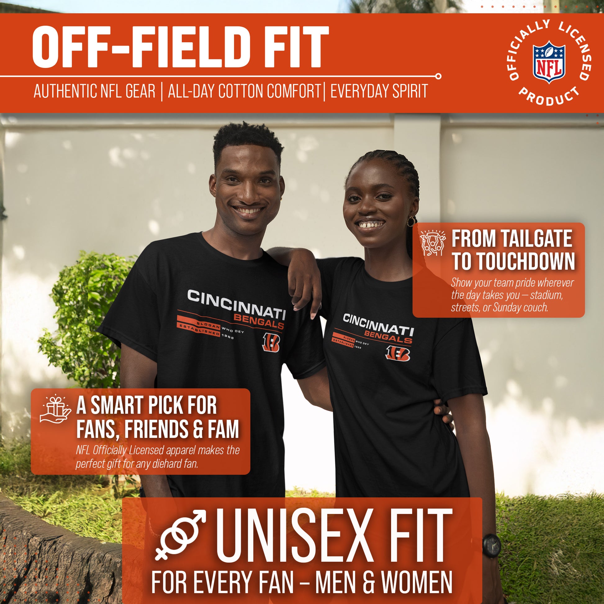 Score with Team Fan Apparel, the ultimate destination for officially licensed NFL apparel for men and women.  We use only the highest-quality screen printing techniques to bring you the most comfortable, durable, and stylish clothing possible. Go ahead and show your team pride at the big game or any time! This premium t-shirt fits both male and female adults and comes in small, medium, large, XL, and XXL. So needless to say, it fits Cincinnati Bengals fans of all types! Maybe you aren't a Bengals fan but you know someone who is? Don't worry! This high-quality t-shirt is soft, lightweight, breathable, and a GREAT gift for any birthday, anniversary, Father's Day, Mother's day, you name it! So, if you want to stand out as the #1  fan at the next big game or watch party, you're going to want to be wearing one of these football t-shirts.