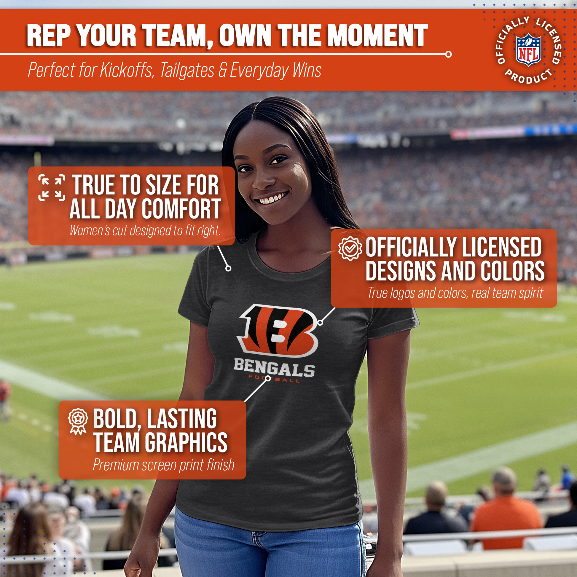 Score with Team Fan Apparel, the ultimate destination for officially licensed NFL apparel for men and women.  We use only the highest-quality screen printing techniques to bring you the most comfortable, durable, and stylish clothing possible. Go ahead and show your team pride at the big game or any time! This premium womens t-shirt comes in small, medium, large, XL, and XXL. So needless to say, it fits Cincinnati Bengals fans of all types! Maybe you aren't a Bengals fan but you know someone who is? Don't worry! This high-quality t-shirt is soft, lightweight, breathable, and a GREAT gift for any birthday, anniversary, Mother's day, Valentine's day, or Christmas gift!  So, if you want to stand out as the #1 female fan at the next big game or watch party, you're going to want to be wearing one of these Cincinnati Bengals Women's Big Logo t-shirts.