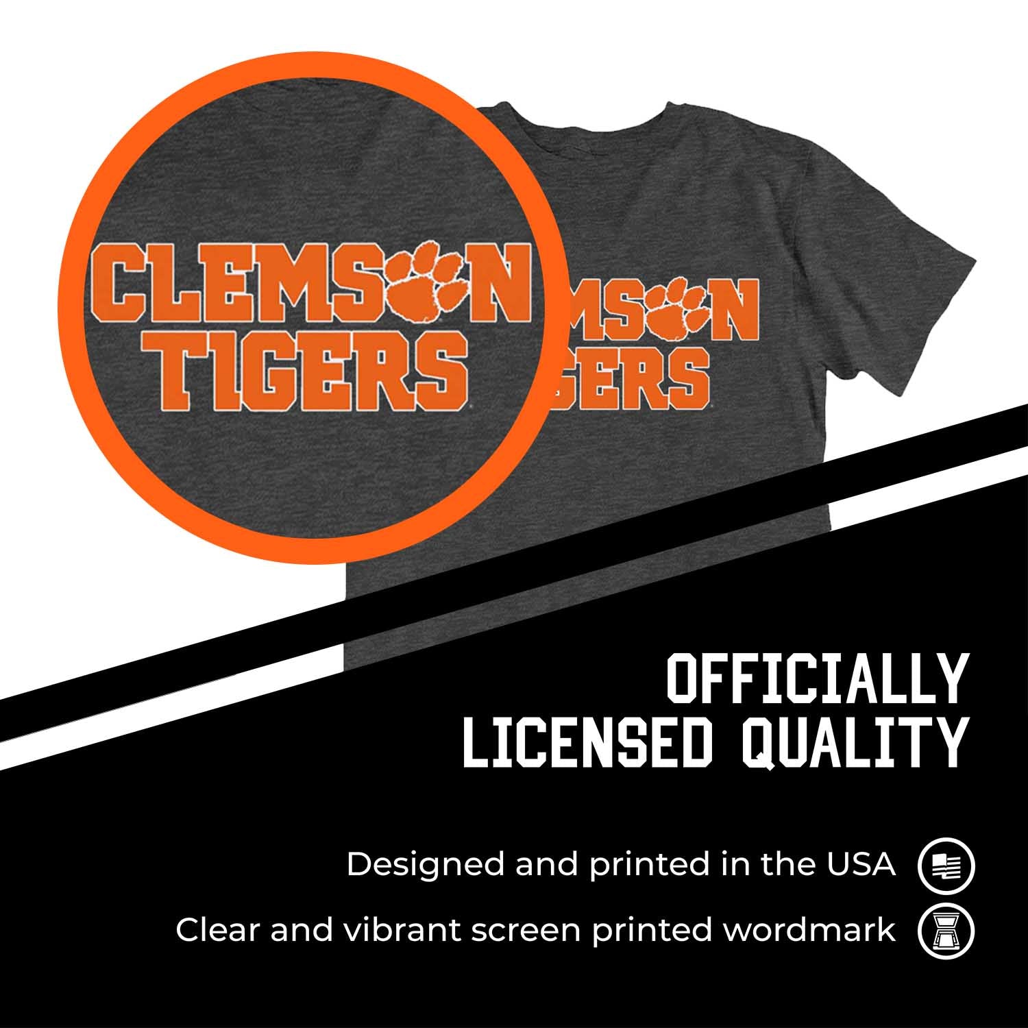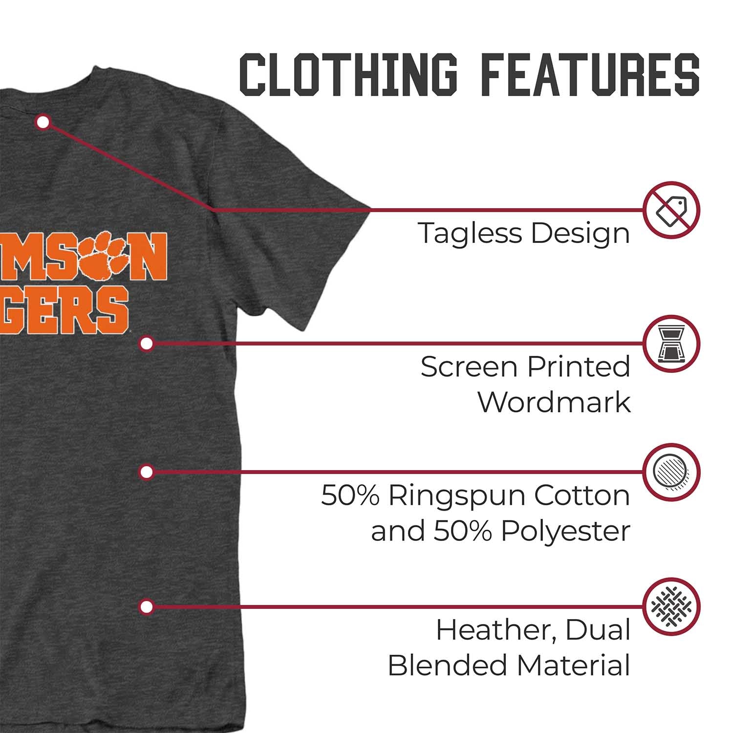 The Campus Colors Adult Heather College wordmark T-Shirt is the ultimate light, soft, and comfortable college tee. These college tshirts for mens and womens short sleeve shirt is the most versatile college or university apparel. Let us help you celebrate and showcase school pride with our durable and lightweight t-shirt. This tee features a quality, screen printed wordmark that will last wear after wear. The official wordmark design gives you the look of a loyal and seasoned sports or school fan and the unique heather, dual-blended material gives a trendy, distressed look without that heavy printed feel. Made of 50% ringspun cotton and 50% polyester, the dual blend material is extremely soft, smooth and comfortable. These Clemson t shirts comes without a tag, so you'll never feel annoyed or irritated by those pesky neck tags again!     This tee is essential apparel for any college sports fan or university student. This classic college apparel t-shirt will stand out and is perfect for walking around campus, going to class, hanging out with friends, or wearing to the gym. It's the perfect college shirt for staying cool at a hot gameday tailgate!    The unisex fit and design makes it ideal for both men and women! Quality college t shirt makes the best birthday, Christmas, or graduation gifts for current students, alumnus, upcoming graduates, proud parents or NCAA fans; Our university t-shirts run true to size. All quality logos and colors are officially licensed and are of the highest quality. Show off your school pride with this official short sleeve t-shirt! Be confident and wear this Clemson shirt knowing your fandom is superior.