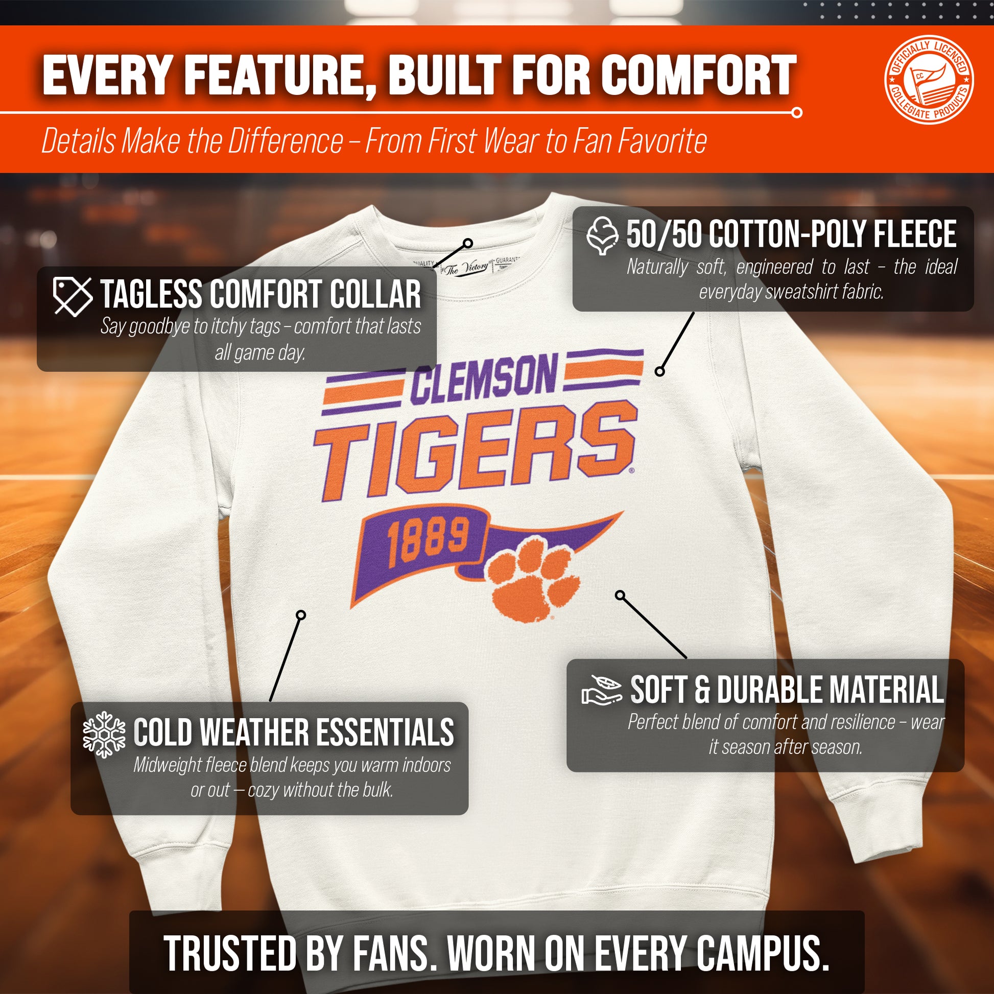 Show off your team spirit and stay warm in the NCAA Adult Unisex Varsity Club Pennant Clemson Tigers Crewneck Fleece Sweatshirt! This cozy sweatshirt is perfect for any Clemson fan, with its vibrant colored pennant design. Made from a comfortable cotton poly fleece fabric, this Tigers crewneck sweatshirt features long sleeves, ribbed wrists and waistband, and will keep you warm on chilly days!   But that's not all - you can wear this Clemson sweatshirt game after game without worrying about wear and tear. It's the perfect addition to your college team apparel collection, whether you're cheering on your team at the stadium or just lounging at home. It is the number one Clemson item you'll want to have on the next cold game day!   So why settle for a plain old sweatshirt when you can show off your love for Clemson Tigers in style? Get your NCAA Adult Unisex Varsity Club Pennant Crewneck Fleece Sweatshirt today for yourself or any Tigers fan in your life and be confident know that you are rocking the most authentic and official gear!
