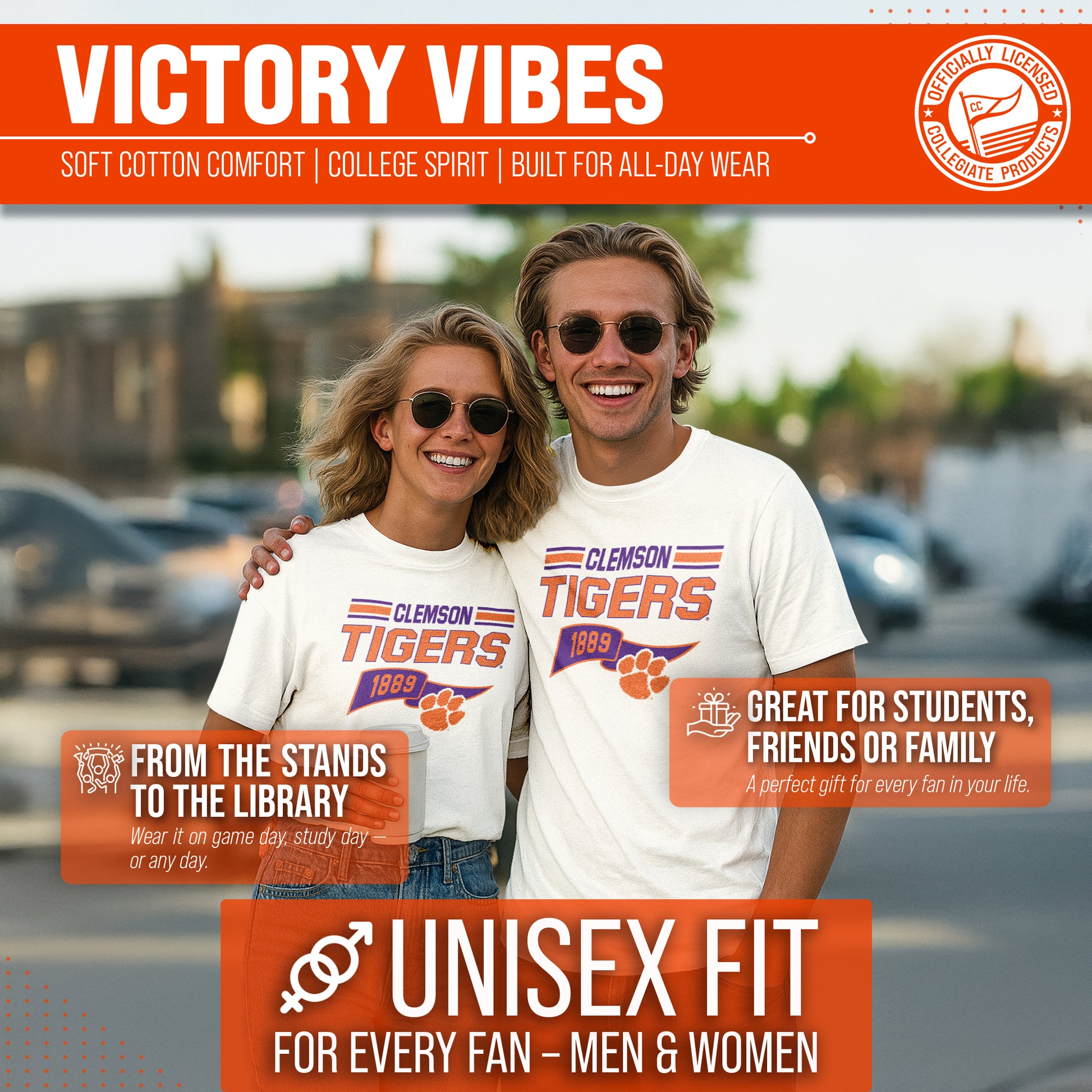 Go Team, Go! Show off your school spirit with the NCAA Adult Unisex Varsity Club Clemson Tigers Pennant T-Shirt! Our officially licensed apparel will have you feeling like a member of the team!   Made from comfortable and breathable cotton and featuring a neutral color garment, this t-shirt is perfect for game days, tailgates, or just lounging around. The tag-less design ensures ultimate comfort and no annoying tags to distract you from cheering on your team. Perfect for wearing to the big game, watching from home, hanging with friends, or even working out! Our Varsity Club Clemson Tigers shirt makes a great gift for yourself, or any Tigers fan in your life!   Our shirts are made from ringspun cotton for a soft feel against your skin and feature a classic retro pennant design of your favorite college team. With short sleeves and a variety of sizes to choose from, these t-shirts are perfect for men and women alike. So gear up for game day with the NCAA Adult Unisex Varsity Club Pennant T-Shirt - the perfect addition to any Clemson Tigers fan's wardrobe!
