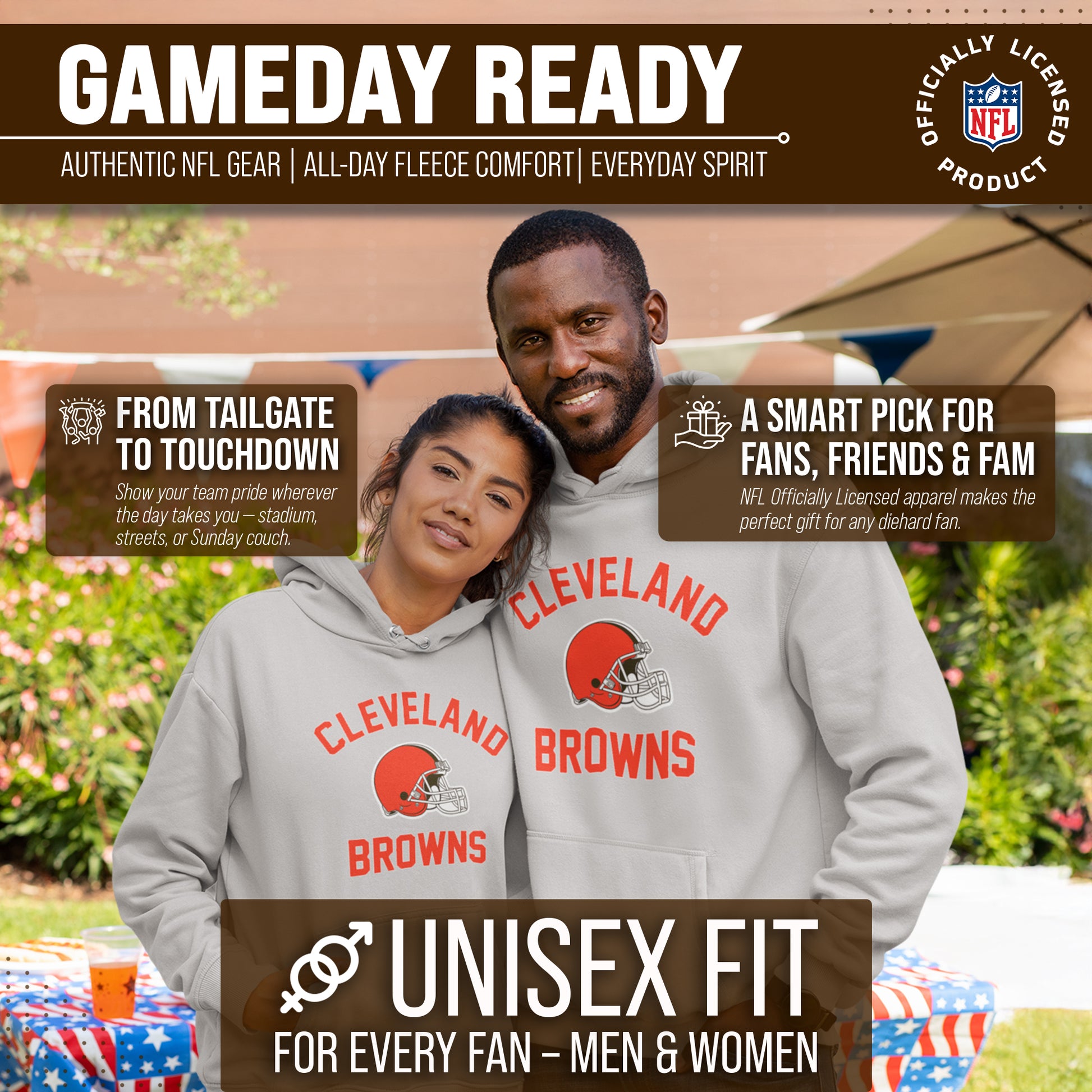 Our Adult Gameday Cleveland Browns football pullover hoodie with a front pouch pocket is the ideal sweatshirt to wear on gameday. This Cleveland hoodie is comfortable and great for showing team pride all year long. This is an essential piece of womens and mens football apparel for pro football fans. Our Cleveland Browns team colored hoodie sweatshirts are the perfect fan apparel for tailgates and sports games. This hooded sweatshirt pullover with a pocket and drawstrings is ideal for warm or cold weather games. The football pullover hoodie is made from a cotton poly blend fleece material with cotton face.    These pro football sweatshirts have high quality features. Our football pullover hoodies feature 1x1 ribbing at cuffs and waistband. This Browns hoodie sweatshirt has a twill neck tape and jersey lined hood. The metal eyelets on the sweatshirt drawstrings add a sophisticated look to these pro football team hoodies for men and women.    This tagless sweatshirt ensures the most comfortable fit for men and women. The standard fit makes our football team hoodies for men and women the perfect sweatshirt for Cleveland fans. The thermal printed graphics are high definition, true team color, and resist fading. Our hoodies also make the best Browns gifts for men and women. Cleveland Browns apparel is the perfect birthday gift for any professional sports fan. Our football team hoodies for men and women are great mens football apparel for tailgating, stadium fun, or watching the game at home.