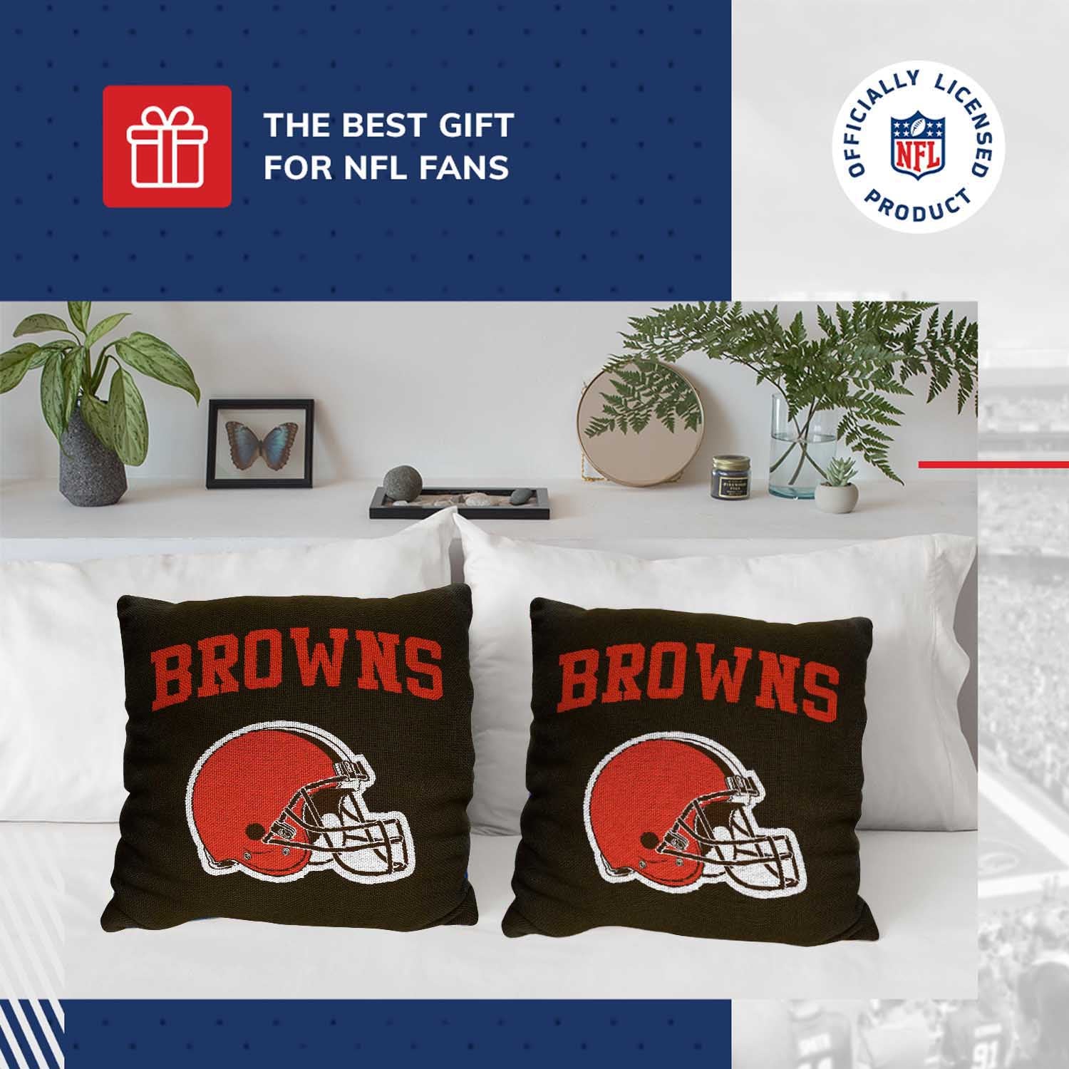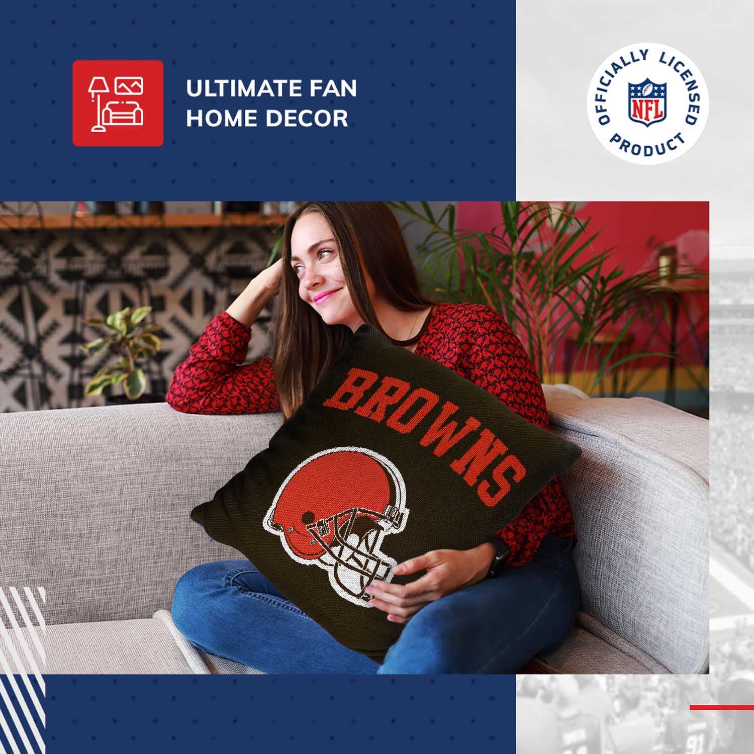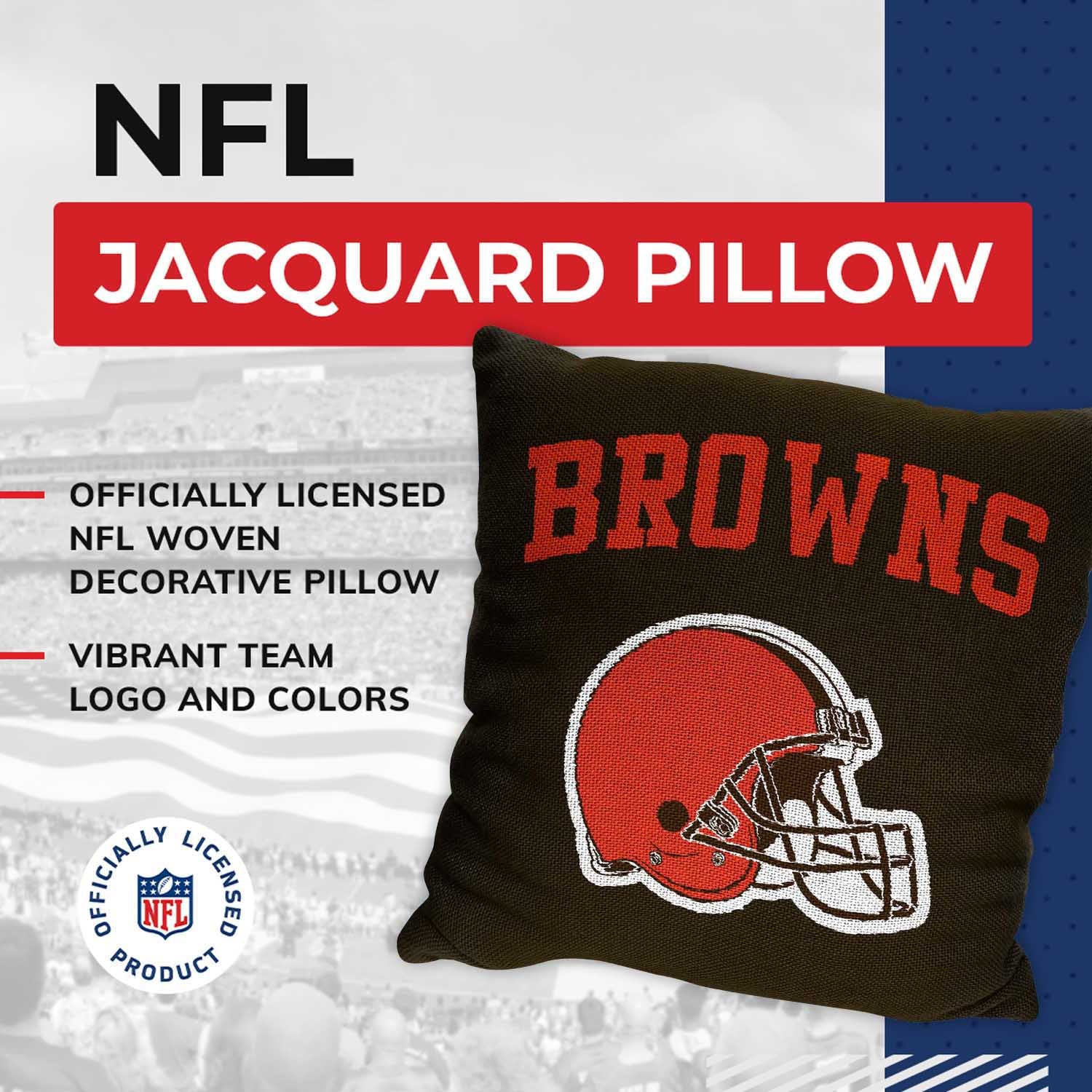 This woven Cleveland Browns throw pillow for football fans is the perfect small accent pillow for any fans bedroom, living room, basement, or sports room. Our 14"" x 14"" square decorative pillow features official team colors, names, and logo. Show off your Browns pride anywhere in your home with this great pillow. This pillow makes the perfect sports decoration for any room that you want your fandom to be displayed. You can use these small accent pillows for your bed or couch. and look even better combined with other Cleveland Browns bedding. These high quality decorative pillows add a trendy and stylish touch to your room decor. The woven jacquard pillow is sure to spruce up any enviorment. The woven, stuffed pillows also make the perfect gifts for Browns sports fans of all ages. They make great birthday gifts, graduation gifts, and Christmas gifts and are versatile, durable, and work with all decoration styles. The durable material of our sports throw pillows holds up in all situations, no matter if it's game day at home or it's being used as a sports decor!