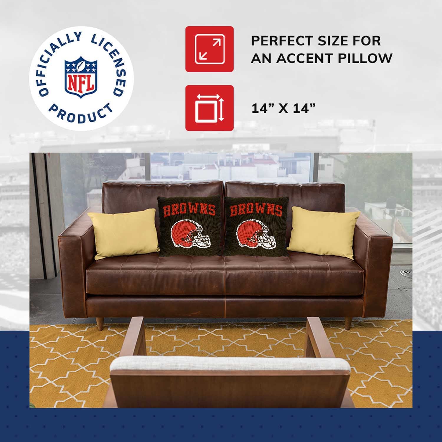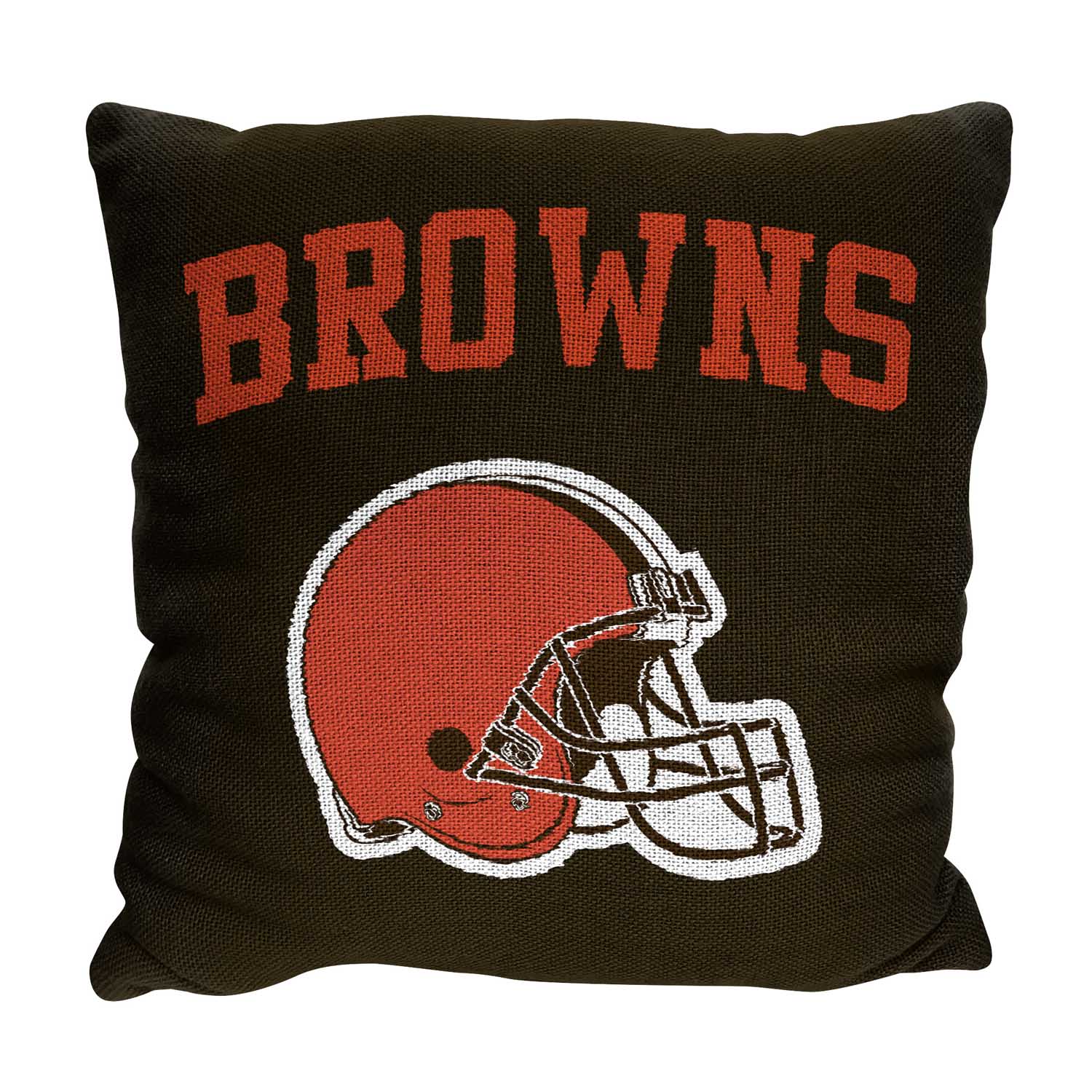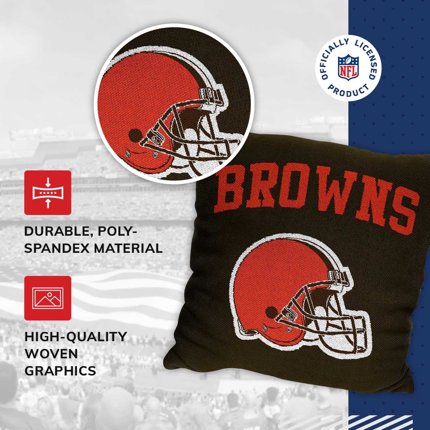 This woven Cleveland Browns throw pillow for football fans is the perfect small accent pillow for any fans bedroom, living room, basement, or sports room. Our 14"" x 14"" square decorative pillow features official team colors, names, and logo. Show off your Browns pride anywhere in your home with this great pillow. This pillow makes the perfect sports decoration for any room that you want your fandom to be displayed. You can use these small accent pillows for your bed or couch. and look even better combined with other Cleveland Browns bedding. These high quality decorative pillows add a trendy and stylish touch to your room decor. The woven jacquard pillow is sure to spruce up any enviorment. The woven, stuffed pillows also make the perfect gifts for Browns sports fans of all ages. They make great birthday gifts, graduation gifts, and Christmas gifts and are versatile, durable, and work with all decoration styles. The durable material of our sports throw pillows holds up in all situations, no matter if it's game day at home or it's being used as a sports decor!
