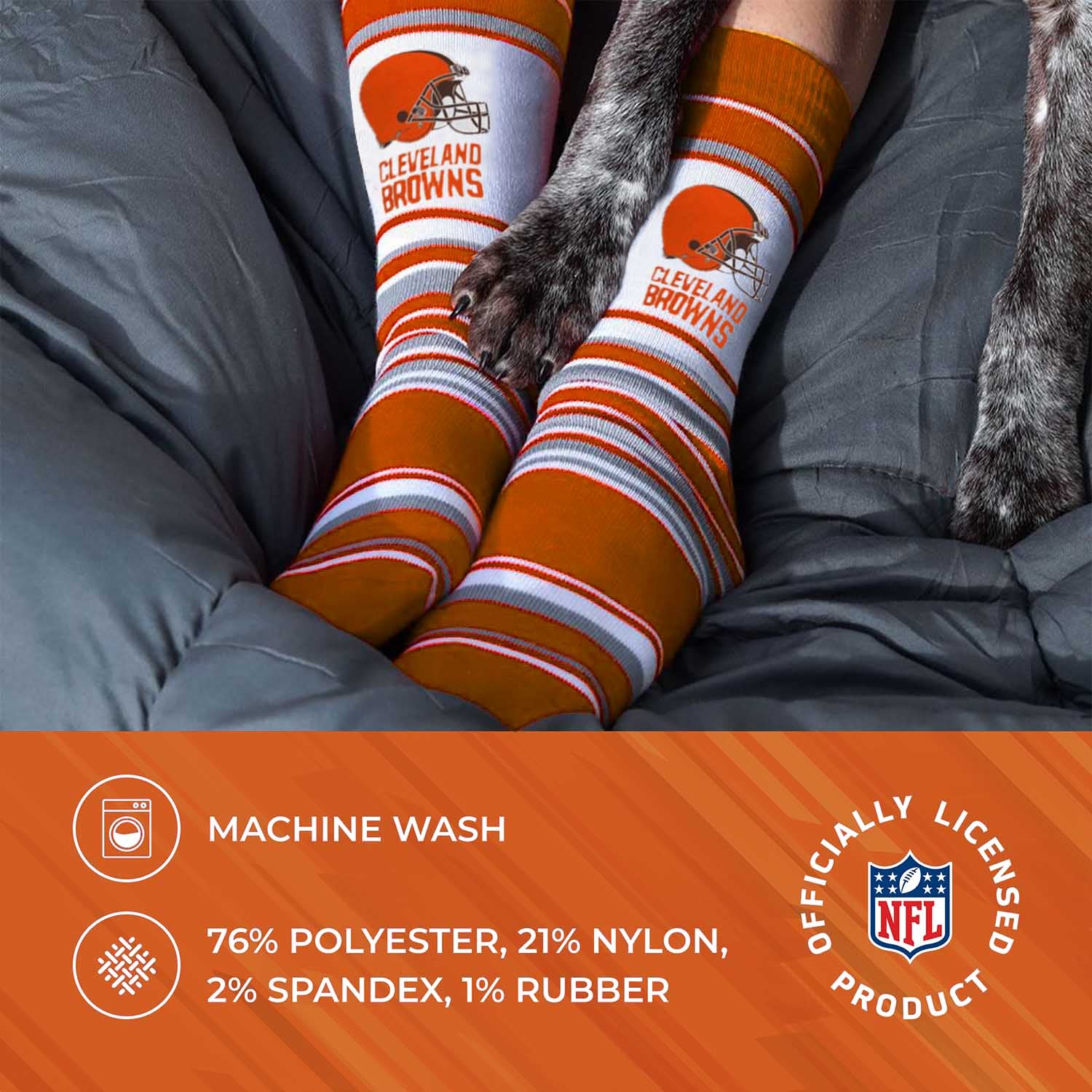 These dress striped Cleveland socks are great for showing off your Cleveland pride at formal events. The Cleveland dress socks are comfortable and fit most feet. The crew length and acrylic fabric blend feature a flashy striped pattern make them a comfortable choice for showcasing your love for your team all year long.     Cleveland Browns youth socks and adult socks are great additions to a collection of Cleveland Browns stuff. Wear them with shorts, your favorite jersey, and Cleveland Browns shoes for weekend look, or rock them in the office for an alternative to typical striped. On a lazy day, wear them with your underwear or pajamas and slippers while you put your feet up and enjoy a game in the house.     striped dress Cleveland socks for women and men make great gifts for all ages, combine them with boxers and Cleveland Browns slippers for a perfect father's day gift or holiday stocking stuffers.     The officially-licensed team logo, colors, and graphic make these socks the Cleveland Browns striped socks everyone will love. Fabric content is 76% acrylic, 21% nylon, 2% spandex, and 1% rubber. Machine wash, tumble dry low.