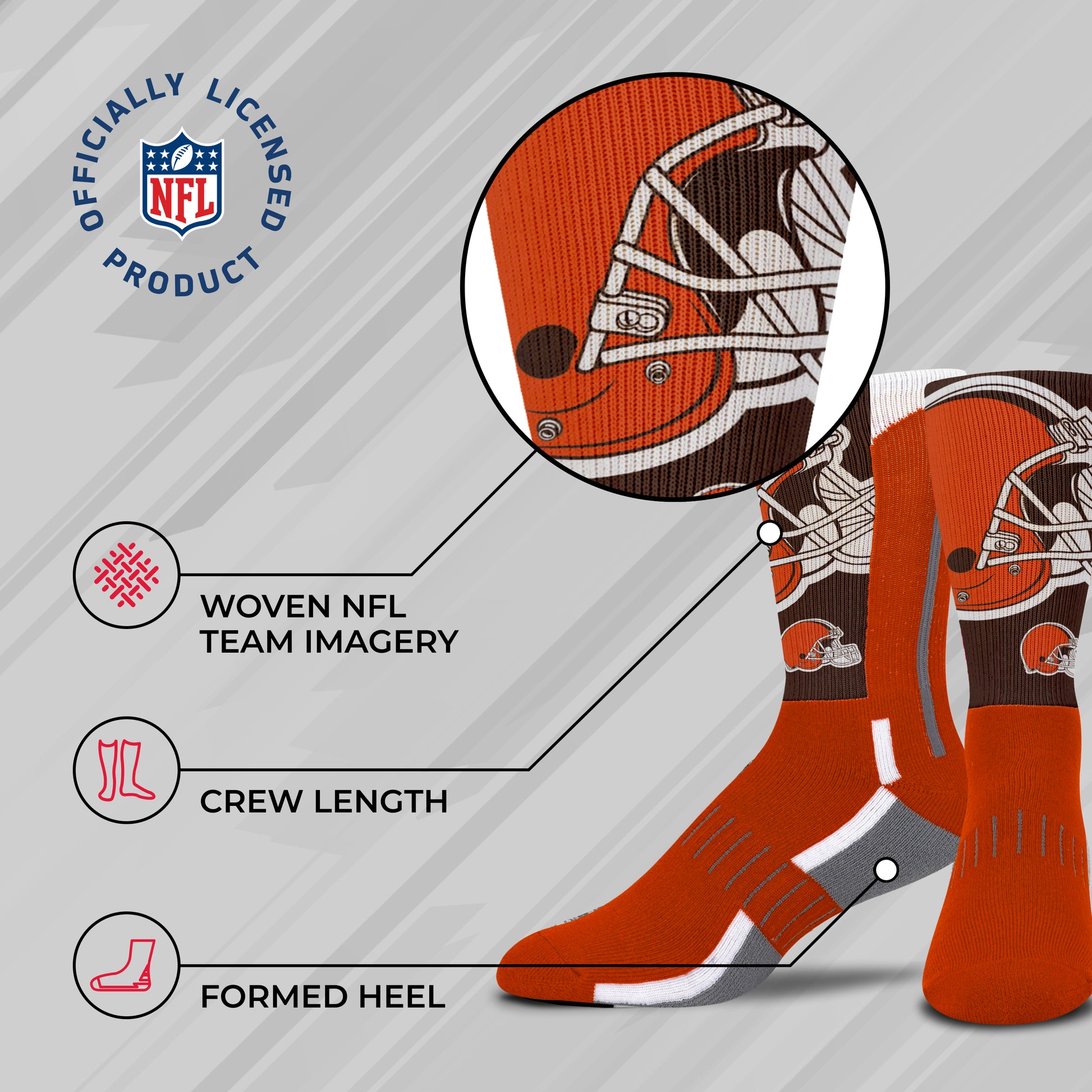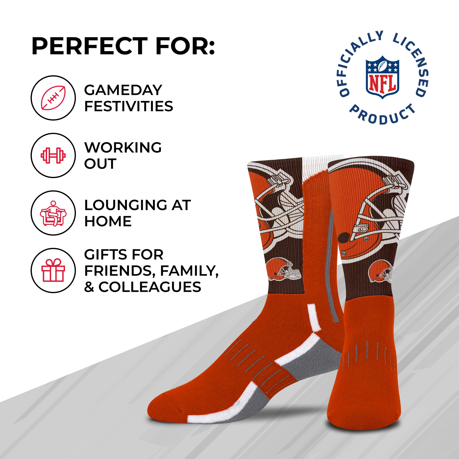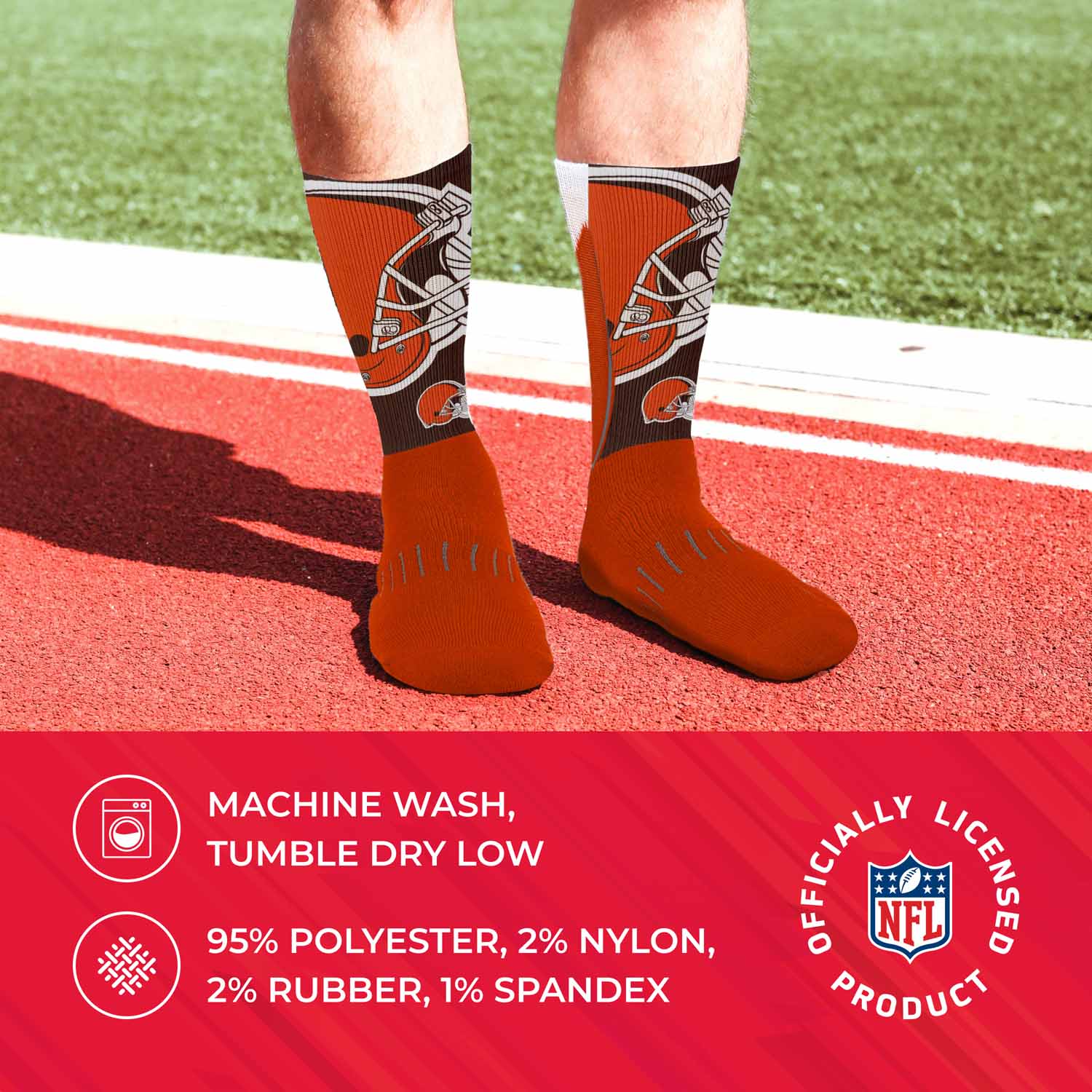 These Cleveland Browns socks for men, and women are great for showing off your Cleveland pride from head to toe. The unisex Cleveland socks adult are comfortable, and are available in a range of sizes. The crew length and poly-spandex blend featuring a supportive formed heel make them a comfortable choice for showcasing your love for your team all year long.     Cleveland adult socks are great additions to a collection of Cleveland Browns stuff. Wear them with shorts, your favorite jersey, and Cleveland Browns shoes for a superfan look, or rock them in the office for an alternative to argyle on casual Friday. On a lazy day, wear them with your underwear or pajamas and Cleveland Browns house shoes while you put your feet up and enjoy a game in the house.     Cleveland Browns adult socks make great gifts for all ages, combine them with boxers and Cleveland Browns slippers for men for a perfect father's day gift or holiday stocking stuffers.     The officially-licensed team logo, colors, and graphics make these socks the Cleveland socks women, and men superfans will love. Fabric content is 95% polyester, 2% nylon, 2% rubber, and 1% spandex. Machine washable, tumble dry low