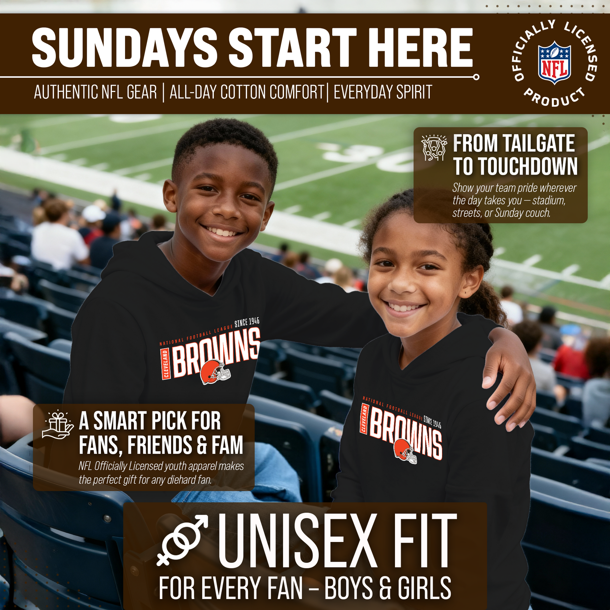 Hey there, young sports fans! Get ready to show off your team spirit with the Team Fan Apparel Cleveland Browns Youth Modern Endzone Football Fleece Hooded Sweatshirt! Made from a soft and cozy cotton polyester fleece, this sweatshirt is perfect for staying warm on game day or any day. The unisex design makes it suitable for both boys and girls, and its tag-less feature ensures ultimate comfort all day long. Featuring an original modern endzone design that proudly displays your team's colors and logos, this youth hoodie will be turning heads everywhere it's worn. The front pouch pocket and fleece hood will keep you warm on those cold game days as you cheer on your Browns! Just pull it on and go! So whether you're at the stadium or hanging out with friends, make sure you're representing your team in style with our NFL youth apparel. Printed and designed in the USA, have confidence your sweatshirt will last! Order now and get your future pro geared up to be the next super fan!