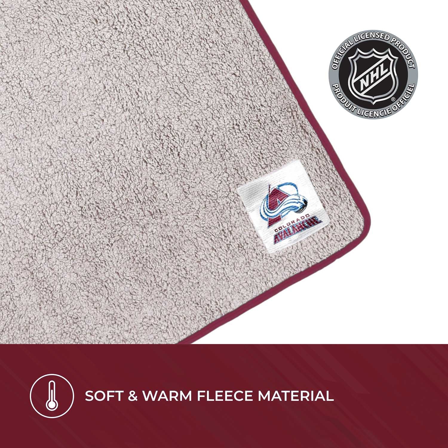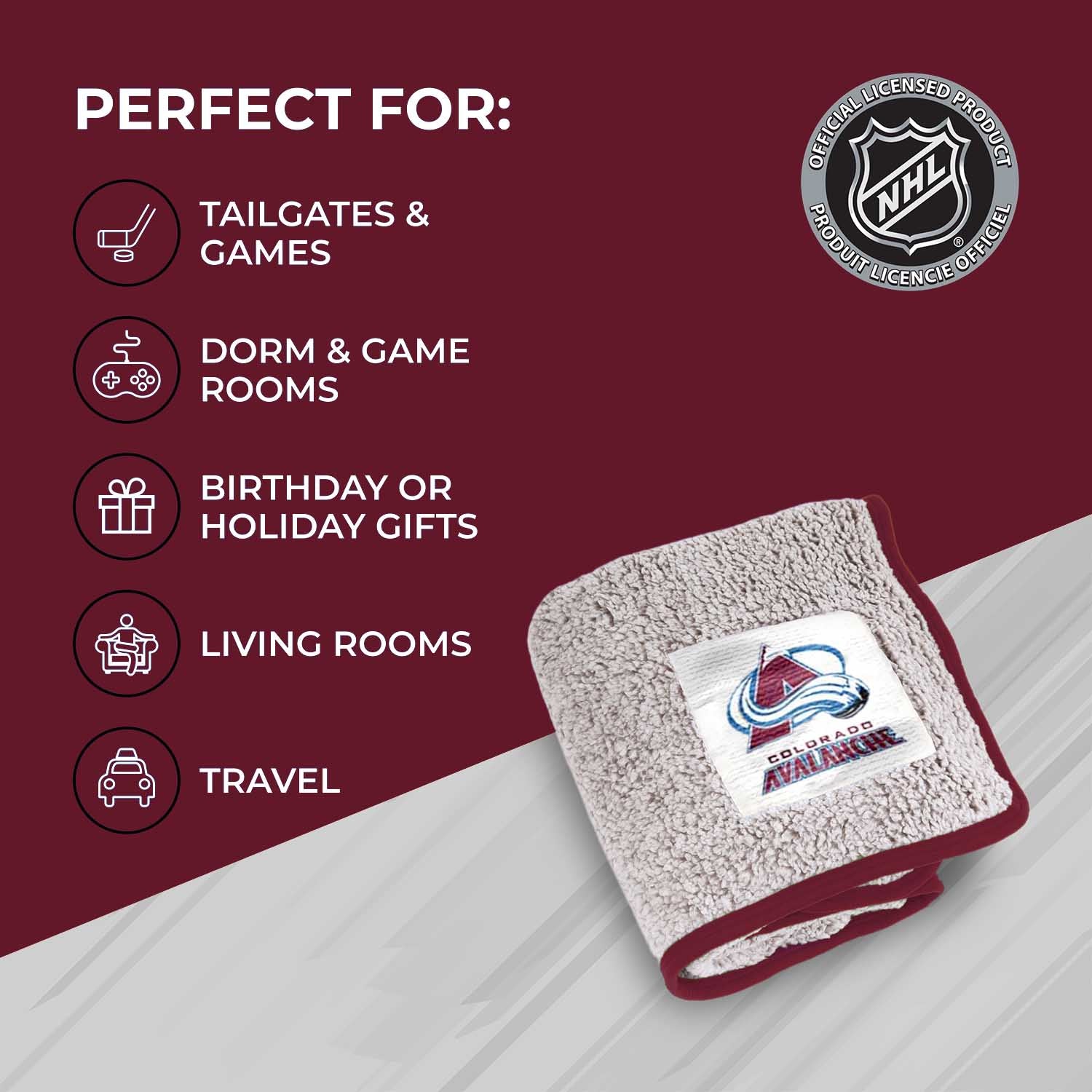 Keep your fandom warm all season long with the super soft and cozy two tone sherpa throw NHL blanket! Calling all Colorado Avalanche fans! The Colorado Avalanche sherpa 60"" x 50"" blanket is this season's NHL accessory that you do not want to miss out on. The two tone frosty blanket features thick team color trim and an official team logo woven patch. Plus, the frosty tipped, high-pile Sherpa material is super cozy and warm. If you're in the market for Colorado gifts, this blanket is perfect. Each Avalanche blanket is shipped folded, making it the perfect gift for sports fans. The Colorado Avalanche blanket is great gift for birthdays, Christmas, and other holidays. Whether you are sitting in the stands of a Colorado hockey game, watching from home, you can stay warm and display your fandom wherever you take your sherpa blanket! The high-pile sherpa material will keep you warm and cozy all winter and fall. This super soft blanket is lightweight and perfect to bring to tailgates or into the big game. This cozy blanket is also perfect for cuddling up at home; keep it in the living room, on a college couch bed, or on a cozy chair in a pro-themed den full of Colorado room decorations. It's a great blanket to use as bedding or a comforter in a college dorm or apartment. The fluffy material makes it great for putting on any bed.