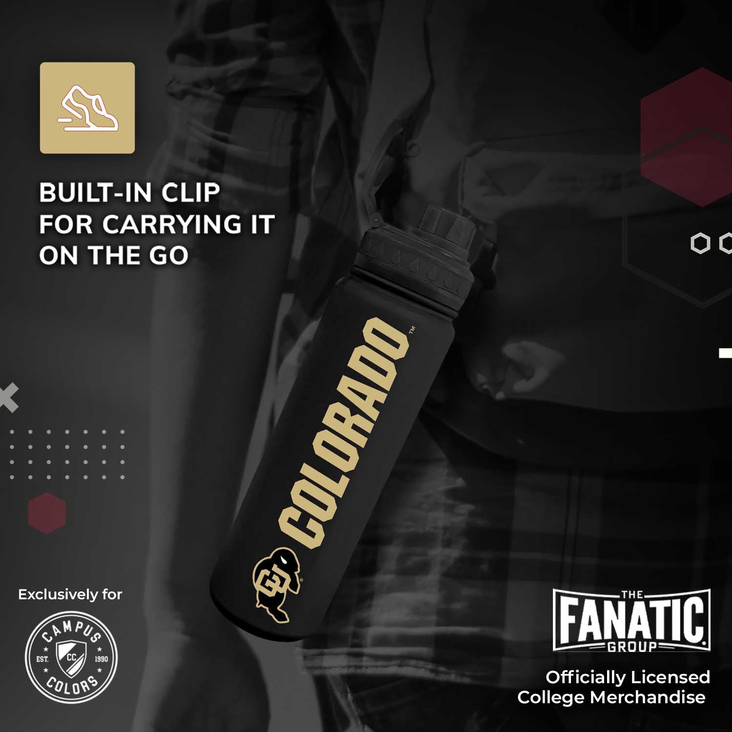 This officially licensed 24oz Colorado water bottle is the best accessory for any Colorado Buffaloes fan. You can use this water bottle 24 oz for water, sports drink, or even to keep your coffee hot. Our vacuum sealed sport bottle ensures that your drinks stay hot or cold for hours. You can bring this bottle along to sport games, hikes, or tailgates on game day. This sport water bottle 24 oz is a slim bottle that fits in most car cup holders for convenience. This stainless sports water bottle features an easy flow spout for the best drinking experience. The twist on cap features an easy drinking spout to make sipping a breeze. The bottle's lid twists on and off to reveal an easy drinking mouthpiece. The convenience of our double walled water bottles make them perfect for sports and everyday life! Show off your school spirit with this Colorado Buffaloes water bottle. This durable stainless sports water bottle make the perfect Colorado Buffaloes accessories for any activity. Our water bottle with clip for backpack is perfect for student campus life and busy alumni activities. Our vacuum sealed water bottles feature a built in handle. The easy grab bottle allows you to sip your water without spilling it on yourself while playing sports or walking to class. The college water bottle is coated in silicone for added grip and softer finish, and the exterior is sweat free so the Colorado water bottle won't drip on you. This insulated water bottle is the perfect birthday or Christmas gift for fans who love to collect Colorado stuff. Pair with other Colorado novelties or apparel for the ultimate Buffaloes gift for women and men. Colorado gear is great as birthday gifts for college students, alumni, and sport fans. With our Colorado Buffaloes water bottle, fans can show team pride and stay hydrated all day and every day!
