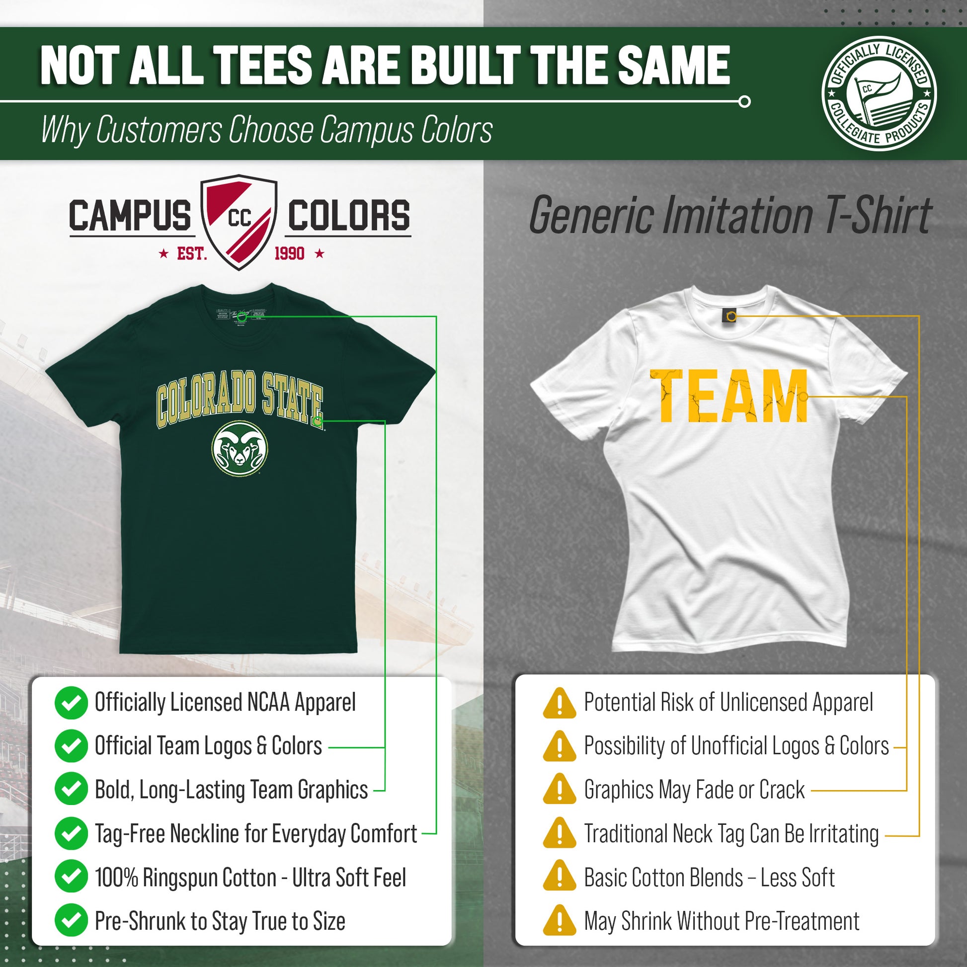 Score with Campus Colors, the ultimate destination for officially licensed college apparel for men and women. Design and printed in the USA, we use only the highest quality screen printing techniques to bring you the most comfortable, durable, and stylish clothing possible. Go ahead and show your team pride at the big game or any time! This premium-quality Gameday t-shirt fits both male and female adults and comes in small, medium, large, XL, and XXL. So needless to say, it fits Colorado State Rams fans of all types! Maybe you aren't a Colorado State fan but you know someone who is? Don't worry! This high-quality t-shirt is soft, lightweight, breathable and a GREAT gift for any birthday, anniversary, Father's Day, Mother's day, you name it! So, if you want to stand out as the #1 Rams fan at the next big tailgate party, homecoming parade, or watch party, you're going to want to be wearing one of these Gameday t-shirts