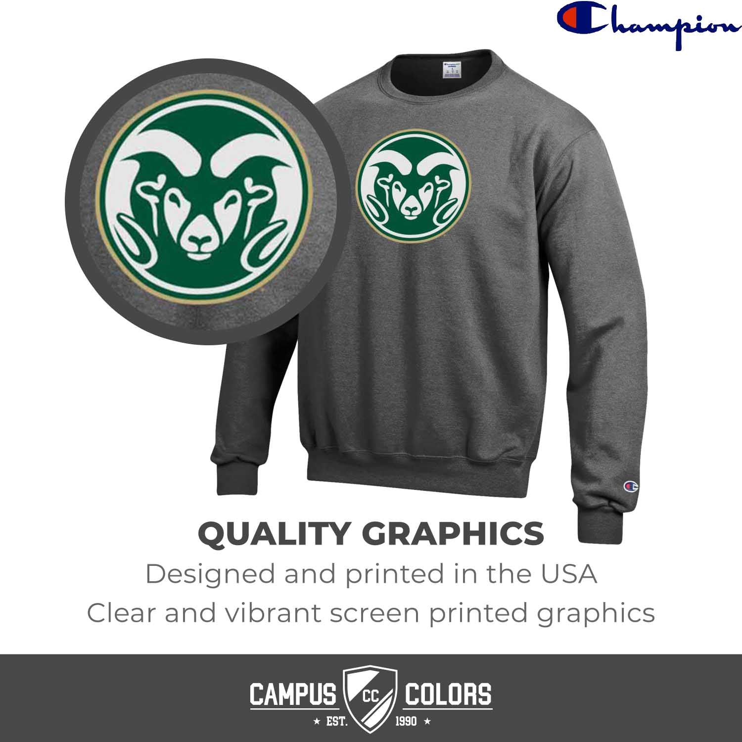 When the weather gets cool, keep your Colorado State loyalty hot! The Colorado State Rams Adult NCAA Mascot Fleece Crewneck is just what you need! This cotton/polyester fleece crewneck sweatshirt is comfortable yet durable and is the perfect weight for that chilly game day or brisk outdoor activity. Simple is better and this crewneck supports that theory! Your pride will be radiating with the bold colors and quality screen printed logo in the center! Featuring high quality screen printed design with a large official Colorado State logo in the center of the crewneck, ribbed neck, cuffs, and waistband, and the official Champion logo on the left wrist, there is nothing you will not love about this crewneck. Whether you are wearing it in the stands, cheering on your squad at home, or wearing it around town running errands, this sweatshirt is an amazing addition to any die-hard fans wardrobe! Perfect for yourself, a soon to-be graduate, or even an alum, this crewneck lets you show off your Colorado State fandom.    MADE FROM: ultra soft blend of 50% ring spun cotton / 50% polyester fleece.   FEATURES: high quality screen printed design with a large official Colorado State logo in the center of the crewneck, ribbed neck, cuffs, and waistband, and the official Champion logo on the left wrist.   PERFECT: for any Rams fan in your life! Great for wearing to big games, tailgates, to work, to class, working out, running errands, or ANY time you want your fandom to be known when the weather gets cold!   OFFICIALLY LICENSED: by NCAA and is the highest of quality.