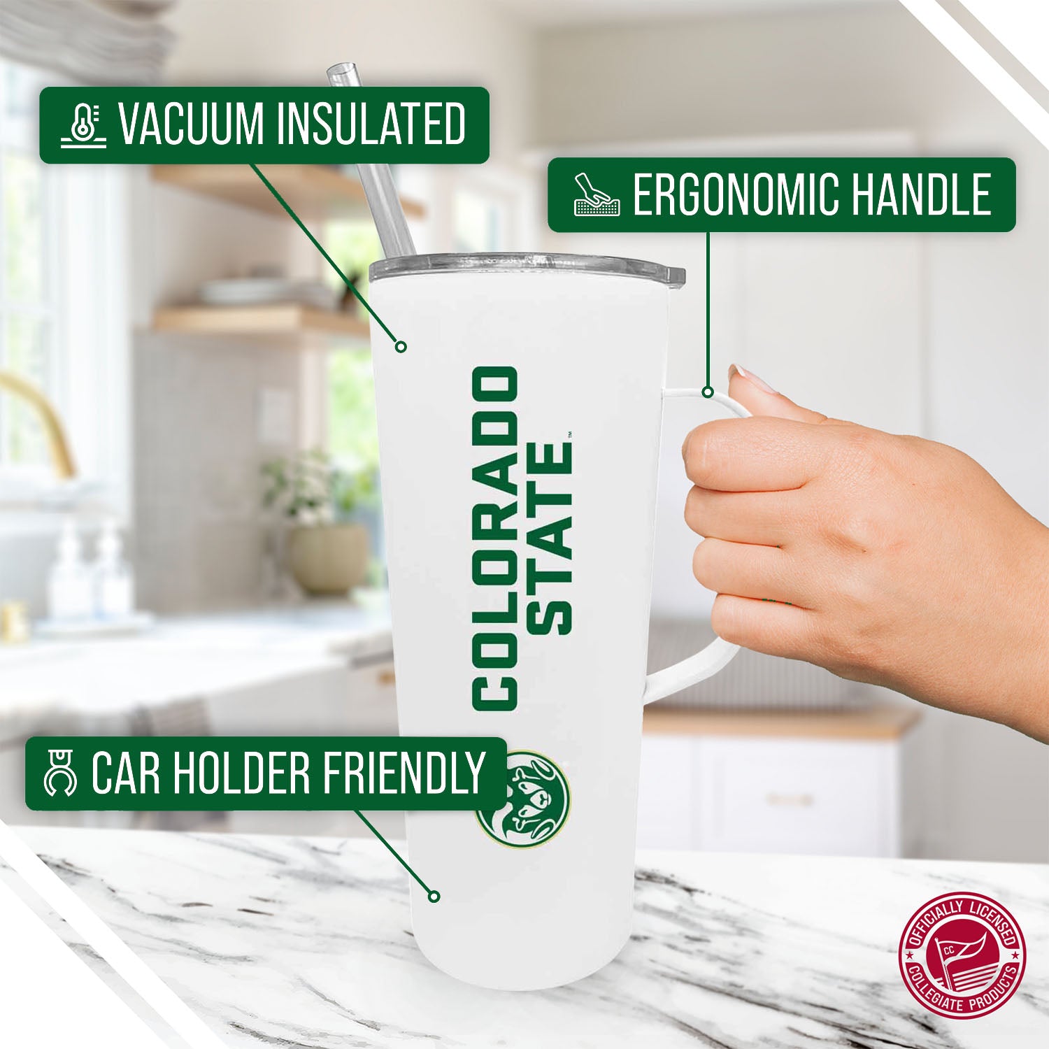 Introducing the ultimate accessory for Rams fans or busy individuals on the go, the NCAA Stainless Steal 20oz Roadie With Handle & Dual Option Lid With Straw! This tumbler is designed to keep you hydrated and stylish throughout your day, whether you're heading to class, cheering on your favorite team, or running errands. Crafted from durable stainless steel, this soft-touch tumbler is perfect for holding your favorite hot or cold beverages. The handle provides a comfortable grip, while the dual-option lid allows you to sip from the straw or drink directly from the tumbler. Designed for convenience, this travel tumbler is hand wash recommended and cup holder friendly! The included straw allows you to enjoy your drinks on the go without worrying about spills. What sets this tumbler apart is its officially licensed design! This Colorado State Rams tumbler is the perfect accessory for tailgates or everyday use. Stay hydrated, show your team pride, & enjoy your drinks in style!