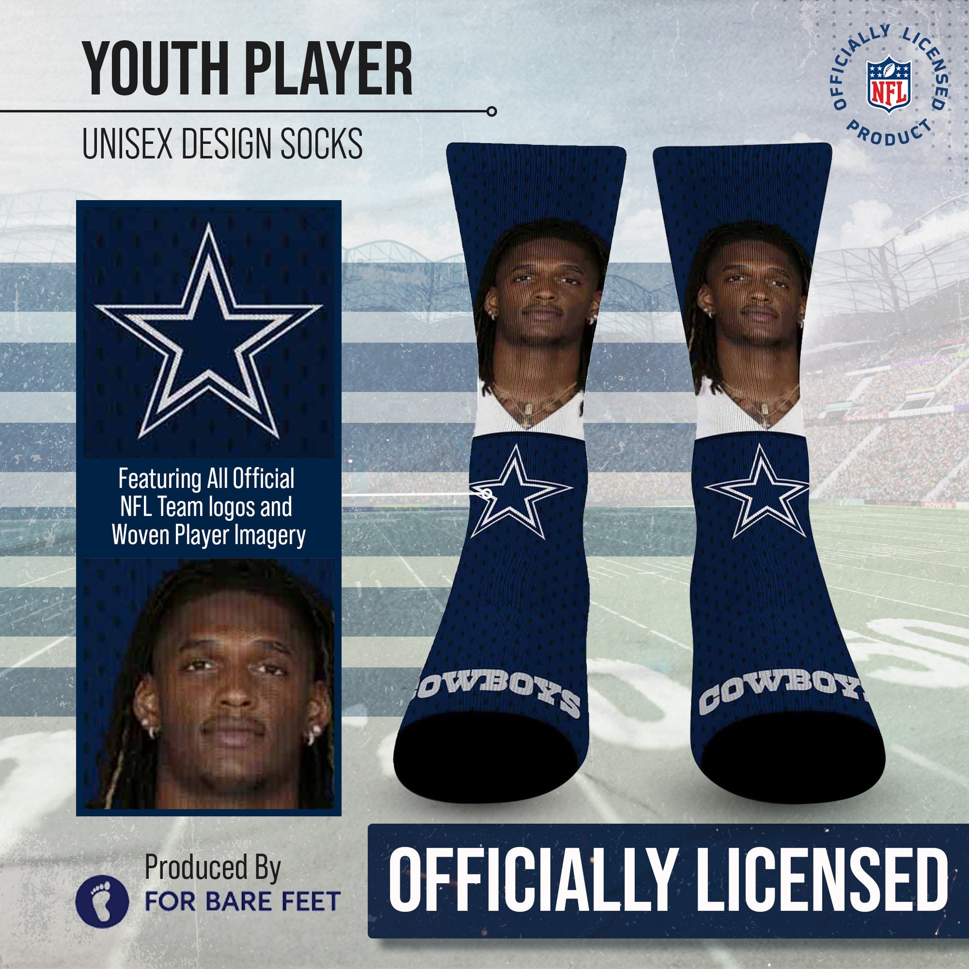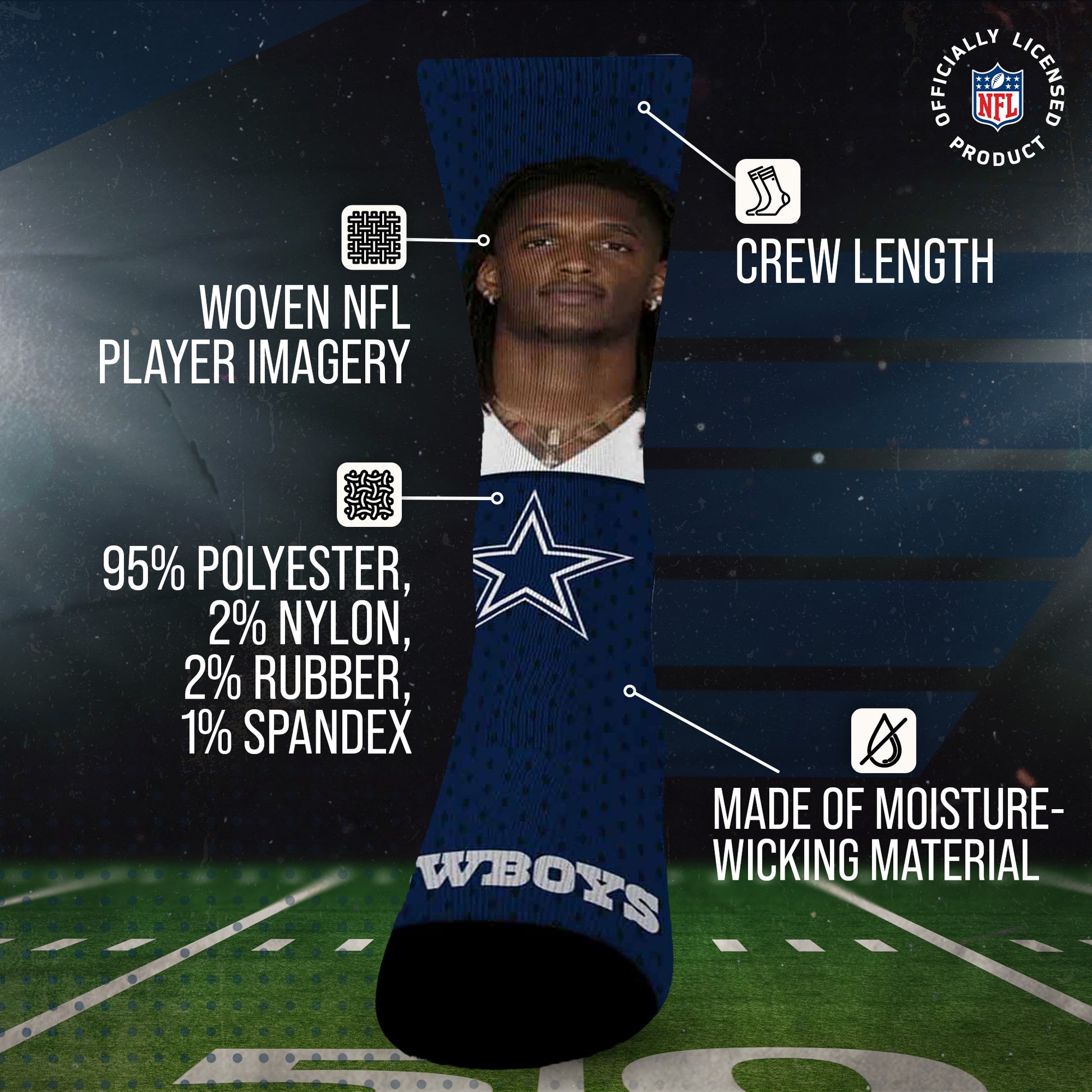 These youth Gameday Dallas Cowboys socks of your favorite player are great for showing off your Dallas pride from head to toe. These youth socks are comfortable, and are available in one size for all kids. The crew length and poly-spandex blend featuring a supportive formed heel make them a comfortable choice for showcasing your love for one of your favorite players and your Dallas pride all year long. These socks will be two of your favorite Dallas accessories. Wear them with your favorite team shirt or jersey to the stadium or the tailgate party for a true superfan gameday look, or rock them in the office for an original look on casual Friday. Put them on with a Dallas headband while you exercise, or pair them with pajamas while you put your feet up and enjoy the game in the house. These gameday socks are so comfortable, you can keep them on if you go to sleep! The woven likeness of your favorite player and officially-licensed Dallas colors and graphics make these socks so authentic you'll wish they were autographed. Fabric content is 95% polyester, 2% nylon, 2% rubber, and 1% spandex. Machine washable, tumble dry low."