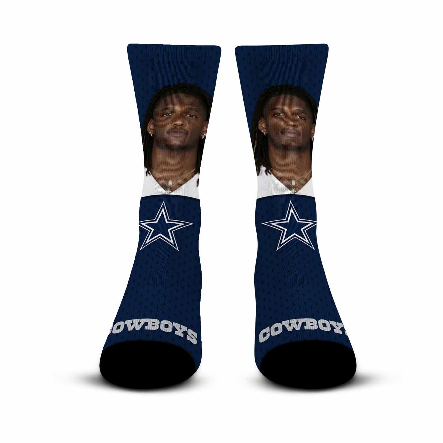 These youth Gameday Dallas Cowboys socks of your favorite player are great for showing off your Dallas pride from head to toe. These youth socks are comfortable, and are available in one size for all kids. The crew length and poly-spandex blend featuring a supportive formed heel make them a comfortable choice for showcasing your love for one of your favorite players and your Dallas pride all year long. These socks will be two of your favorite Dallas accessories. Wear them with your favorite team shirt or jersey to the stadium or the tailgate party for a true superfan gameday look, or rock them in the office for an original look on casual Friday. Put them on with a Dallas headband while you exercise, or pair them with pajamas while you put your feet up and enjoy the game in the house. These gameday socks are so comfortable, you can keep them on if you go to sleep! The woven likeness of your favorite player and officially-licensed Dallas colors and graphics make these socks so authentic you'll wish they were autographed. Fabric content is 95% polyester, 2% nylon, 2% rubber, and 1% spandex. Machine washable, tumble dry low."