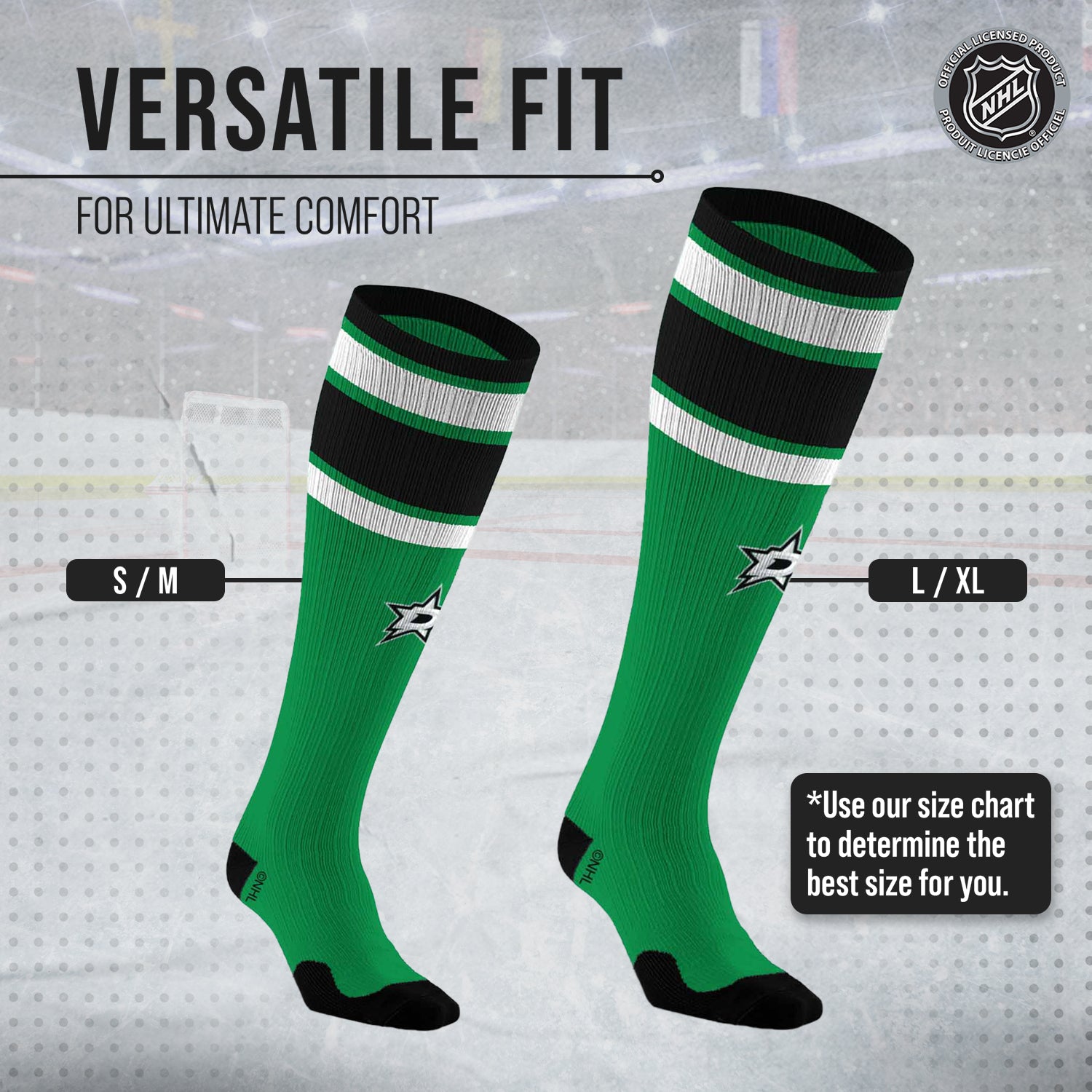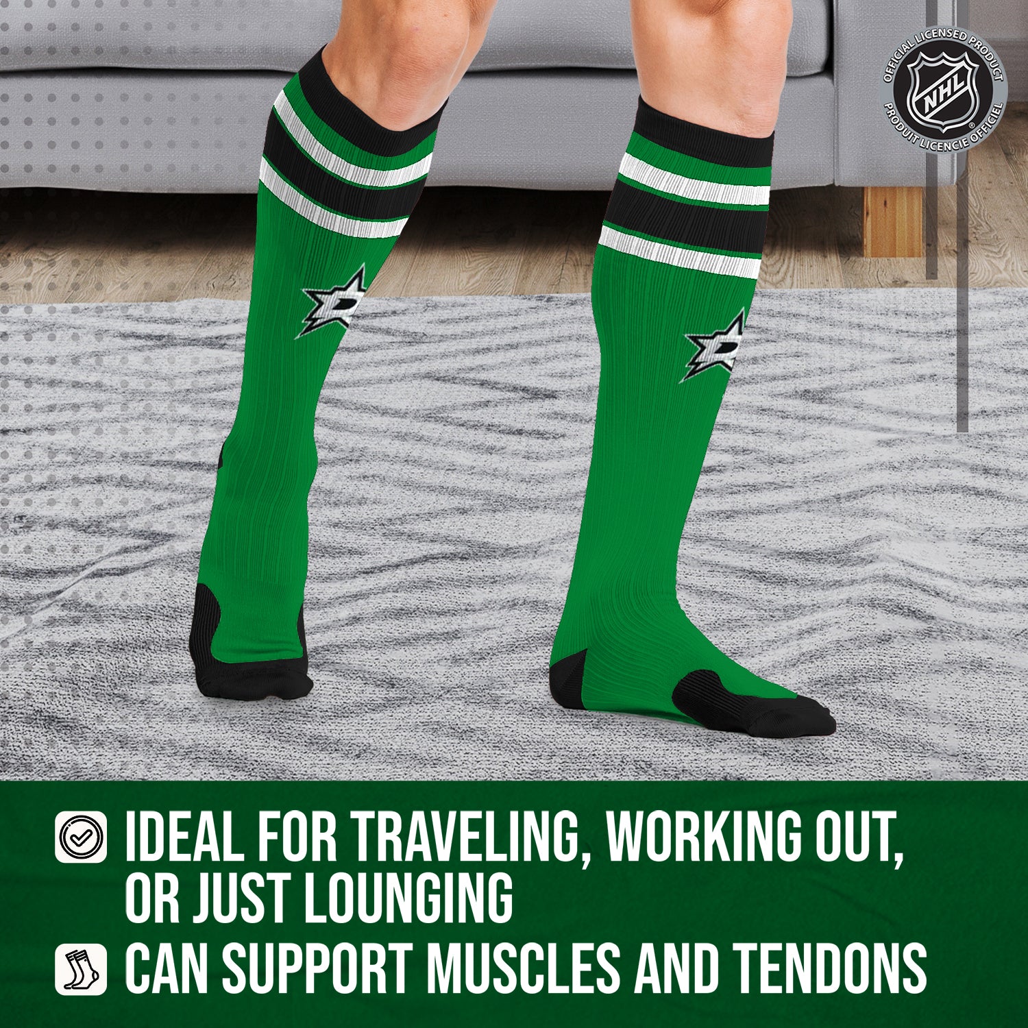 These Dallas Stars NHL knee-high performance socks are designed to support your muscles and tendons during exercise, as well as reduce soreness and swelling. With a true performance fit, our socks provide support where you need it most for the ultimate in athletics and recovery. Our proprietary blend of materials wicks moisture away from the skin to keep your feet dry and comfortable all day long. Two size options are available, so you can easily find a comfortable fit. Our Stars socks for women and men are the best performance socks and make great Dallas Stars gifts for men, Stars gifts, Stars gear, and Stars socks. If you are looking for high-quality performance socks, unisex compression socks, Stars merchandise, or Stars gear, these hockey socks are for you!