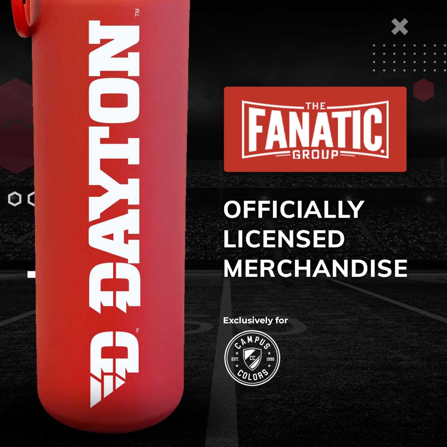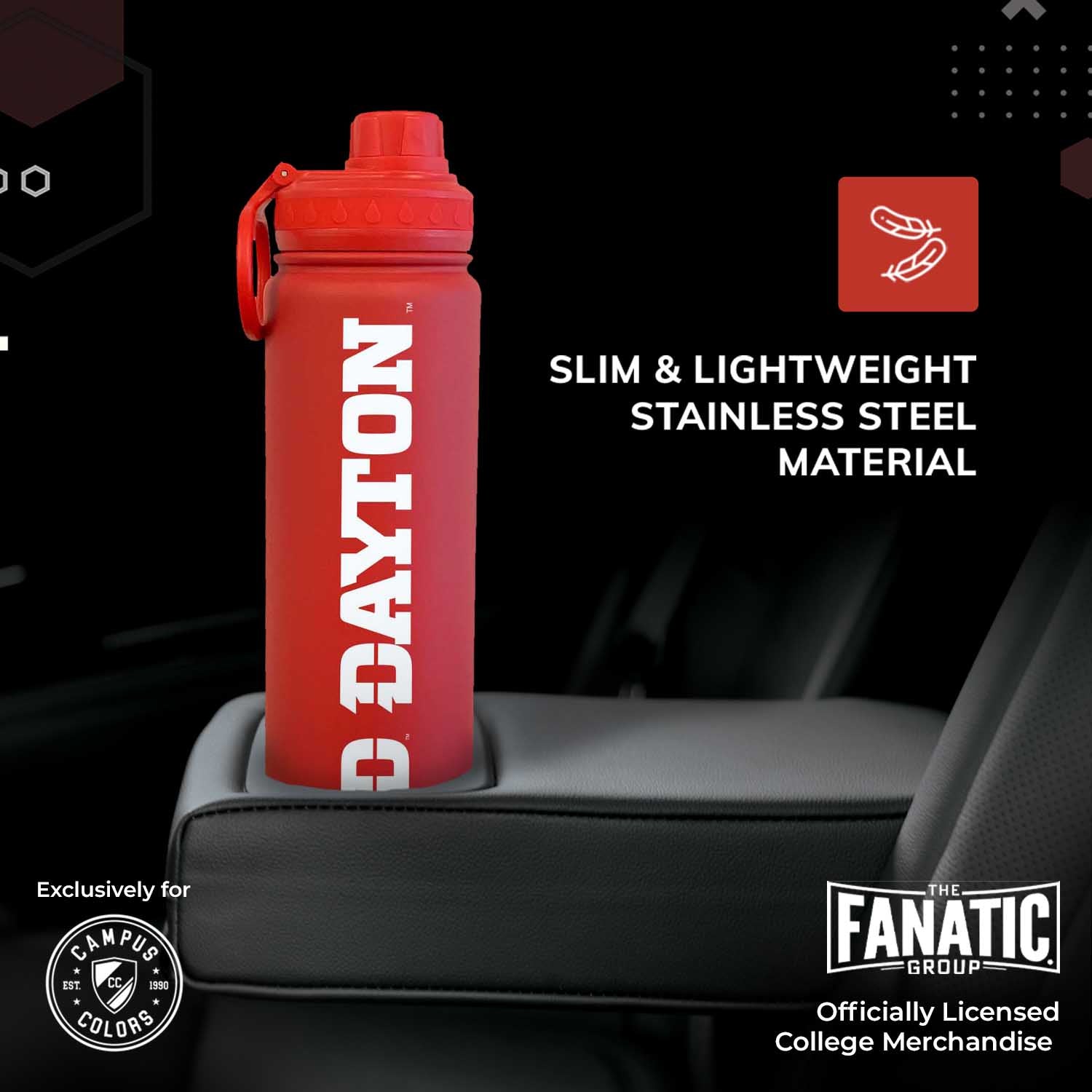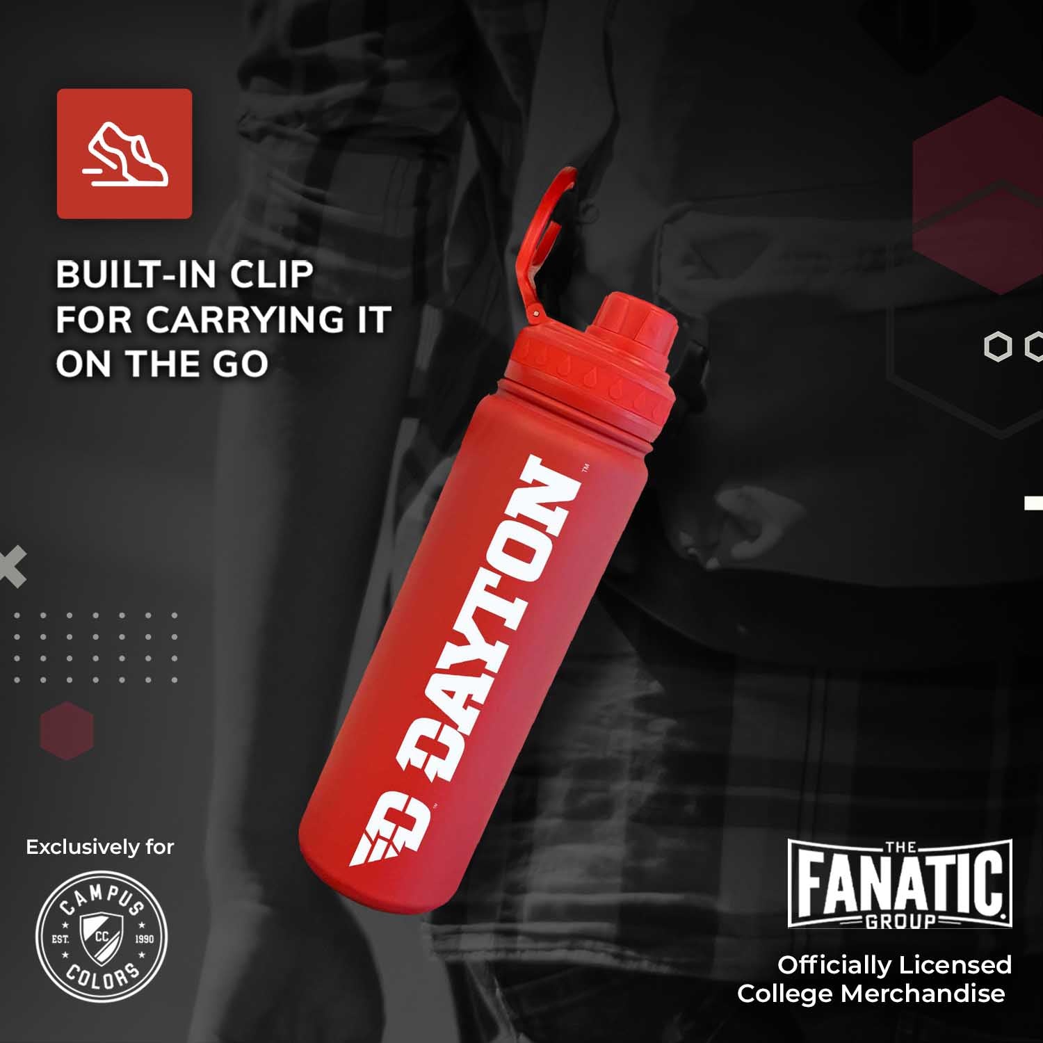 This officially licensed 24oz Dayton water bottle is the best accessory for any Dayton Flyers fan. You can use this water bottle 24 oz for water, sports drink, or even to keep your coffee hot. Our vacuum sealed sport bottle ensures that your drinks stay hot or cold for hours. You can bring this bottle along to sport games, hikes, or tailgates on game day. This sport water bottle 24 oz is a slim bottle that fits in most car cup holders for convenience. This stainless sports water bottle features an easy flow spout for the best drinking experience. The twist on cap features an easy drinking spout to make sipping a breeze. The bottle's lid twists on and off to reveal an easy drinking mouthpiece. The convenience of our double walled water bottles make them perfect for sports and everyday life! Show off your school spirit with this Dayton Flyers water bottle. This durable stainless sports water bottle make the perfect Dayton Flyers accessories for any activity. Our water bottle with clip for backpack is perfect for student campus life and busy alumni activities. Our vacuum sealed water bottles feature a built in handle. The easy grab bottle allows you to sip your water without spilling it on yourself while playing sports or walking to class. The college water bottle is coated in silicone for added grip and softer finish, and the exterior is sweat free so the Dayton water bottle won't drip on you. This insulated water bottle is the perfect birthday or Christmas gift for fans who love to collect Dayton stuff. Pair with other Dayton novelties or apparel for the ultimate Flyers gift for women and men. Dayton gear is great as birthday gifts for college students, alumni, and sport fans. With our Dayton Flyers water bottle, fans can show team pride and stay hydrated all day and every day!