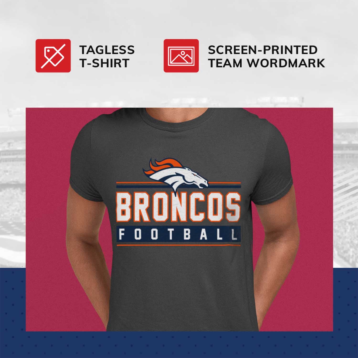 The True Fan womens and mens Denver Broncos t shirts are the ultimate light, soft, and comfortable tee. These Denver Broncos tshirts are the most versatile football apparel. Let us help you celebrate and showcase team pride with our durable and lightweight Denver Broncos t shirts for men and women. This tee features a quality, screen printed wordmark that will last wear after wear. The official wordmark design gives you the look of a loyal and seasoned sports fan and the unique heather, dual-blended material gives a trendy, distressed look without that heavy printed feel. Made of 50% ringspun cotton and 50% polyester, the dual blend material is extremely soft, smooth and comfortable. These Denver Broncos shirts for men and women comes without a tag, so you'll never feel annoyed or irritated by those pesky neck tags again! Quality [team short] t shirt makes the best birthday, Christmas, or graduation gifts for [team short] fans.