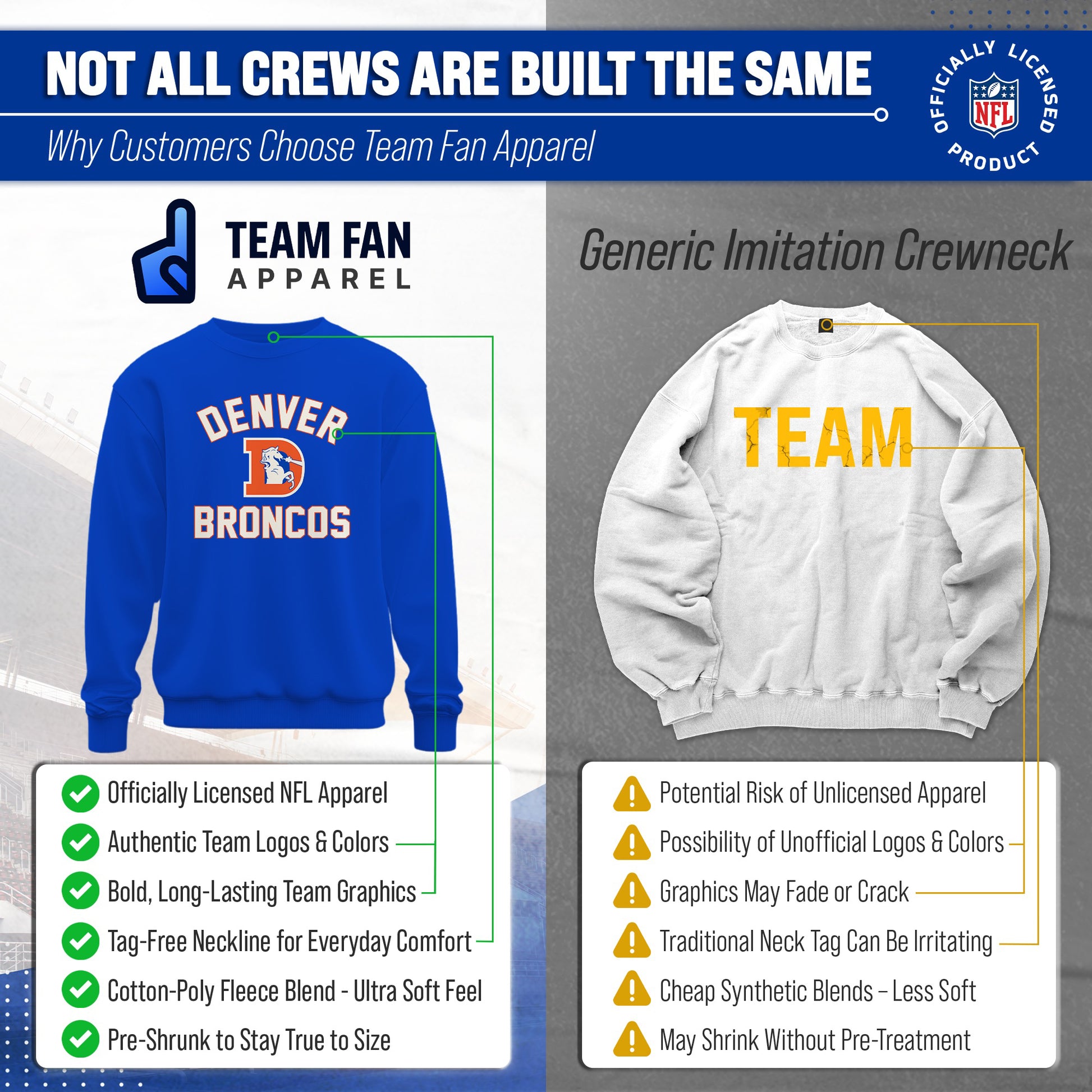 Get Ready to Show Your Team Spirit in the Most Comfortable Way Possible with Team Fan Apparel's Denver Broncos NFL Retro Gameday Crewneck Sweatshirt! Made with ultra-soft fleece material, this crewneck sweatshirt is perfect for game days or just lounging around the house. With its unique design and performance material, you can proudly represent your favorite team wherever you go. Not only is it officially licensed by the NFL, but it also comes in adult unisex sizing so both men and women can rock their team pride. The retro gameday design adds a vintage touch to your gameday attire, making you stand out from the crowd. So why settle for a basic sweatshirt when you can show off your style and support your team at the same time? Grab your NFL Retro Gameday Crewneck Sweatshirt from Team Fan Apparel today and get ready to cheer on your Broncos in ultimate comfort!