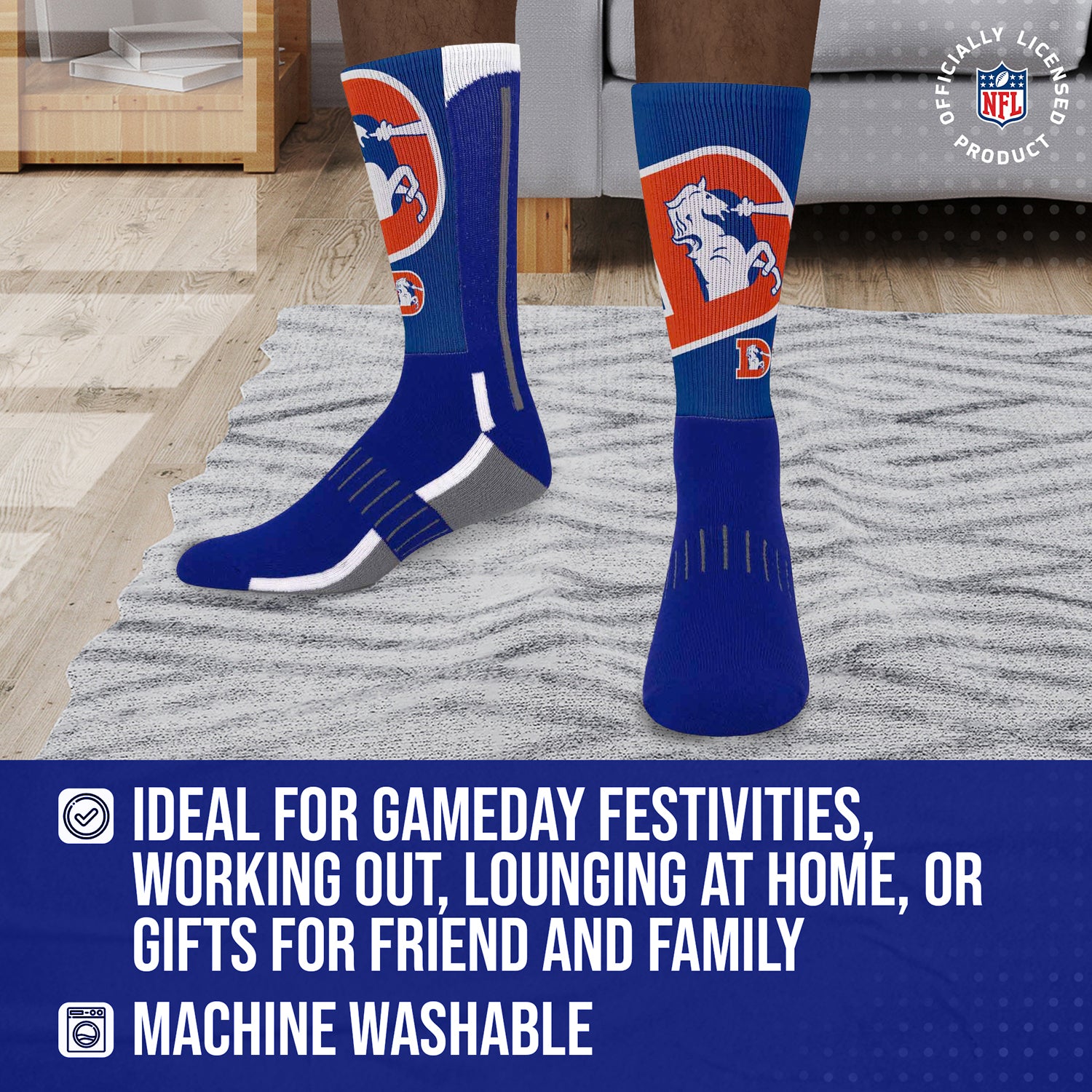 These Denver Broncos socks for children are great for showing off your Denver pride from head to toe. The unisex Denver youth socks are comfortable. The crew length and poly-spandex blend featuring a supportive formed heel make them a comfortable choice for showcasing your love for your team all year long. Denver youth socks are great additions to a collection of Denver Broncos stuff. Wear them with shorts, your favorite jersey, and Denver Broncos shoes for a superfan look, or rock them in the office for an alternative to argyle on casual friday. On a lazy day, wear them with your underwear or pajamas and Denver Broncos house shoes while you put your feet up and enjoy a game in the house. Denver Broncos youth socks make great birthday gifts for all ages. The officially-licensed team logo, colors, and graphics make these socks the Denver socks kid superfans will love. Fabric content is 95% polyester, 2% nylon, 2% rubber, and 1% spandex. Machine washable, tumble dry low.