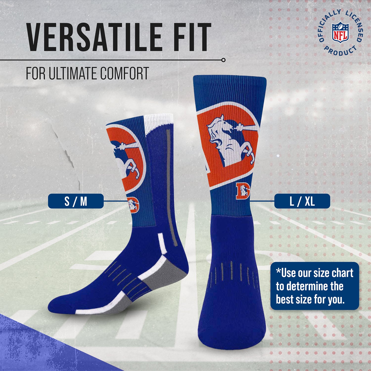 These Denver Broncos socks for children are great for showing off your Denver pride from head to toe. The unisex Denver youth socks are comfortable. The crew length and poly-spandex blend featuring a supportive formed heel make them a comfortable choice for showcasing your love for your team all year long. Denver youth socks are great additions to a collection of Denver Broncos stuff. Wear them with shorts, your favorite jersey, and Denver Broncos shoes for a superfan look, or rock them in the office for an alternative to argyle on casual friday. On a lazy day, wear them with your underwear or pajamas and Denver Broncos house shoes while you put your feet up and enjoy a game in the house. Denver Broncos youth socks make great birthday gifts for all ages. The officially-licensed team logo, colors, and graphics make these socks the Denver socks kid superfans will love. Fabric content is 95% polyester, 2% nylon, 2% rubber, and 1% spandex. Machine washable, tumble dry low.