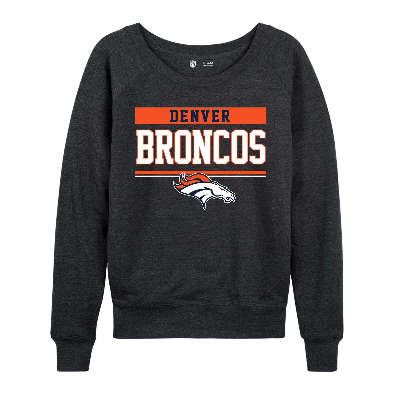 Our officially licensed womens Denver Broncos long sleeve charcoal crew neck pullover is super comfortable, has an oversized fit, and is great for showing off your Denver pride. The high-quality thermal printed logo and wordmark will look fresh after years of wear, making it a great alternative to wearing a Denver Broncos womens jersey. Our womens long sleeve slouchy crewneck has a relaxed fit for a casual, comfortable look. The long sleeve Denver crew will look great with shorts at tailgates in warmer months, or with jeans or leggings when it gets cooler. Layer it with a hoodie or even a Denver football jersey when the weather gets cold. Available in plus sizes up to 3XL, this is a Denver Broncos pullover that women who are plus size or straight size will feel comfortable in. If you're looking to give the gift of ladies Denver apparel, our long sleeved Denver Broncos Slouchy Crew is the perfect gift. Officially licensed to ensure no counterfeit designs or colors, these Denver crews for women are perfect for super fans. Made from a cotton poly blend to keep you comfortable, the womens raglan long sleeve Gameday Slouchy Crew will definitely become one of your favorite pieces of Denver Broncos apparel.