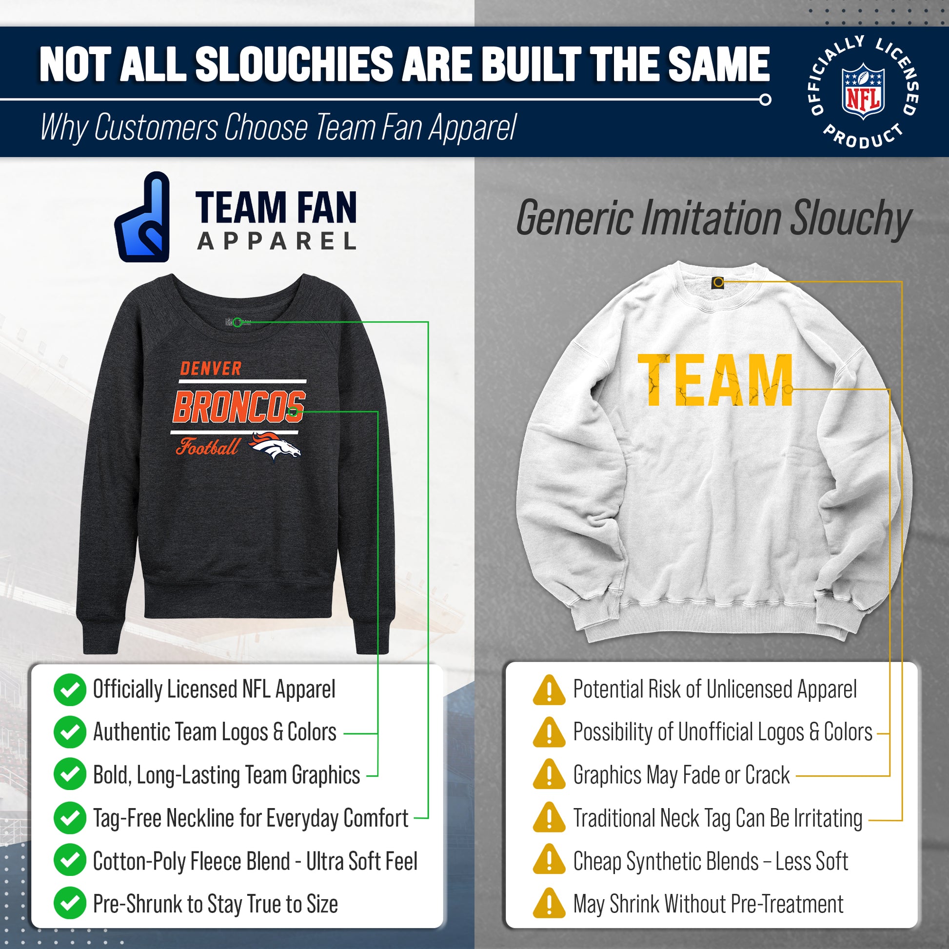 Our officially licensed Denver Broncos long sleeve crew neck pullover is super comfortable, runs true to size, and is great for showing off your Broncos pride. The high-quality thermal printed logo will look fresh after years of wear, making it a great alternative to wearing a Denver Broncos womens jersey. Our womens long sleeve Gameday crewneck has a relaxed fit for a casual, comfortable look. The long sleeve Broncos crew will look great with shorts at tailgates in warmer months, or with jeans or leggings when it gets cooler. Layer it with a hoodie or even a Denver football jersey when the weather gets cold. Available in plus sizes up to 3XW, this is a Denver Broncos pullover that women who are plus size or straight size will feel comfortable in. If you're looking to give the gift of ladies Broncos apparel, our long sleeved Denver Broncos Slouchy Crew is the perfect gift. Officially licensed to ensure no counterfeit designs or colors, these Denver crews for women are perfect for super fans. Made from a cotton poly blend to keep you comfortable, the womens raglan long sleeve Gameday Slouchy Crew will definitely become one of your favorite pieces of Denver Broncos apparel.