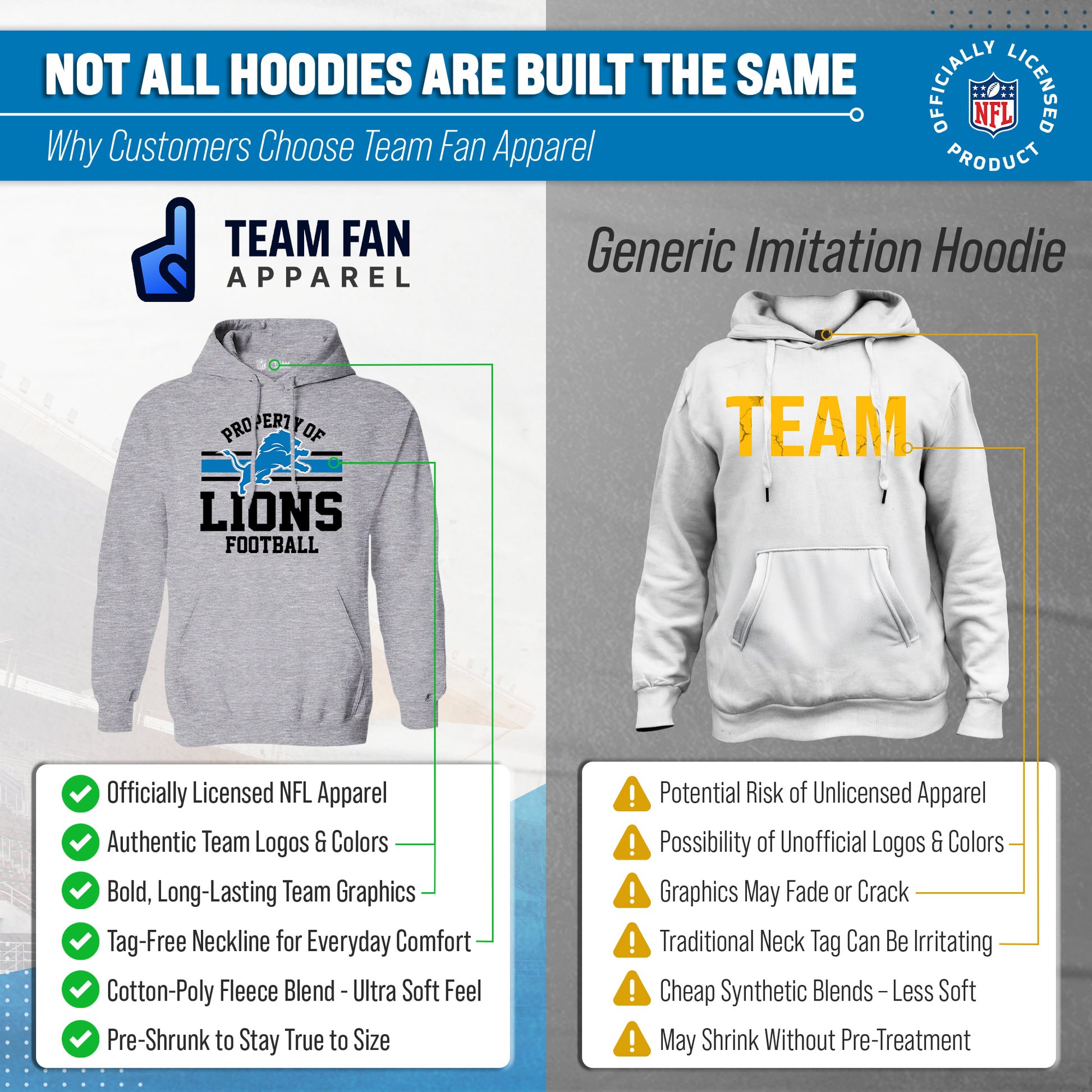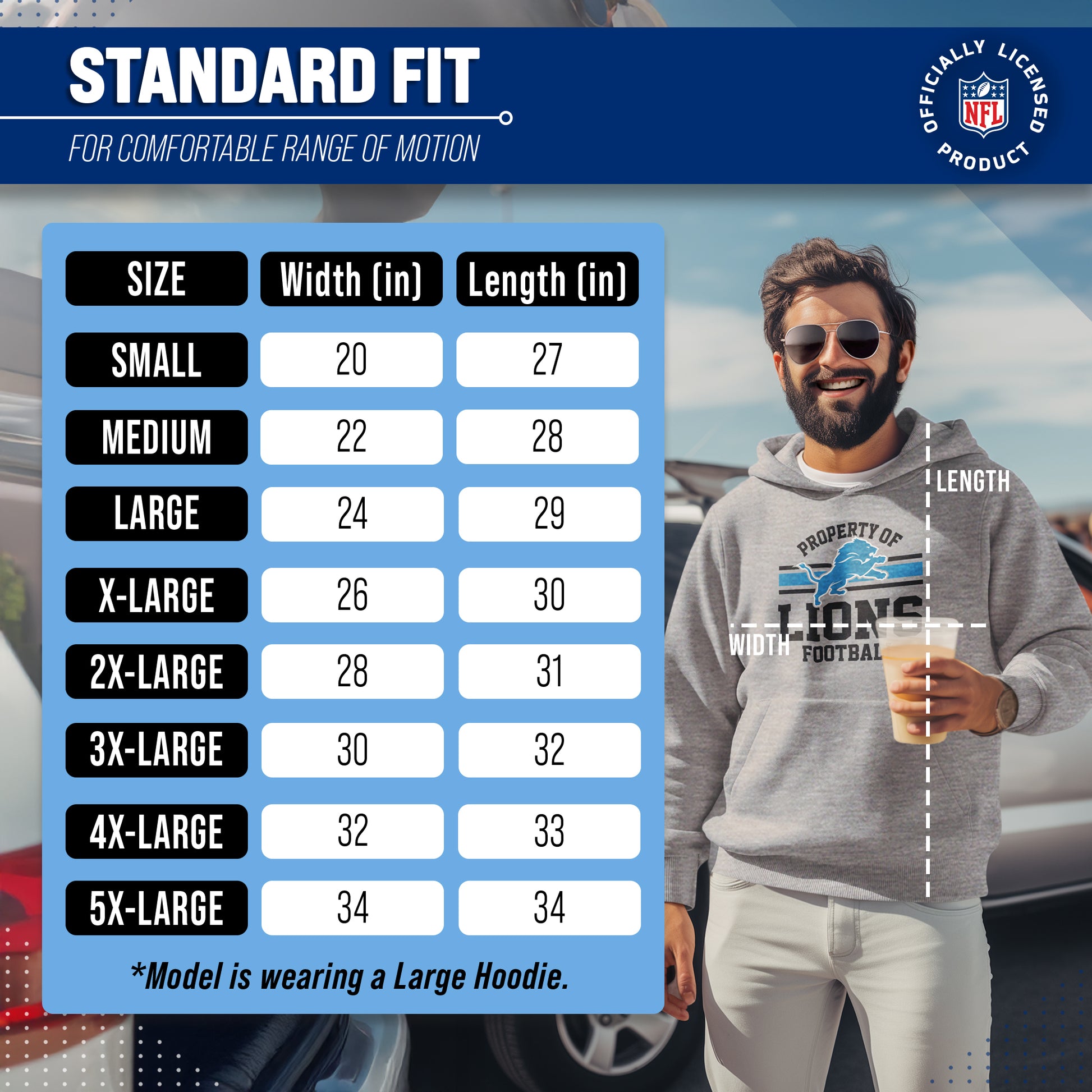 Our Property of Detroit Lions hooded sweatshirt is a pro football hoodie with 8.5 oz fleece lining that features official Property of graphics. Our hoodies for men and women are super comfortable, run true to size, and are great for showing your Lions pride all year long. The tagless Detroit hooded sweatshirt is perfect for tailgates, gamedays, and showing off your team spirit. Our pullover hoodies are ideal Detroit gifts for men and women football fans and the unisex fit makes them ideal for both men and women. The Detroit hoodie is essential apparel for protecting yourself from the elements. The fleece material, ribbed cuffs, and waistband keep all the warmth in, so there's no need for a jacket in the fall months, our hoodie sweatshirts have you covered. These comfortable hoodies feature the official Detroit Lions colors and graphics. The graphics will stay crisp and wear after wear and year after year. This pro football sweatshirt is designed for comfort. The pro football hooded sweatshirt features ribbed cuffs and waistband, jersey lined hood with metal eyelets, adjustable drawstrings, and a spacious front pouch pocket. Show your team pride with this Property of Lions sweatshirt! This hoodie is pre-shrunk and made from a dual blend of cotton poly fleece that is ideal for that tailgate or gameday when the temperature drops. The football sweatshirts for women and men help you gear up and get ready to cheer the Detroit Lions to victory.