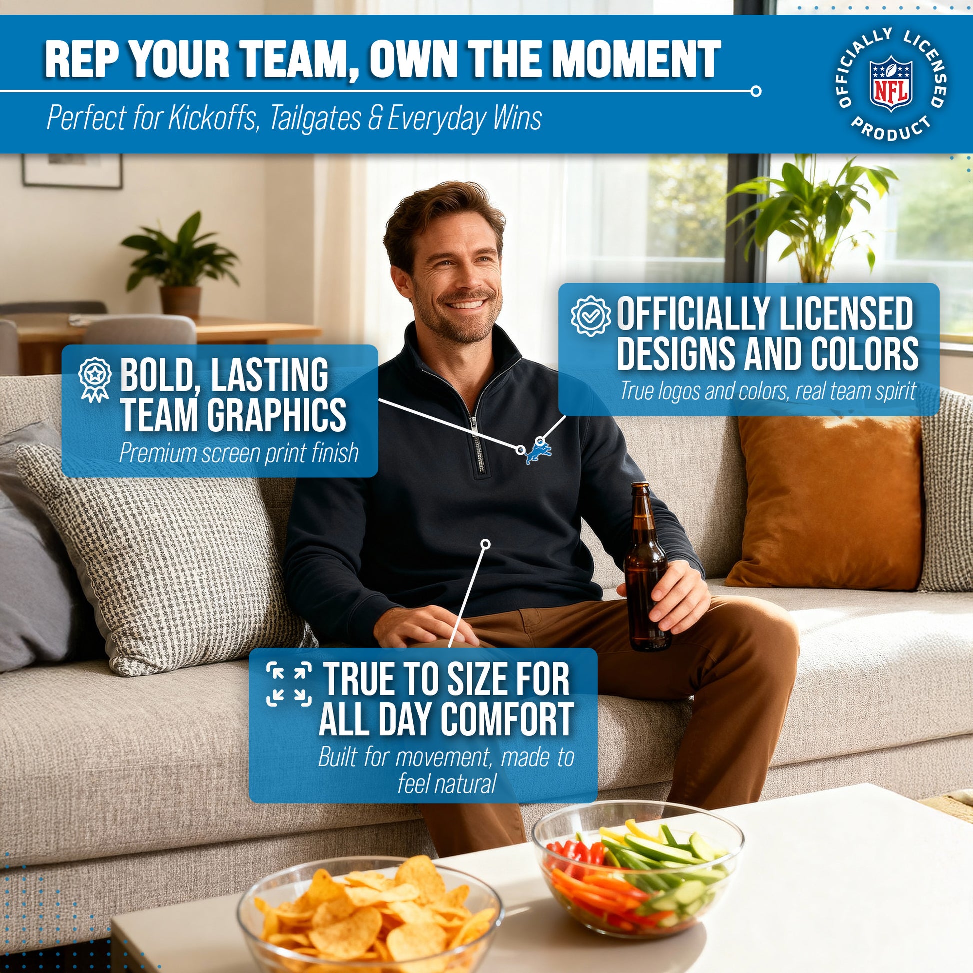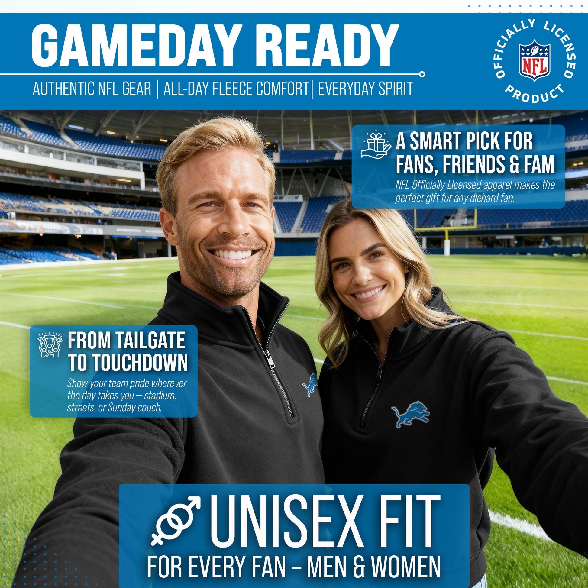 Show off your Detroit Lions pride with the officially licensed NFL Team Logo 1/4 Zip Fleece Pullover Sweatshirt! Designed with fans in mind, this cozy and stylish pullover is the perfect way to represent your favorite team all season long. Crafted with ultra-soft fleece fabric, it delivers warmth and comfort whether you’re braving chilly stadium seats, tailgating with friends, or simply cheering on the Lions from home. The classic quarter-zip design adds versatile style and makes layering easy, so you can throw it on over a tee or under a jacket as the temperature drops. With the authentic Detroit Lions logo proudly displayed on the front left chest, your loyalty will be clear to everyone around you. No matter where game day takes you, this pullover is a statement piece that showcases true Lions spirit. Made for both men and women, this sweatshirt features a flattering unisex fit that looks great on all body types. It’s available in a full range of sizes to ensure every Lions fan finds the right fit. Whether you’re hunting for your next go-to tailgate outfit, upgrading your cold-weather game-day look, or shopping for the perfect gift for a fellow football fan, this 1/4 zip fleece is an unbeatable choice. Durable, versatile, and stylish, the Detroit Lions 1/4 Zip Fleece Pullover Sweatshirt is a must-have addition to any fan’s wardrobe. From Sunday kickoffs to casual everyday wear, you’ll stay warm, comfortable, and proud to rep the Lions every time you put it on. Don’t miss your chance to gear up—this essential fan favorite is ready to help you cheer on your team in style!