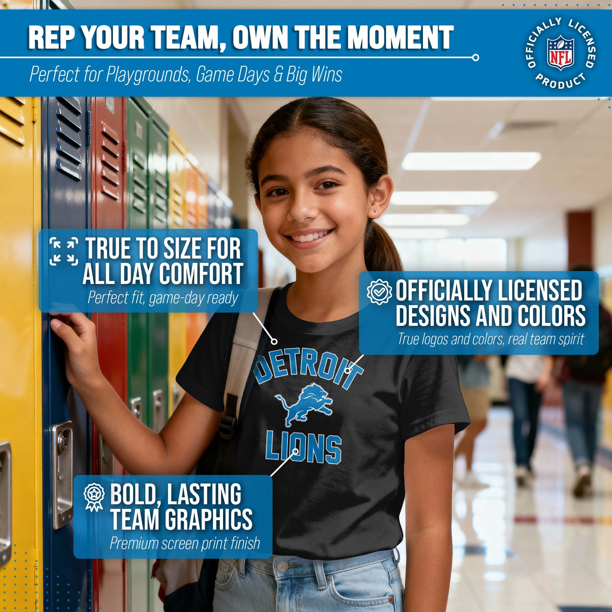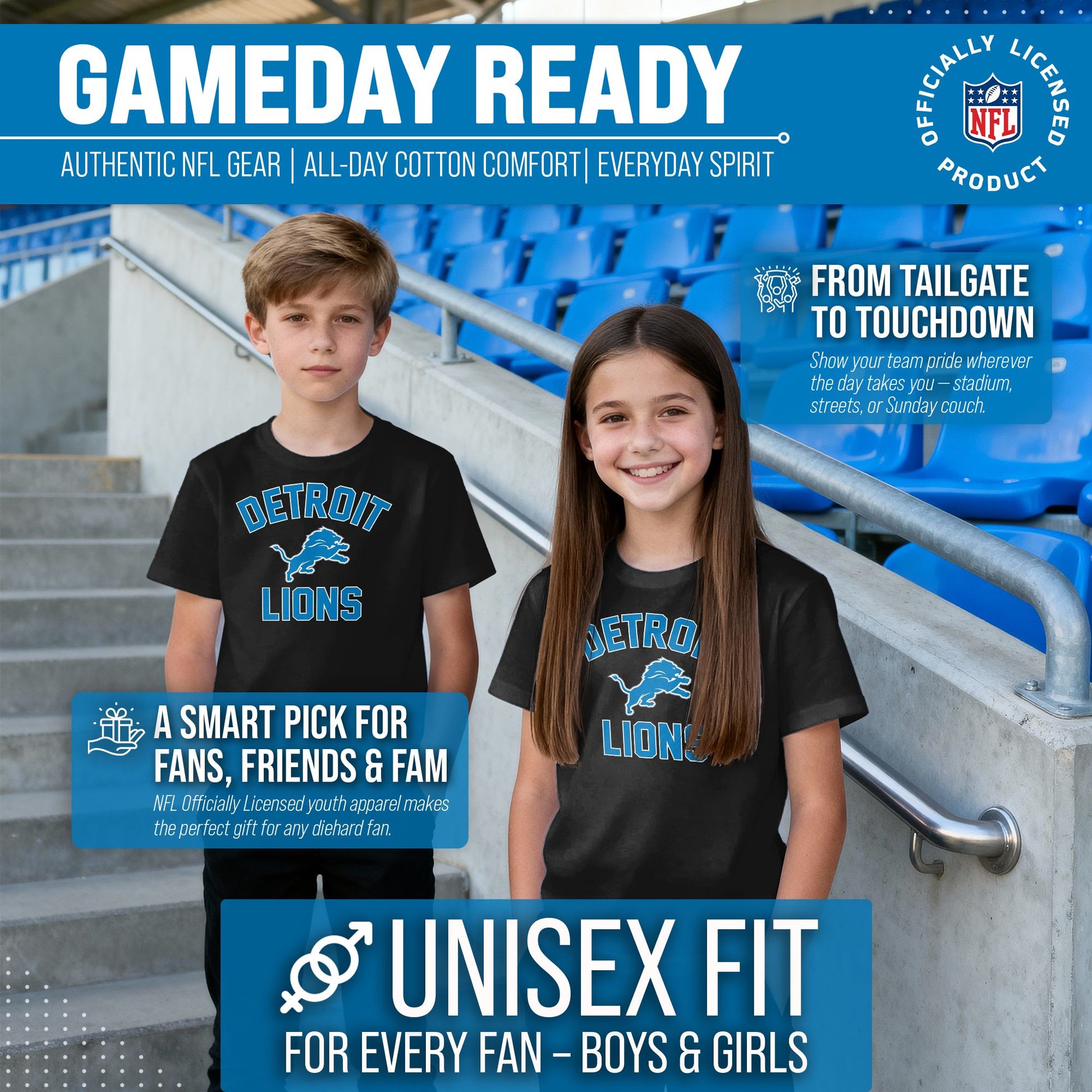 There's nothing more exciting than a much-anticipated gameday. Our Youth Gameday Detroit Lions football tshirt is the ideal shirt to wear on gameday whether you're at the game, or watching from the comfort of your own home. This Detroit tshirt is super comfortable, runs true to size, and is great for showing team pride all year long! The semi-fitted style makes this the perfect Lions youth shirt for both boys and girls. Our shirts really are the perfect fan apparel for school and sports games. The youth gameday shirt is lightweight and ideal for warmer weather or as an extra layer during colder months. Our Lions shirts for boys and girls are essential apparel for young football fans. Our tagless Detroit Lions youth shirt ensures the most comfortable fit. This semi-fitted tshirt is made from a 50/50 cotton/polyester blend; contrast shoulder to shoulder neck tape and 1x1 rib knit neck makes for comfortable fit around the neck and shoulders. This high quality shirt for kids features a double-needle sleeve and bottom hems. These are high quality Lions graphic shirts for girls and boys. The vivid graphics will stay crisp wear after wear, and year after year. The thermal printed graphics are high definition, official true team colors, and also resist fading. This Detroit tshirt is made with high stitch density for smoother printing surface. Our official shirts for boys and girls make the best gifts. This piece of Detroit Lions apparel is the perfect birthday or Christmas gift for any young football fan. This tee is absolutely perfect for school, stadium fun, or watching the game at home.