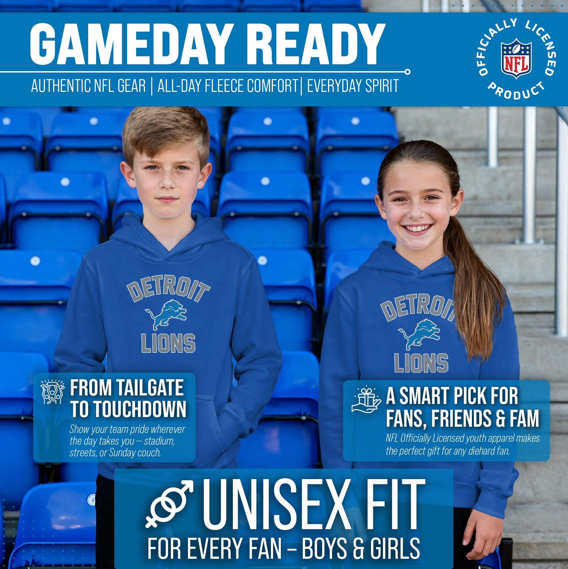 Our youth gameday Detroit Lions football pullover hoodie with a front pouch pocket is the ideal sweatshirt to wear on gameday. This Lions hoodie for kids is comfortable and great for showing team pride all year long. This is an essential piece of girls and boys football apparel for pro football fans. Our team-colored hoodie sweatshirts are the perfect fan apparel for school and sports games. This hooded pullover with a pocket is ideal for warm or cold weather games. Lions football pullover hoodie is made from a cotton poly blend material with raglan sleeves. These youth pro football sweatshirts have high quality features. Our youth gameday pullover hoodies feature 1x1 ribbing at cuffs and waistband. This Detroit hoodie youth sweatshirt has a twill neck tape. The raglan sleeves add a sophisticated look to these pro football team hoodies for boys and girls. This tagless sweatshirt ensures the most comfortable fit for boys and girls. The standard fit makes our football team hoodies for boys and girls the perfect kids sweatshirt for young fans. The thermal printed graphics are high definition, true to authentic team color, and resist fading. Our hoodies also make the best Lions gifts for boys and girls. Youth football apparel is the perfect birthday gift for any professional sports fan. Our youth football team hoodies for boys and girls are great for wearing to school, the stadium, or while you're watching the game at home.
