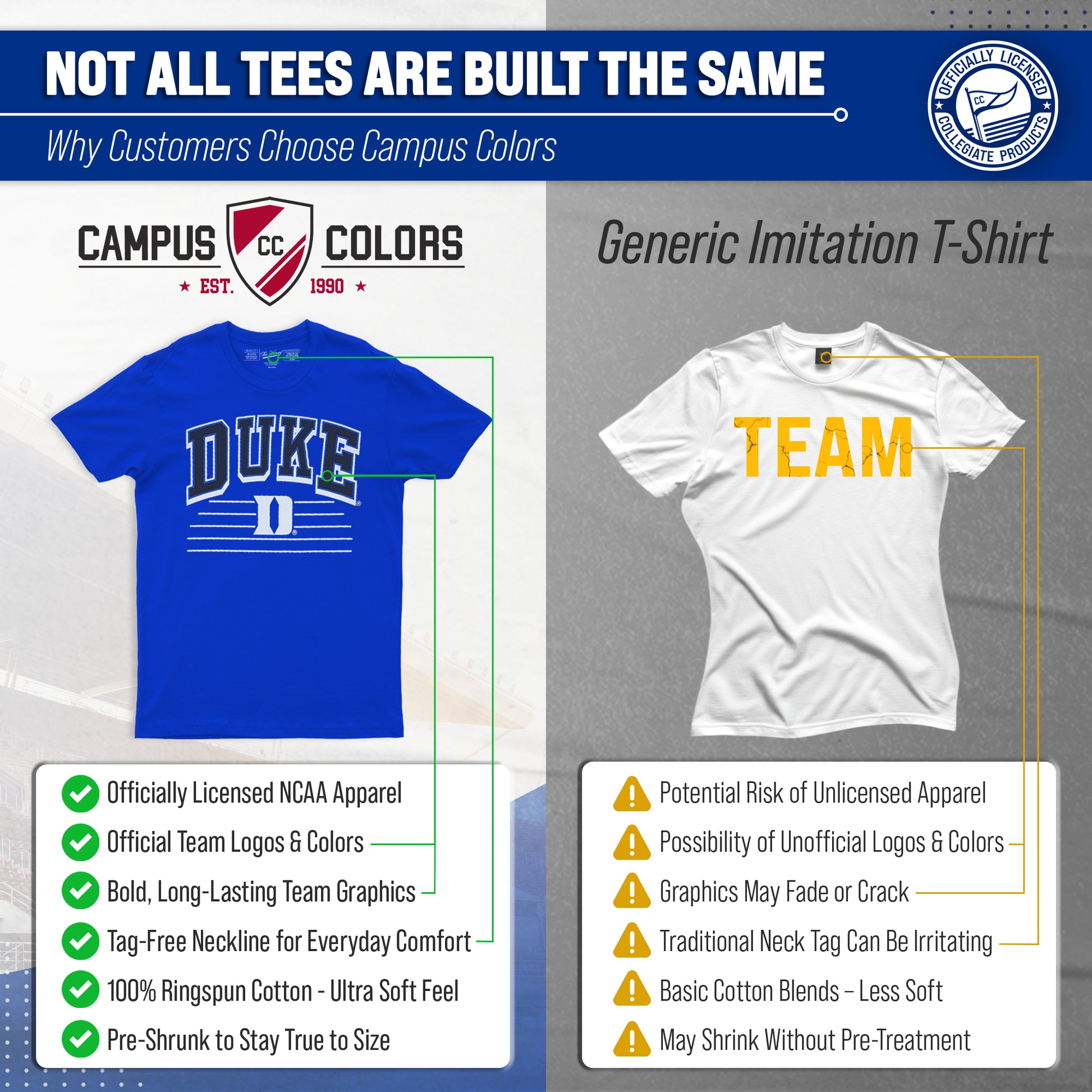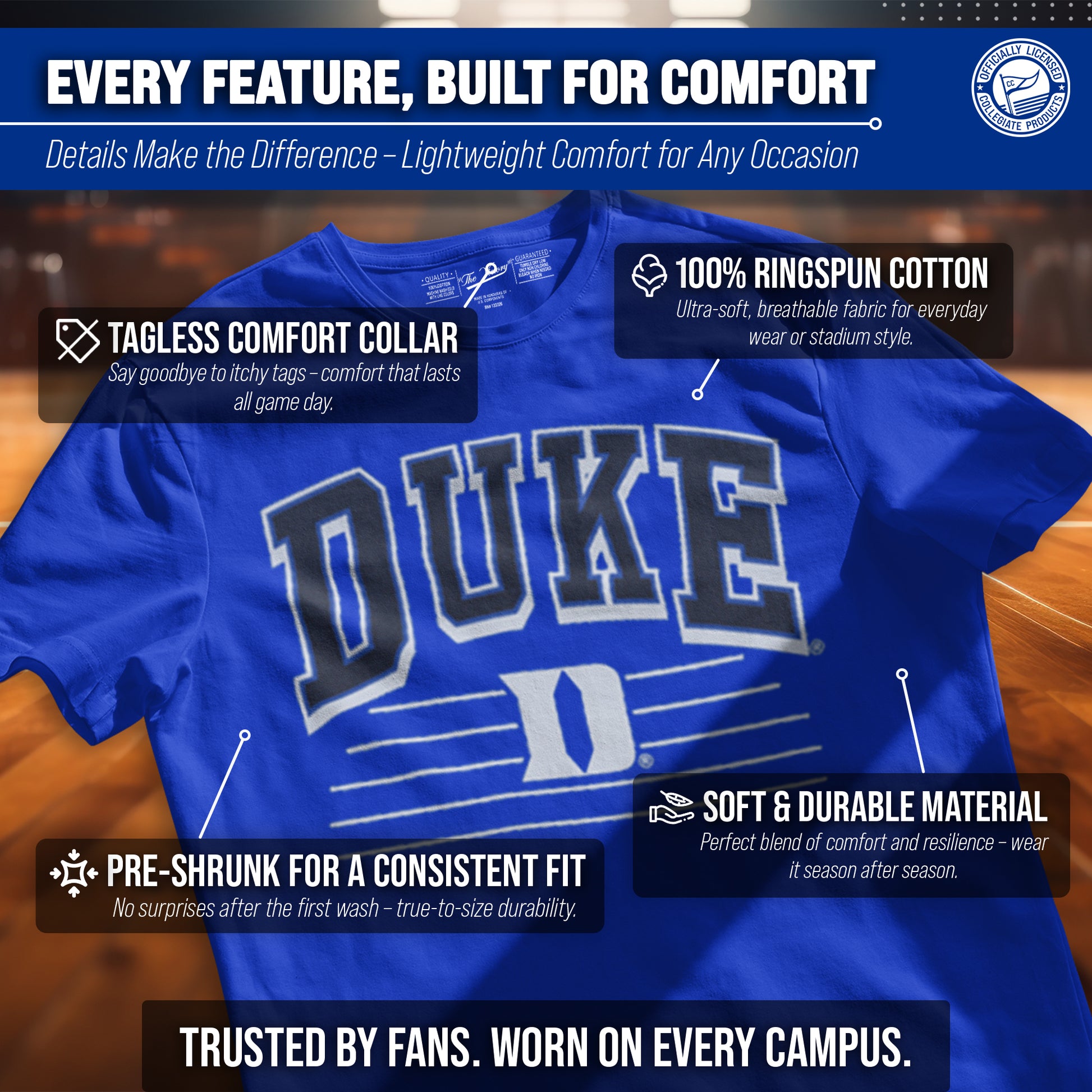 Go Team, Go! Show off your school spirit with the NCAA Adult Unisex Overtime Classics Duke Blue Devils T-Shirt! Our officially licensed apparel will have you feeling like a member of the team! Made from comfortable and breathable cotton and featuring a teamcolor garment, this t-shirt is perfect for game days, tailgates, or just lounging around. The tag-less design ensures ultimate comfort and no annoying tags to distract you from cheering on your team. Perfect for wearing to the big game, watching from home, hanging with friends, or even working out! Our Overtime CLassics Duke Blue Devils shirt makes a great gift for yourself, or any Blue Devils fan in your life! Our shirts are made from ringspun cotton for a soft feel against your skin and features a classic design highlighting your favorite college team. With short sleeves and a variety of sizes to choose from, these t-shirts are perfect for men and women alike. So gear up for game day with the NCAA Adult Unisex Overtime Classics T-Shirt - the perfect addition to any Duke Blue Devils fan's wardrobe!