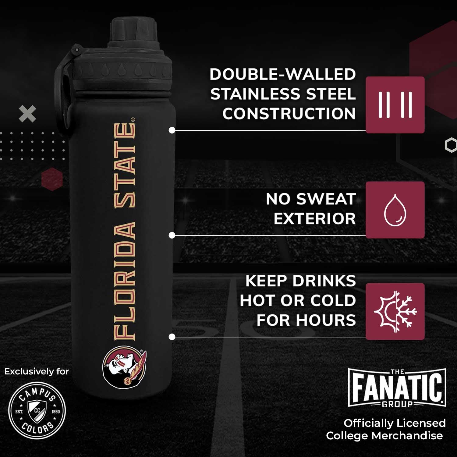 This officially licensed 24oz Florida State water bottle is the best accessory for any Florida State Seminoles fan. You can use this water bottle 24 oz for water, sports drink, or even to keep your coffee hot. Our vacuum sealed sport bottle ensures that your drinks stay hot or cold for hours. You can bring this bottle along to sport games, hikes, or tailgates on game day. This sport water bottle 24 oz is a slim bottle that fits in most car cup holders for convenience. This stainless sports water bottle features an easy flow spout for the best drinking experience. The twist on cap features an easy drinking spout to make sipping a breeze. The bottle's lid twists on and off to reveal an easy drinking mouthpiece. The convenience of our double walled water bottles make them perfect for sports and everyday life! Show off your school spirit with this Florida State Seminoles water bottle. This durable stainless sports water bottle make the perfect Florida State Seminoles accessories for any activity. Our water bottle with clip for backpack is perfect for student campus life and busy alumni activities. Our vacuum sealed water bottles feature a built in handle. The easy grab bottle allows you to sip your water without spilling it on yourself while playing sports or walking to class. The college water bottle is coated in silicone for added grip and softer finish, and the exterior is sweat free so the Florida State water bottle won't drip on you. This insulated water bottle is the perfect birthday or Christmas gift for fans who love to collect Florida State stuff. Pair with other Florida State novelties or apparel for the ultimate Seminoles gift for women and men. Florida State gear is great as birthday gifts for college students, alumni, and sport fans. With our Florida State Seminoles water bottle, fans can show team pride and stay hydrated all day and every day!