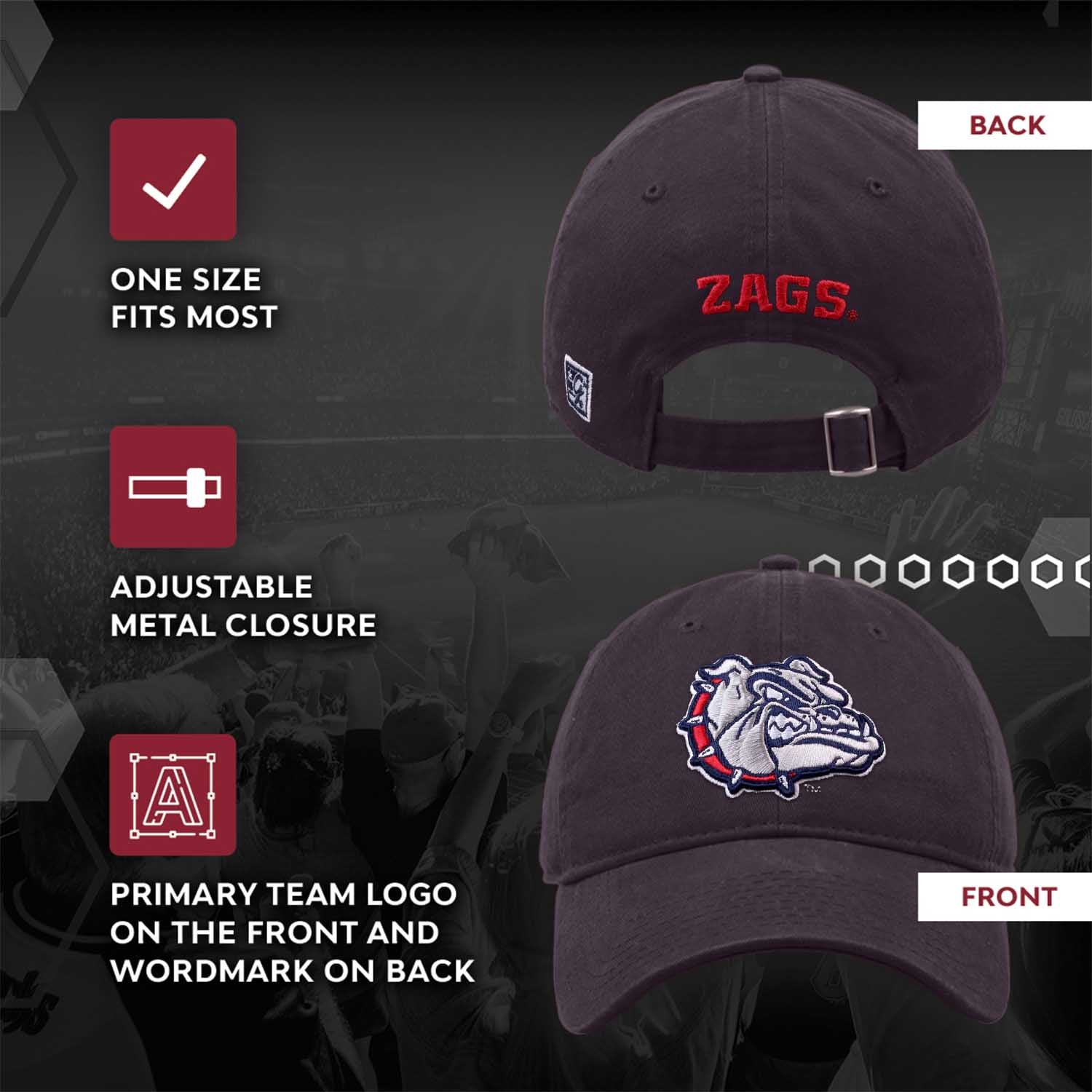 This Gonzaga hat is a must-have for any Bulldogs fan! These college hats are made from 100% cotton and garment-washed twill, and are durable and comfortable to wear. The garment-washed fabric gives this vivid Gonzaga hat a cool, stylish, and fashionable look. The Gonzaga Bulldogs logo is embroidered on the front, with the team wordmark on the back. The relaxed, unstructured hat design feels soft & easy to wear, making it a good dad baseball hat for everyday wear. The adjustable metal closure ensures a one size fits all. If you are looking for the perfect Gonzaga gift for Father's Day, look no further than the Gonzaga Bulldogs dad hat! Wear it with the classic Gonzaga Bulldogs apparel on game day with your Gonzaga Bulldogs clothes and Gonzaga Bulldogs merch, or wear it out running errands. This Gonzaga cap is a staple in every Bulldogs fan's apparel. Show your support for Gonzaga this baseball hat. Show your love for soccer, baseball, basketball, and hockey all year long.