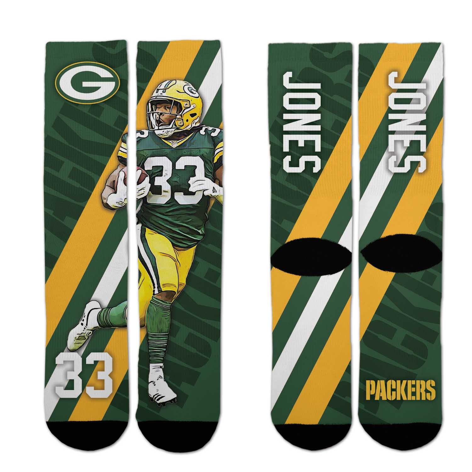 These Adult Green Bay Packers Player Stripe Crew Socks are great for showing off your Packers pride from head to toe. These unisex socks are comfortable, and are available in a range of sizes. The crew length and poly-spandex blend featuring a supportive formed heel make them a comfortable choice for showcasing your love for your favorite player and your Packers pride all year long. These socks will be your new favorite game day accessory. Wear them with your favorite Green Bay Packers shirt or jersey, to the stadium or the tailgate party for a true superfan gameday look, or rock them in the office for an original look on casual friday. Put them on with a Packers shorts while you exercise, or pair them with pajamas while you put your feet up and enjoy the game in the house. These player stripe crew socks are so comfortable, you can even keep them on when you go to sleep! The woven likeness of your favorite player and officially-licensed Green Bay Packers colors and graphics make these crew socks so authentic you'll wish they were autographed. Fabric content is 95% polyester, 2% nylon, 2% rubber, and 1% spandex. Machine washable, tumble dry low.