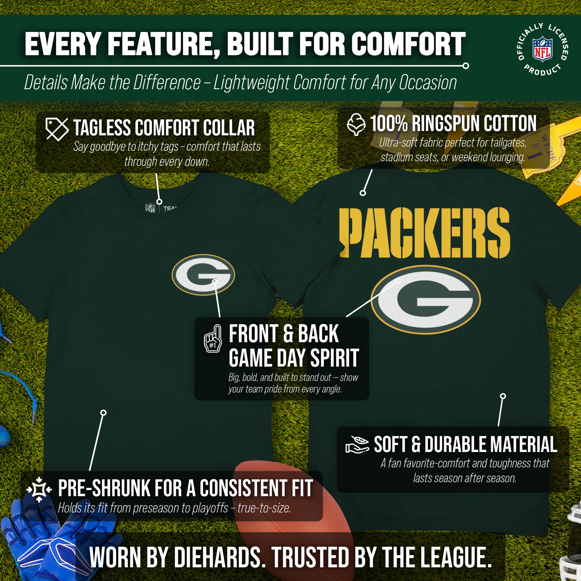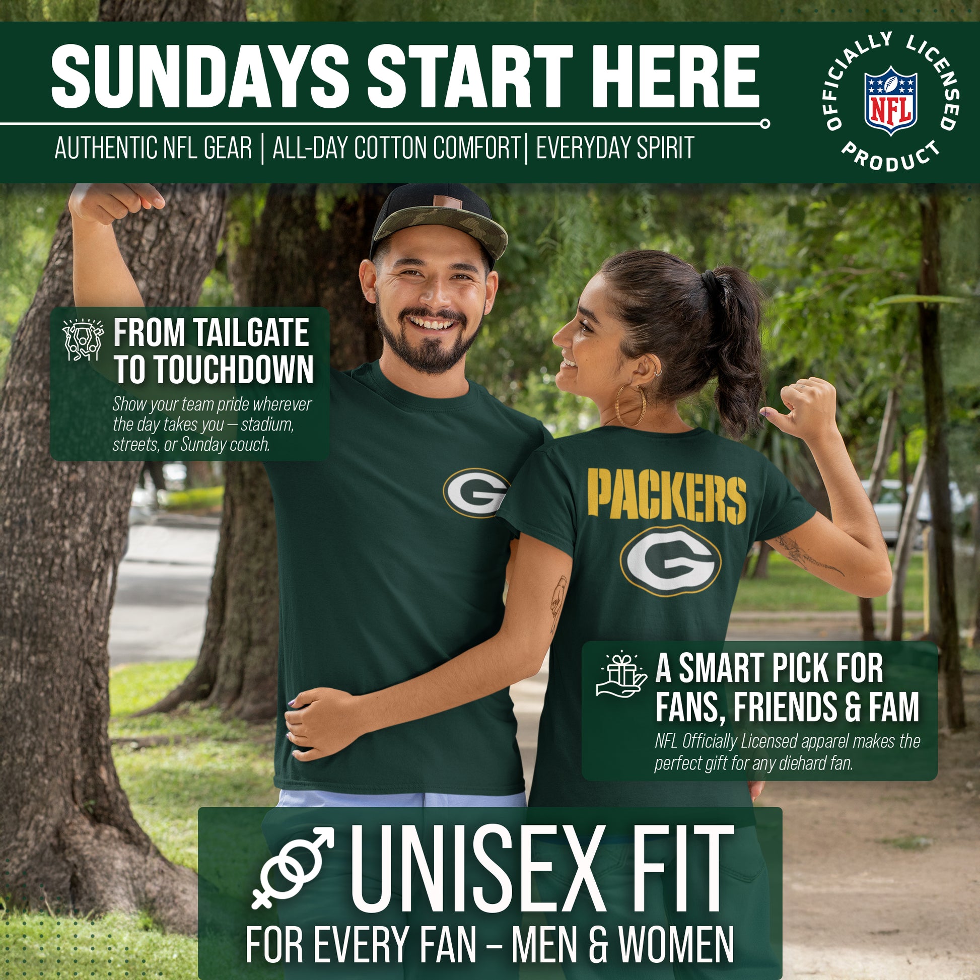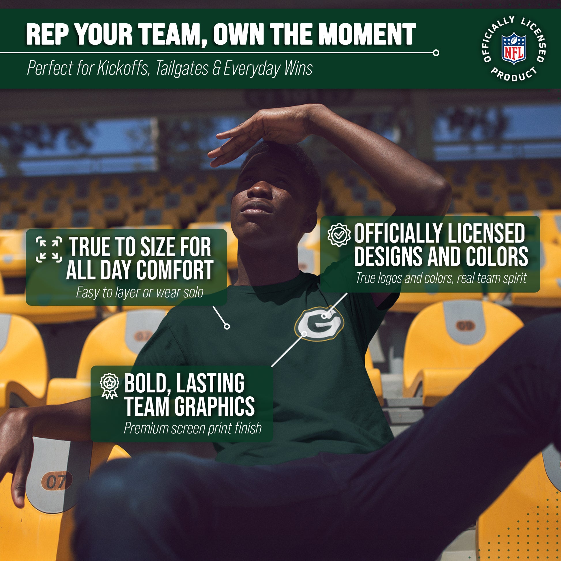 Represent your favorite team in the officially licensed, soft & comfortable Green Bay Packers Final Countdown Tee! If you are looking for the best Green Bay Packers t-shirt to wear on game day, look no further than our Green Bay Packers shirt for men and women. The cotton & polyester blend ensures that this shirt is easy to wear all day. It features the official Green Bay Packers graphics on the front & back of the shirt in bright colors, so there's no mistaking which team you are rooting for. The tagless t-shirt design ensures our t-shirt is comfortable for Green Bay Packers fans with sensitive skin. This Green Bay Packers unisex shirt for men and women is the perfect Packers shirt for men and women and Packers t-shirt for men and women. If you are looking for the best Packers gifts for men, Green Bay Packers gifts for women, or Green Bay Packers gear, look no further than our cotton Green Bay Packers t-shirt! Get yours today.
