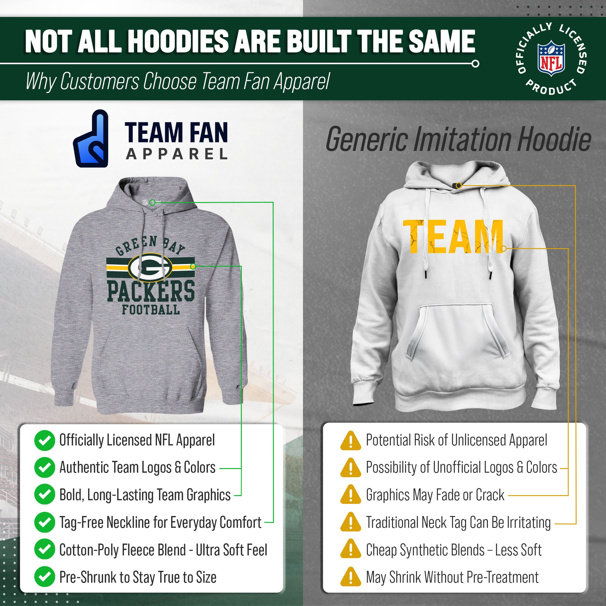 This Green Bay Packers hoodie is made from cotton-poly fleece. Our soft Packers pullover hoodie is beyond comfortable and thick enough to keep you warm on game day. This hoodie is soft enough that you'll want to wear it every day. The tagless pro football sweatshirt hoodie ensures comfortability and avoids neck irritation. The pro football hoodie features official graphics. Our Packers sweatshirts are designed and printed in the USA. These high-quality Packers hoodies are made with stitch density for a smoother printing surface. This Green Bay hoodie gives the sports look only a true fan can accomplish. This is essential apparel for any football or sports fan. This soft hoodie is perfect for watching the game, working out, or for a fathers day gift. It's perfect for Green Bay football games.