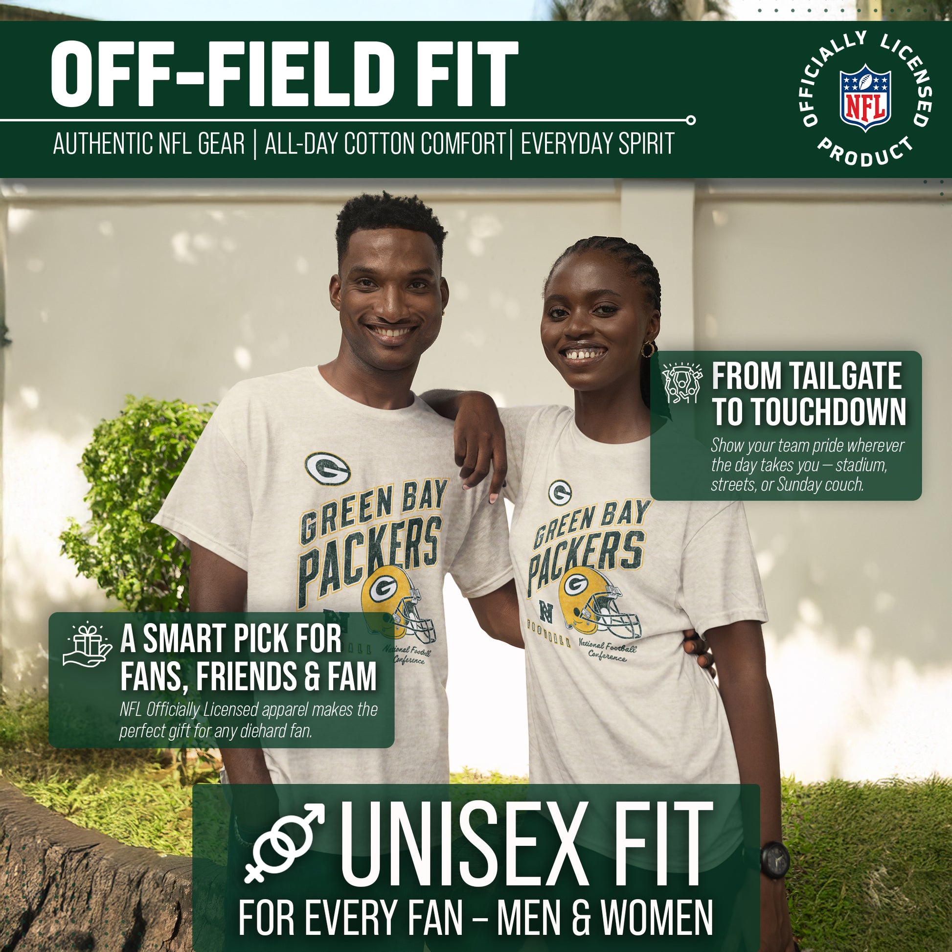 Show off your team spirit in style with our Team Fan Apparel Green Bay Packers NFL Distressed Helmet Tag-Less T-Shirt! Made for both men and women, this unisex t-shirt is the perfect addition to any football fan's wardrobe. With its soft and comfortable cotton blend fabric, you'll love wearing it to games or just lounging at home. The tag-less design ensures maximum comfort without any annoying tags scratching at your neck. Featuring a large vibrant helmet design with the team name printed largely, along with the official team logo, this shirt will make you stand out from the crowd and show off your die-hard fandom. It comes in multiple sizes, so you can choose the one that fits best & represents your team spirit. Whether you're cheering on your Packers at the stadium or watching from home, our NFL Distressed Helmet Tag-Less T-Shirt is a must-have for all fans! So grab yours today and support your team in comfort and style. Go team!