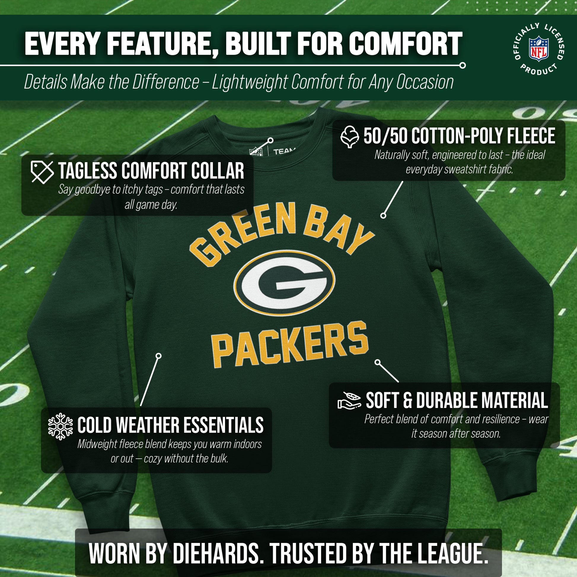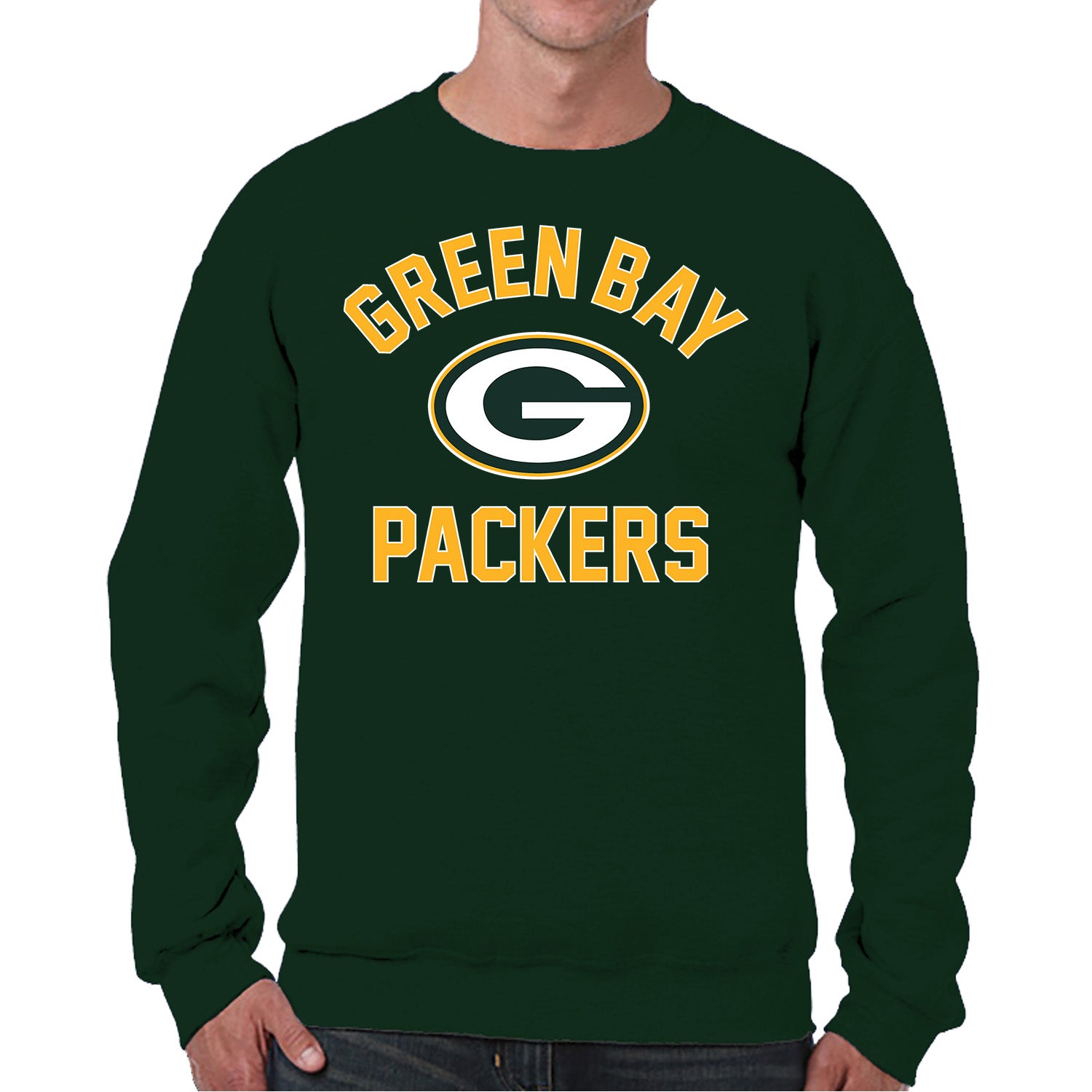This adult Gameday Green Bay Packers football crewneck is the ideal sweatshirt to wear on gameday. Our crewneck sweatshirt is comfortable, runs true to size, and is great for showing team pride all year long! This is the perfect Green Bay sweatshirt for both men and women. Our Green Bay Packers team colored crewneck sweatshirts are the perfect fan apparel for tailgates and sports games. The lightweight crewneck pullover is made of air jet yarn for a softer feel and reduced pilling, which means your crewneck sweatshirt will look new for years to come. You don't have to worry about the Green Bay graphics fading on your crewneck, either. The pullovers are made with thermal printed graphics that are high definition, true team color, and resist fading! This Green Bay sweatshirt is ideal for warm or cold weather, which means you can wear it not only all football season, but all year long! Our pro football crewneck sweatshirt features 1x1 rib with spandex for enhanced stretch and recovery. This Green Bay crewneck sweatshirt has double-needle stitching at shoulders, armholes, neck, waistband, and cuffs. Our comfortable crewneck pullover is made from a cotton poly fleece blend. This tagless sweatshirt ensures the most comfortable fit for men and women. The classic fit of this sweatshirt makes this Green Bay Packers crewneck that perfect pullover for Green Bay men and women fans. Our pro Green Bay Packers pullover sweatshirts for men and women make the best Green Bay gift. Green Bay Packers apparel is the perfect birthday gift for any football fan. This Green Bay Packers football crewneck sweatshirt is perfect for tailgating, stadium fun, or watching the game at home.