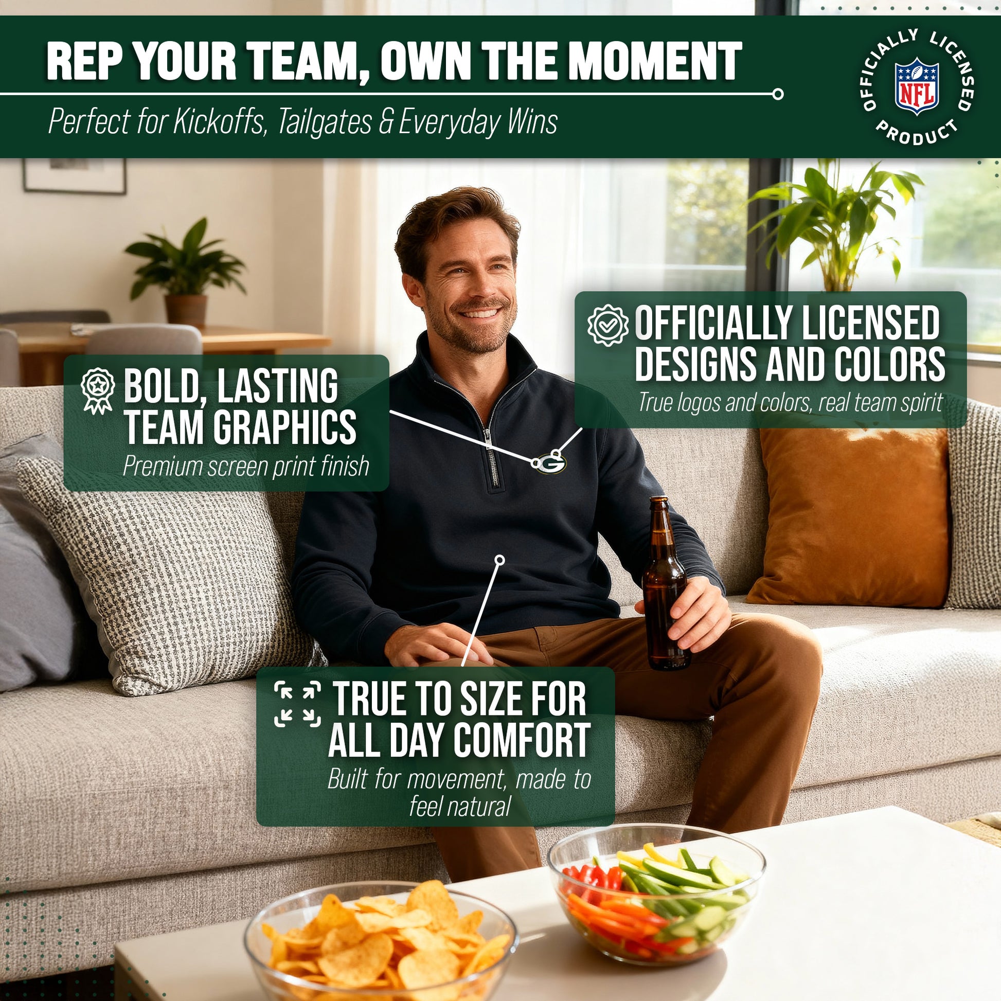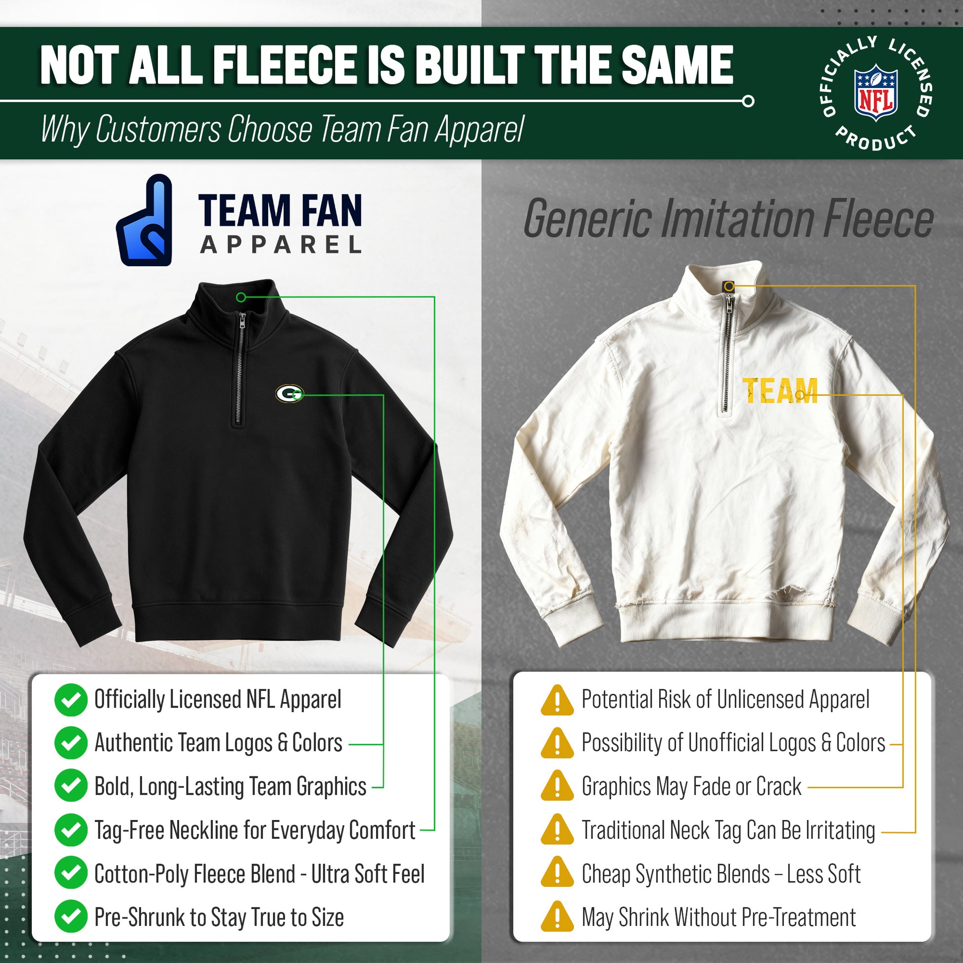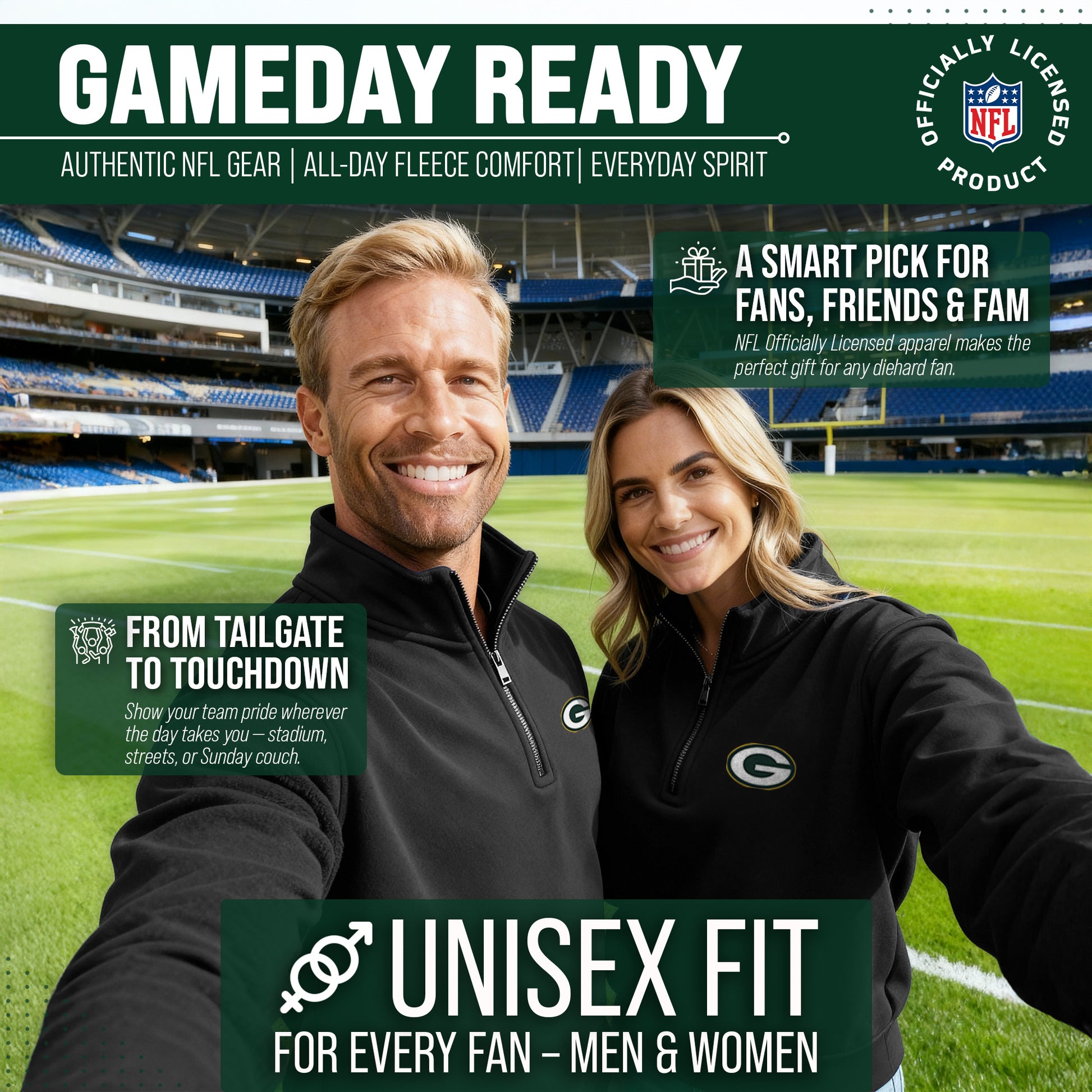 Show off your Green Bay Packers pride with the officially licensed NFL Team Logo 1/4 Zip Fleece Pullover Sweatshirt! Designed with fans in mind, this cozy and stylish pullover is the perfect way to represent your favorite team all season long. Crafted with ultra-soft fleece fabric, it delivers warmth and comfort whether you’re braving chilly stadium seats, tailgating with friends, or simply cheering on the Packers from home. The classic quarter-zip design adds versatile style and makes layering easy, so you can throw it on over a tee or under a jacket as the temperature drops. With the authentic Green Bay Packers logo proudly displayed on the front left chest, your loyalty will be clear to everyone around you. No matter where game day takes you, this pullover is a statement piece that showcases true Packers spirit. Made for both men and women, this sweatshirt features a flattering unisex fit that looks great on all body types. It’s available in a full range of sizes to ensure every Packers fan finds the right fit. Whether you’re hunting for your next go-to tailgate outfit, upgrading your cold-weather game-day look, or shopping for the perfect gift for a fellow football fan, this 1/4 zip fleece is an unbeatable choice. Durable, versatile, and stylish, the Green Bay Packers 1/4 Zip Fleece Pullover Sweatshirt is a must-have addition to any fan’s wardrobe. From Sunday kickoffs to casual everyday wear, you’ll stay warm, comfortable, and proud to rep the Packers every time you put it on. Don’t miss your chance to gear up—this essential fan favorite is ready to help you cheer on your team in style!