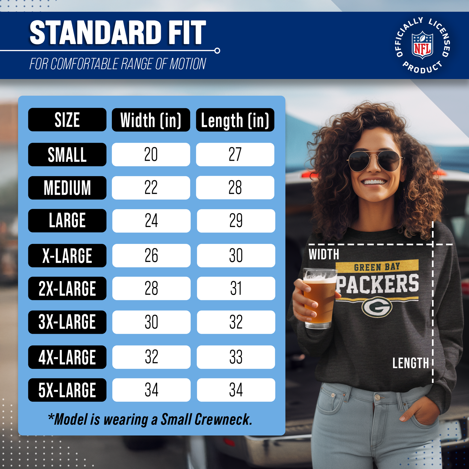 Our charcoal crew neck is a Green Bay crewneck sweatshirt with a warm and toasty 9 oz fleece lining. It's the very best of Green Bay Packers apparel, plain and simple. Gear up for your cold weather football game with confidence. Or, for women, bring it with you to games and tie it around your leggings in case the arena is a little chilly. Our football crew neck sweatshirts for men and women are super comfortable, run true to size, and are great for showing your team pride all year long. Plus, the unisex fit is ideal for both men and women and works as an oversized sweatshirt for kids. [Team_long] sweater for men and women features your teems thermal-printed emblem wordmark will stay crisp and clear, wear after wear. All colors and fonts are officially licensed and are of the highest of quality, it even comes with an officially licensed tag. Features: ribbed cuffs and waistband. This football sweatshirts crew in particular is perfect for tailgates, games, and showing off your team spirit. Gameday crewneck [team_ long] sweatshirts make a great birthday, Christmas (or any other holiday), or graduation gift for a sports fan. Gameday charcoal crewneck is essential apparel for protecting yourself and your loved ones from the elements. The fleece material will keep you warm through the colder months, and the pullover design allows you to feel embraced like a big oversized blanket. The Green Bay Packers charcoal crew necks are pre-shrunk and are made from a dual blend of 50% cotton and 50% polyester that is ideal for that tailgate or game day when the temperature drops. Pair with your other favorite Green Bay game day apparel! Say goodbye to cheap sweatshirts. Our charcoal sweatshirts for women and men help you gear up and get ready to cheer your team to victory.