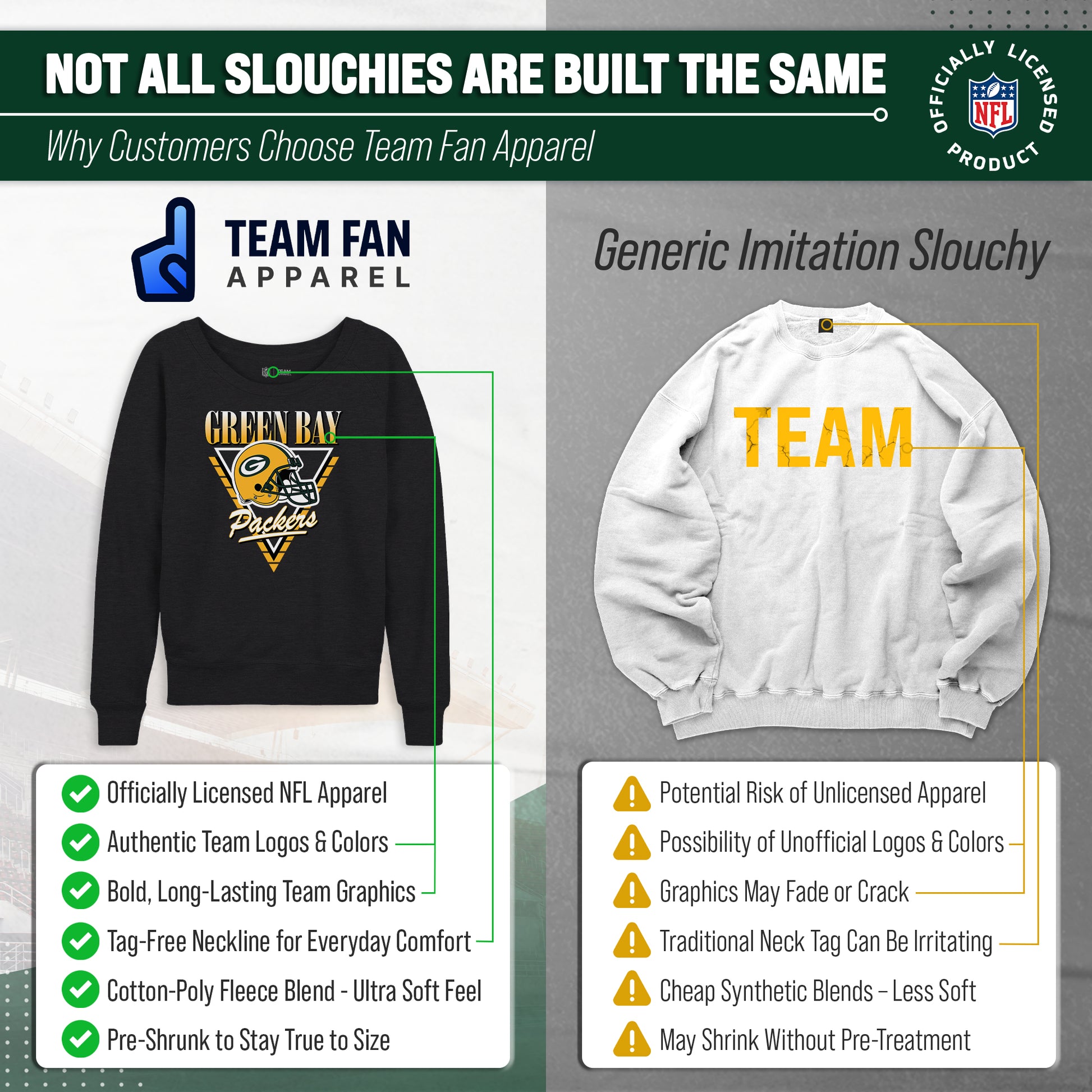 Hey there, fellow lady football fans! Show off your team pride in style with our Team Fan Apparel Green Bay Packers NFL Women's Retro Triangle Slouchy Crewneck Fleece Pullover. Made with extra soft cotton polyester fleece material, this long sleeve pullover sweatshirt will keep you warm and cozy on game day or any chilly day. With a tagless design, you won't have to worry about any annoying tags distracting you from cheering on your team. Featuring a retro triangle design and relaxed fit, this pullover adds a touch of fashion to your game day wardrobe. Available in a range of women's sizes, it's the perfect addition to any fan's closet. Whether you're headed to the stadium or watching from home, stay cool and stylish with this must-have piece of Packers apparel. Don't let snow or cold weather dampen your team spirit - grab one for yourself or as a gift for the ultimate football-loving lady in your life! Go Packers!